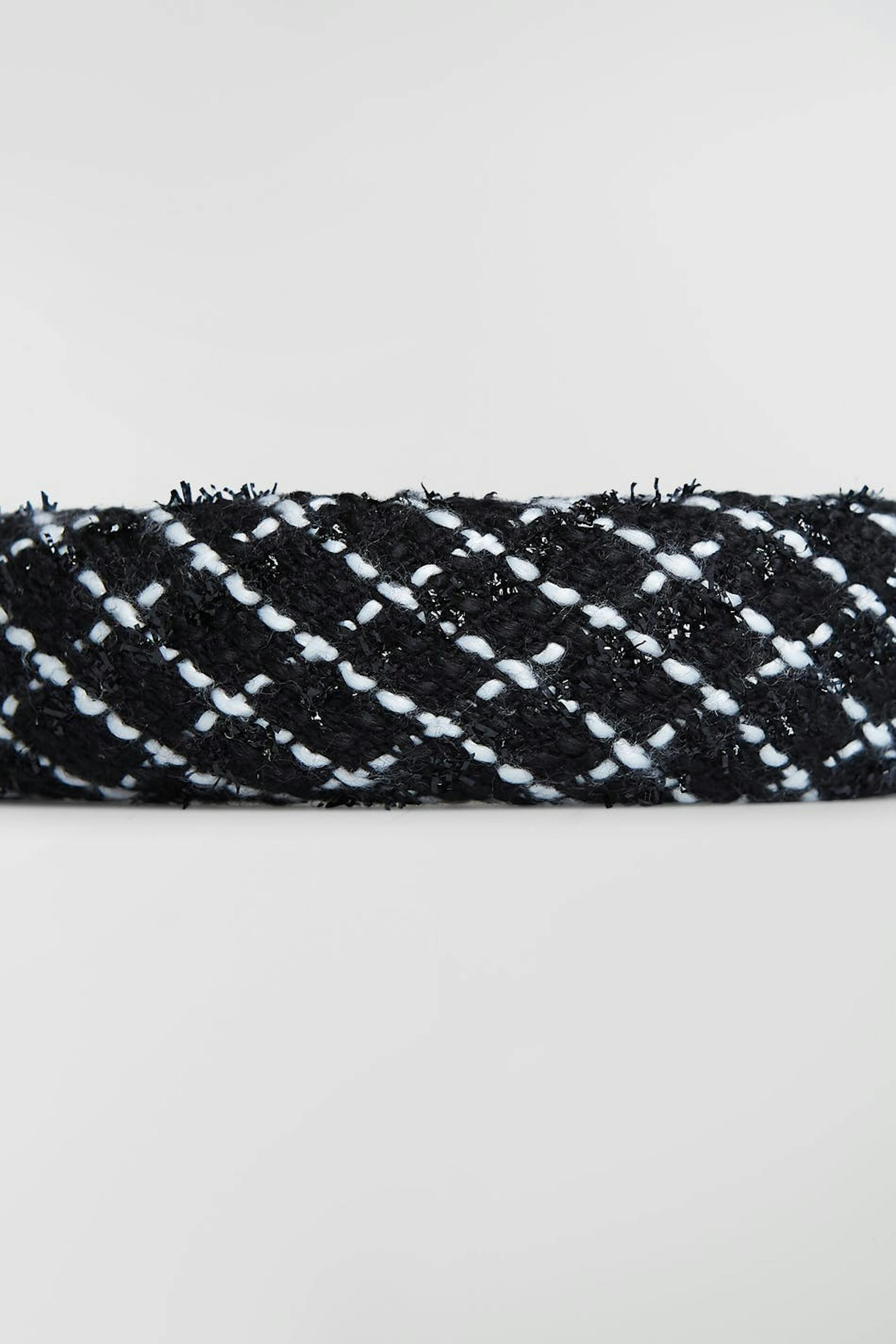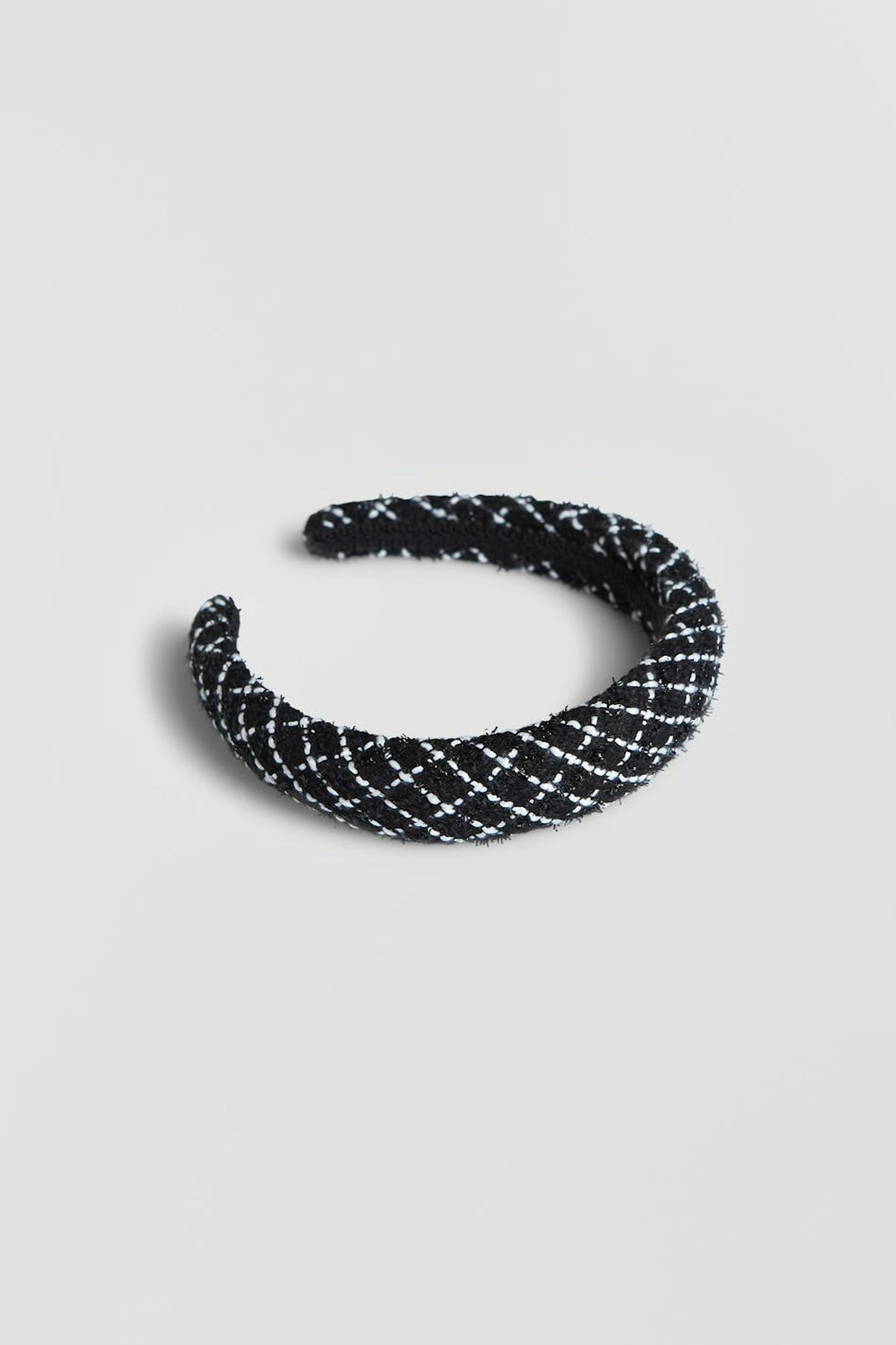 Checked Alice band. The Alice band is black and white. It is made of tweed.