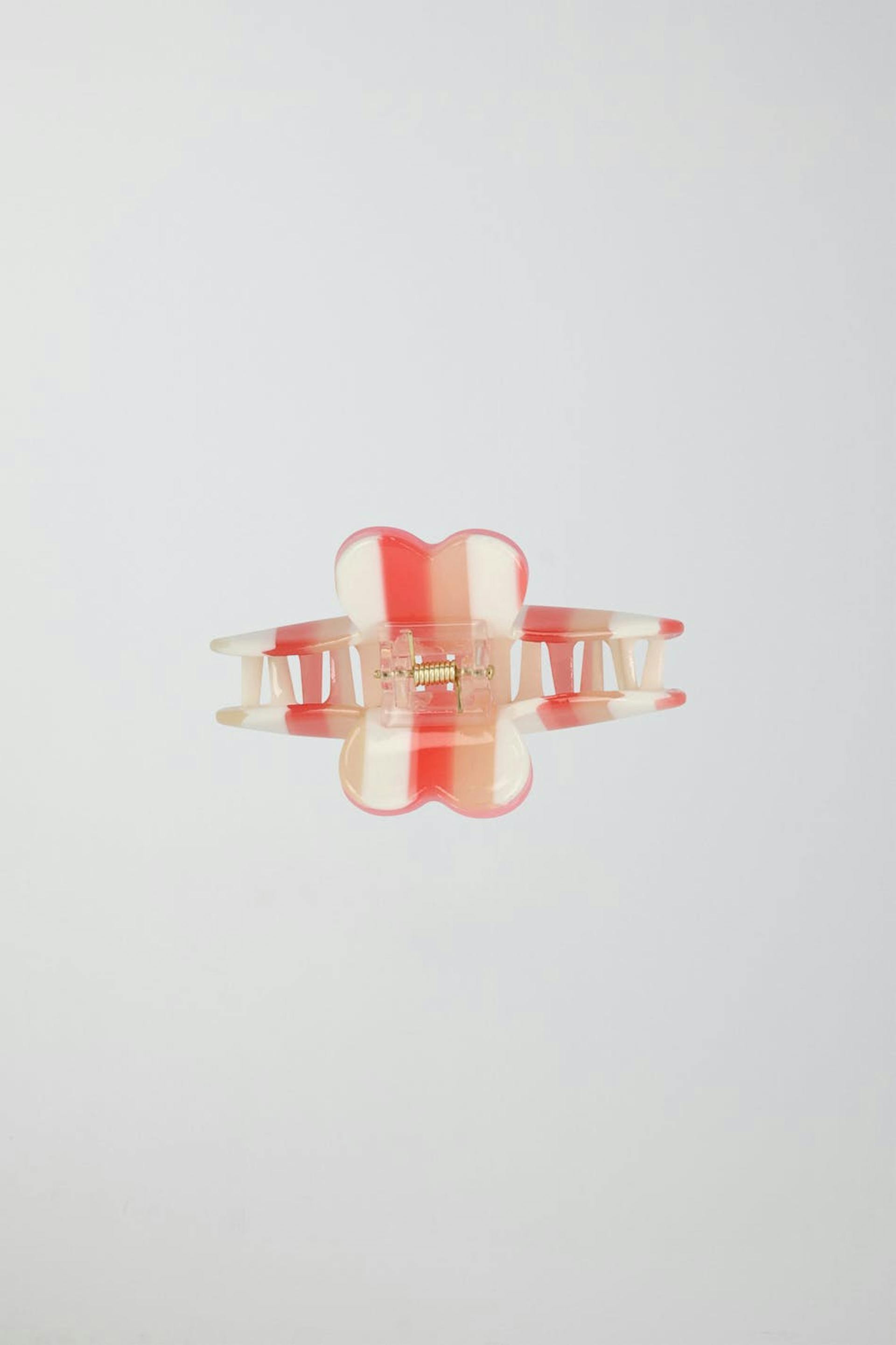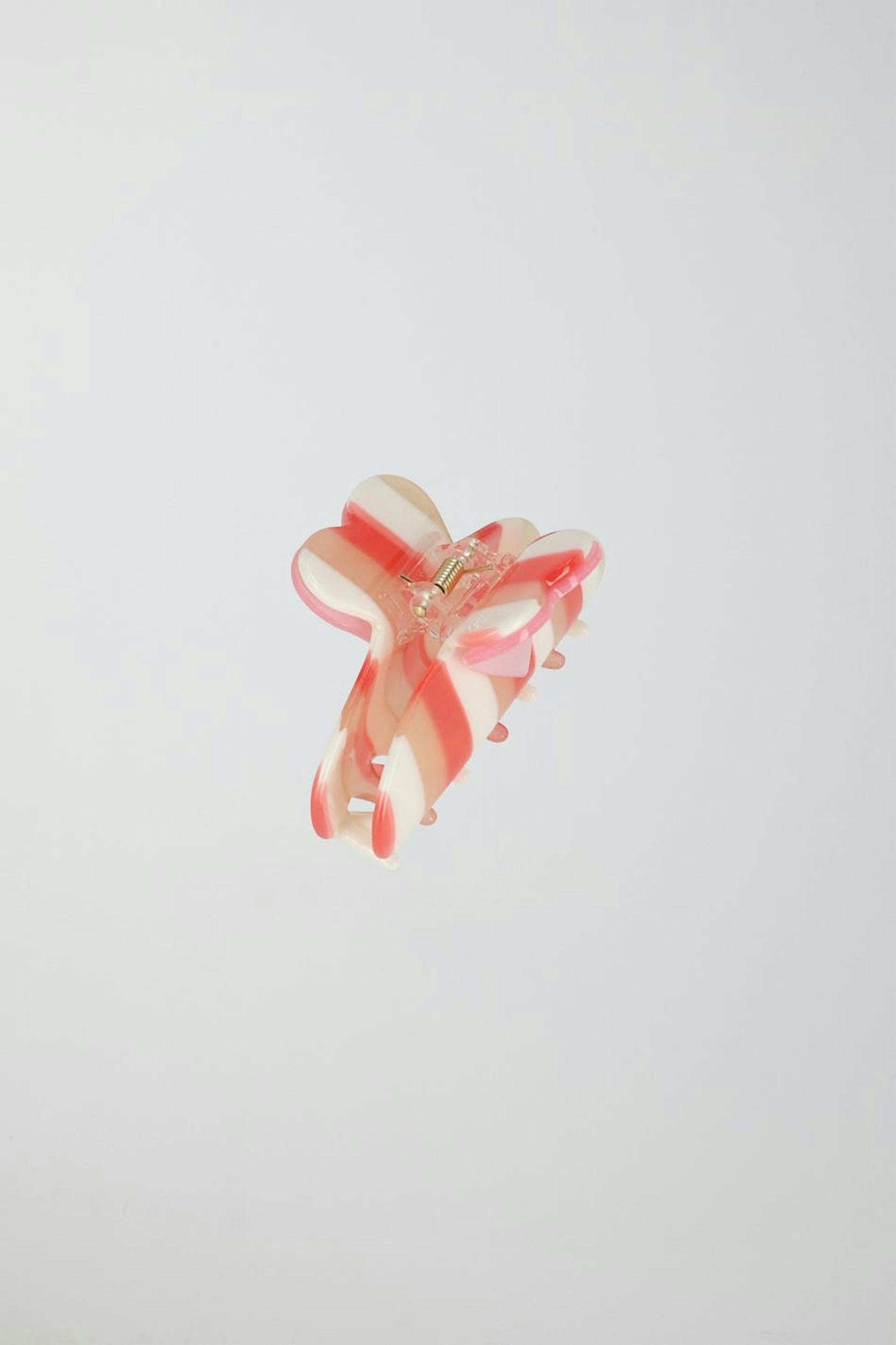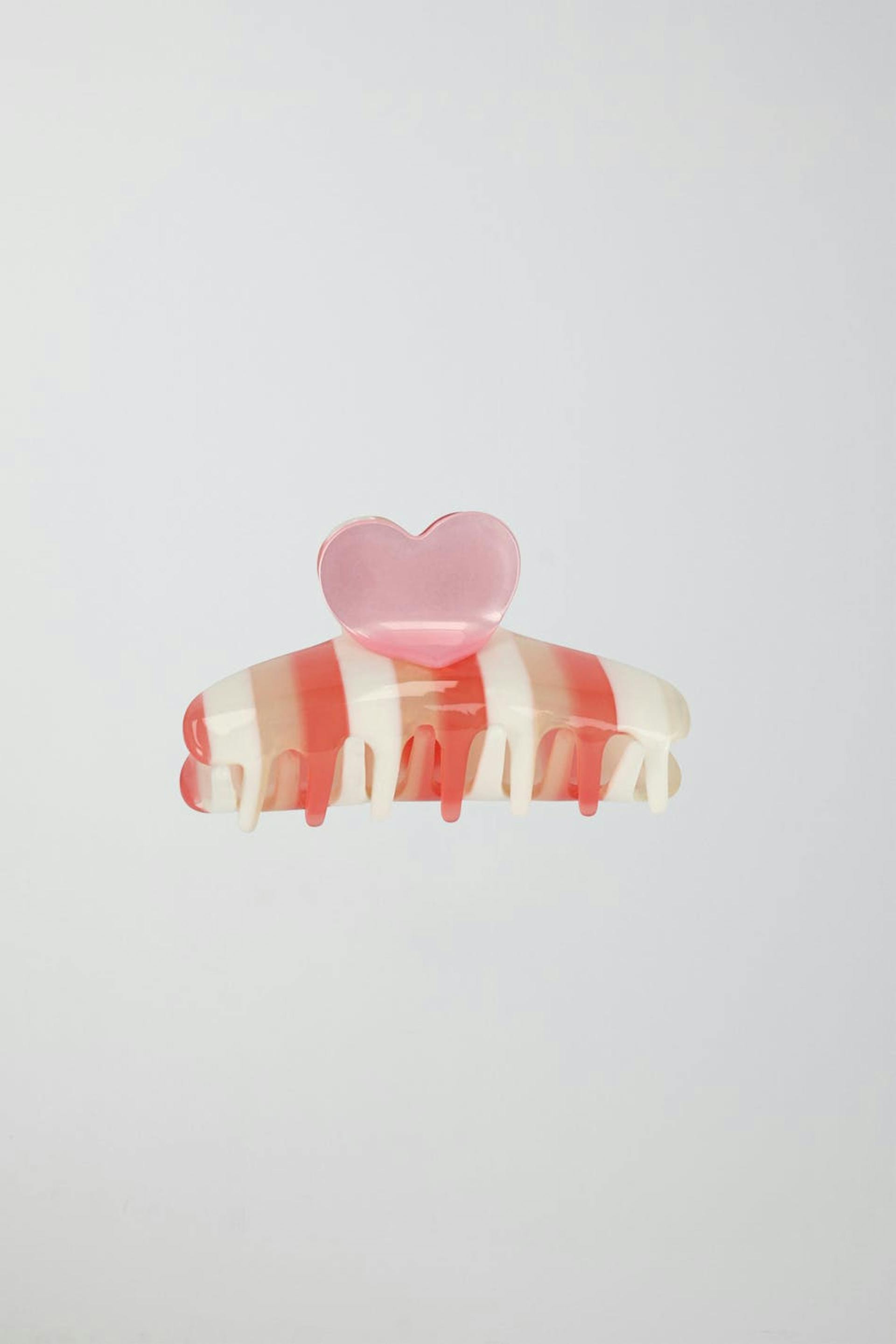Striped hair clip in plastic with heart-shaped design. The hair clip is pink and white.