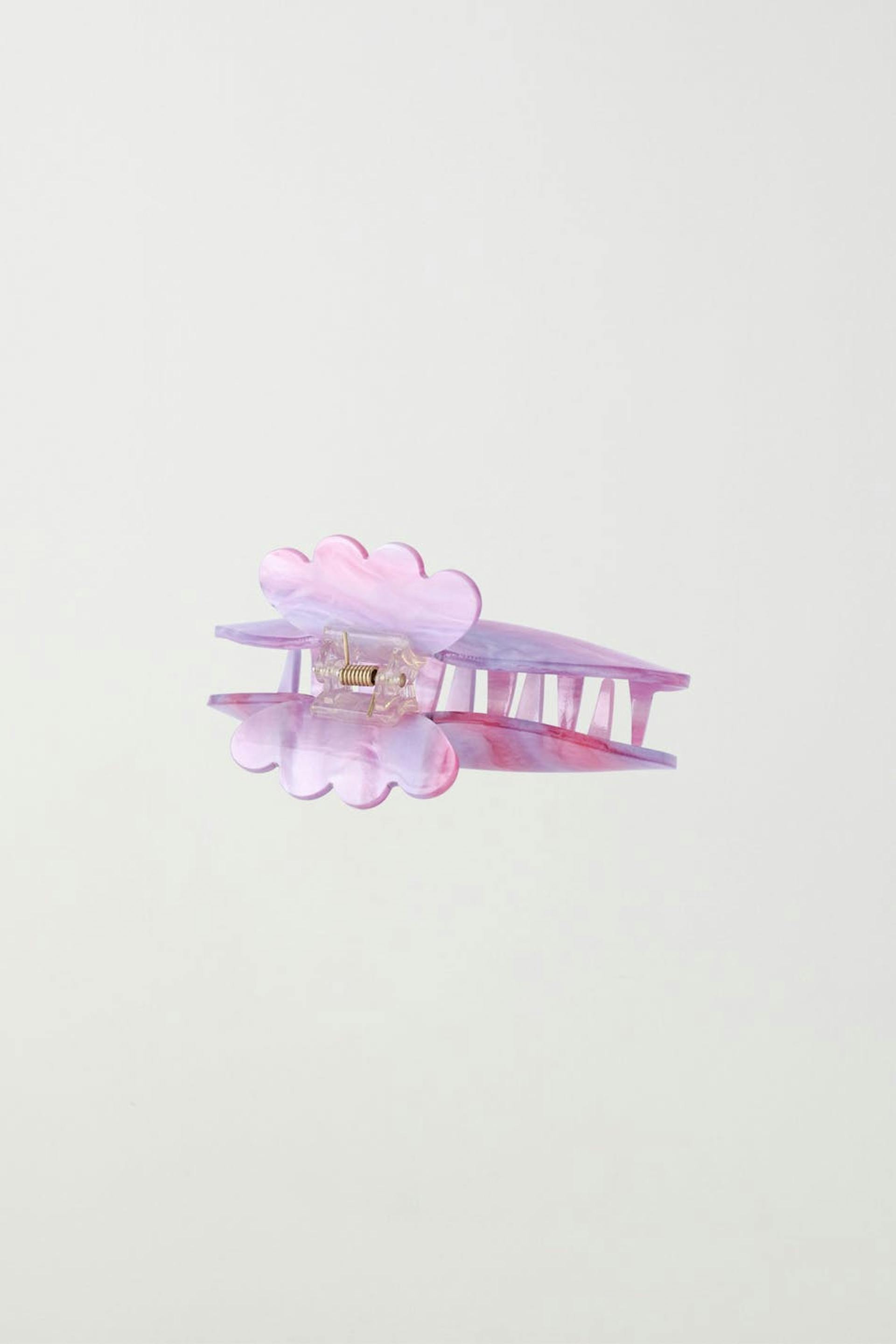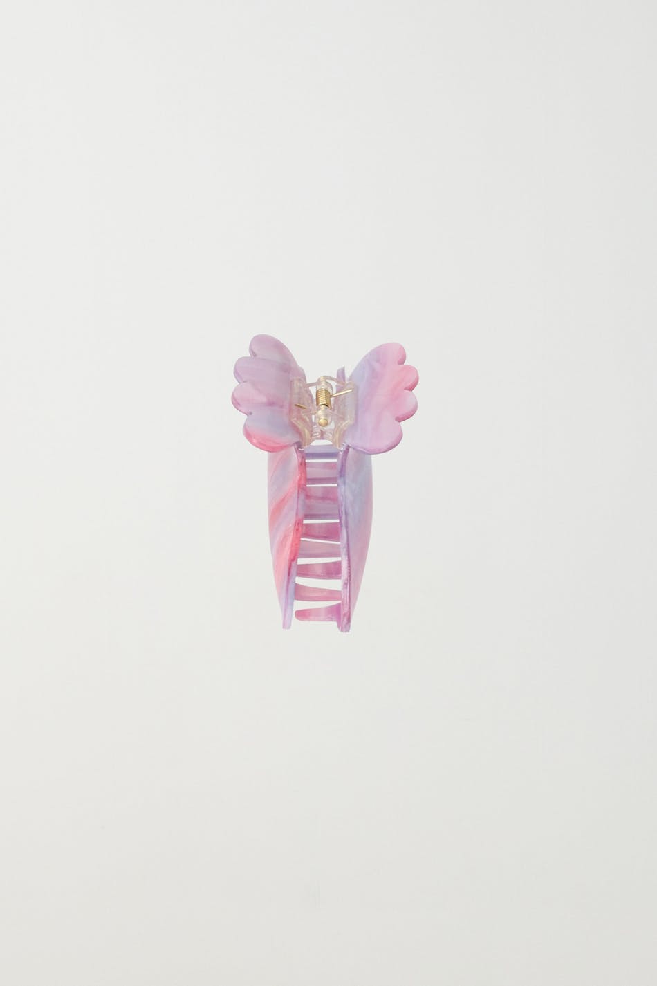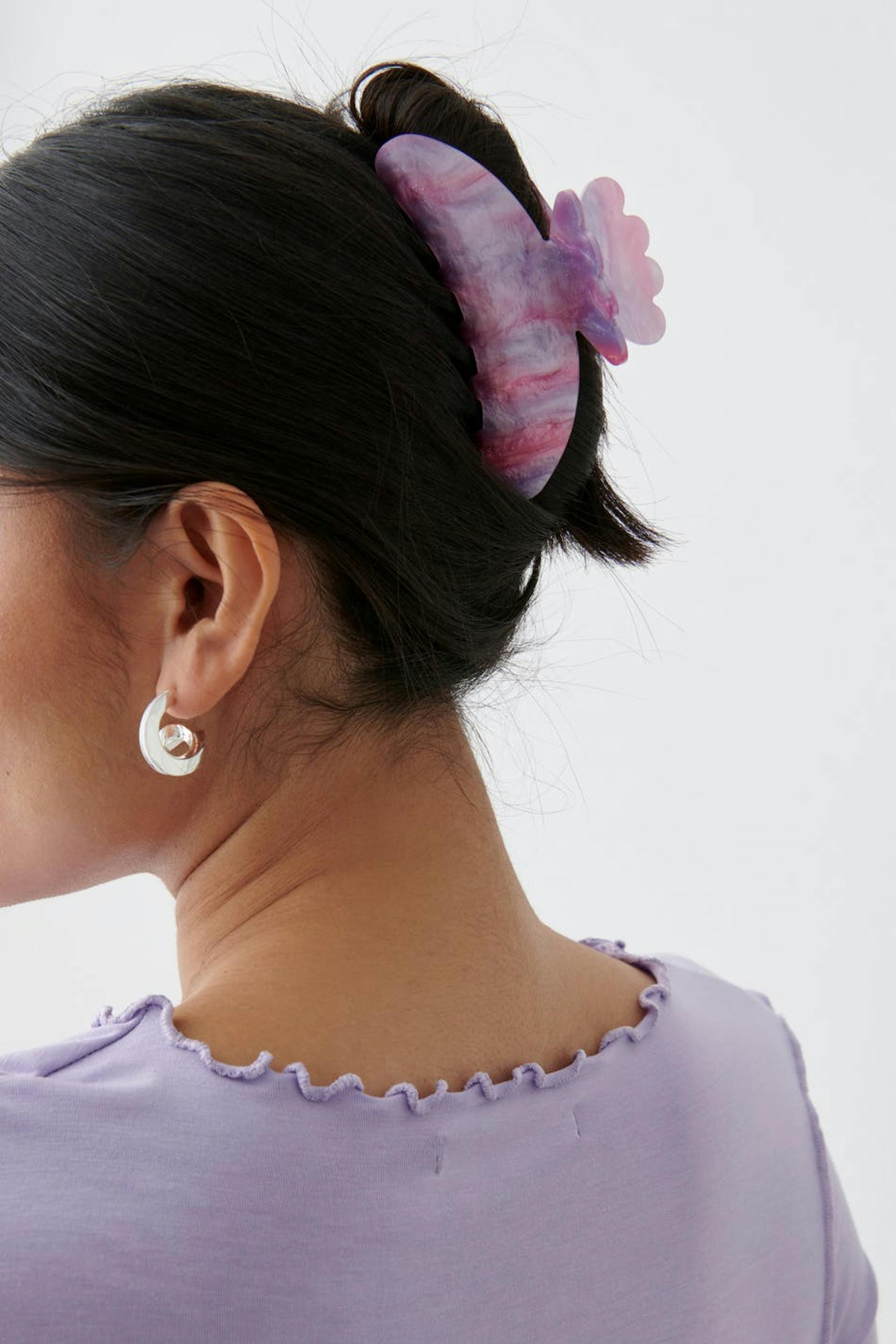 Hair claw in plastic with a shimmering, space inspired pattern. The hairclip is pink.