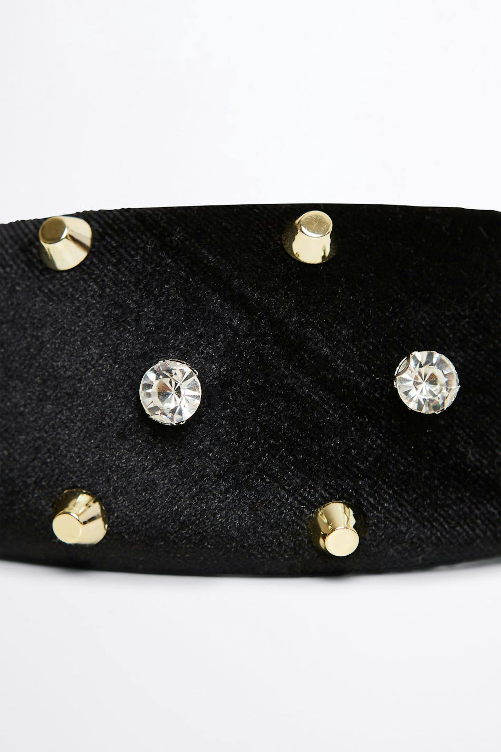 Big Alice band with gold coloured studs. The Alice band is black and has rhinestone. It is made of velvet.