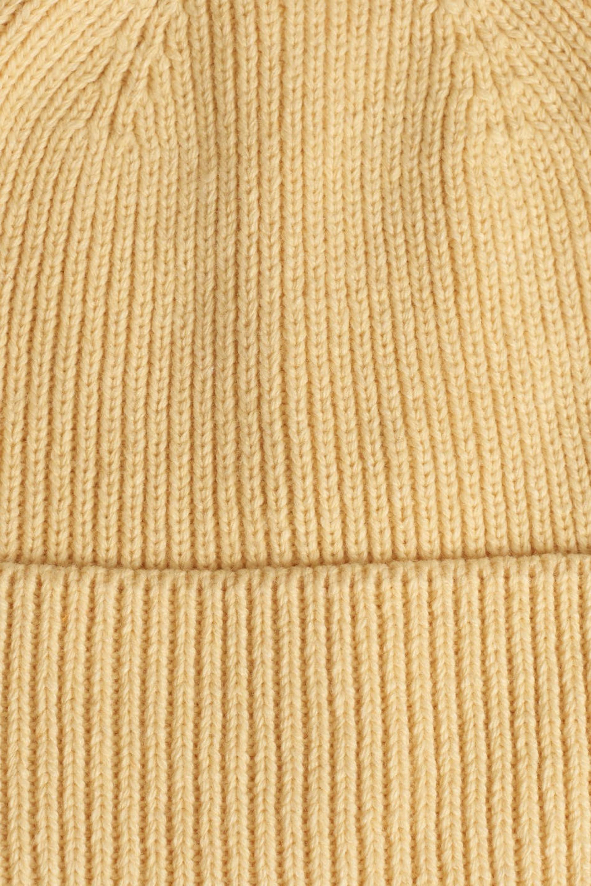 Rib-knit beanie with turn-up. The beanie is yellow.