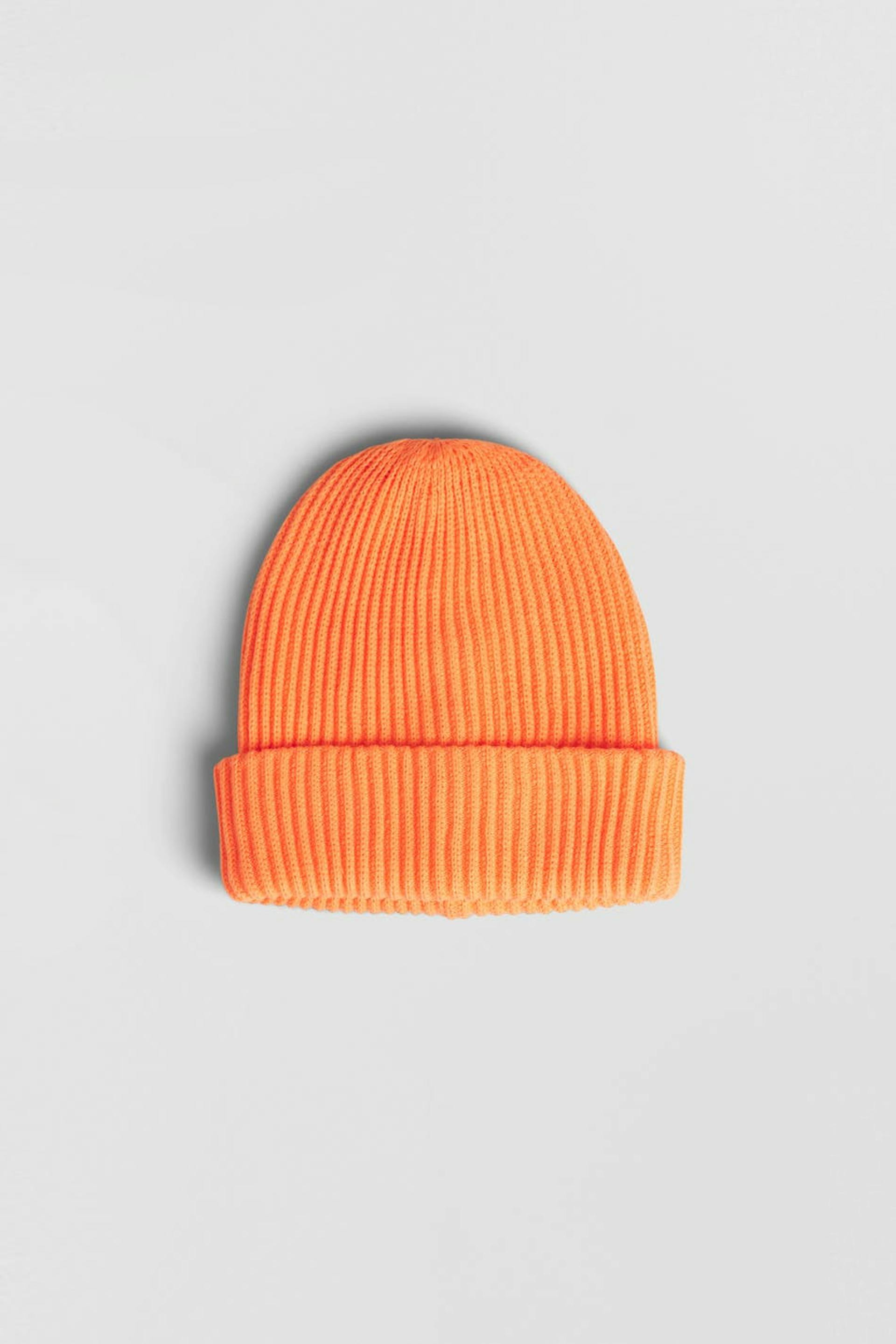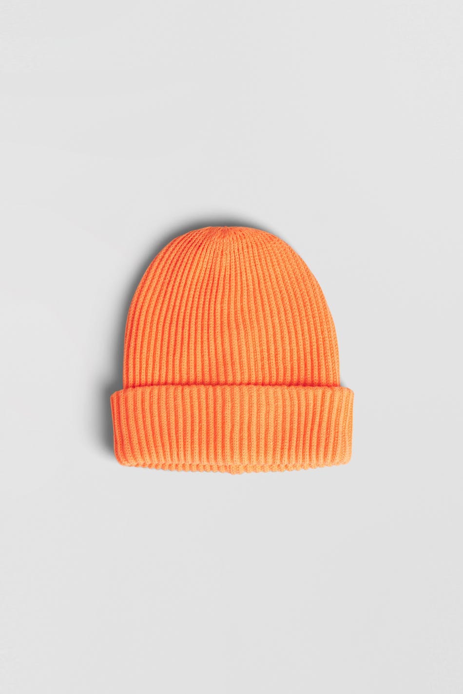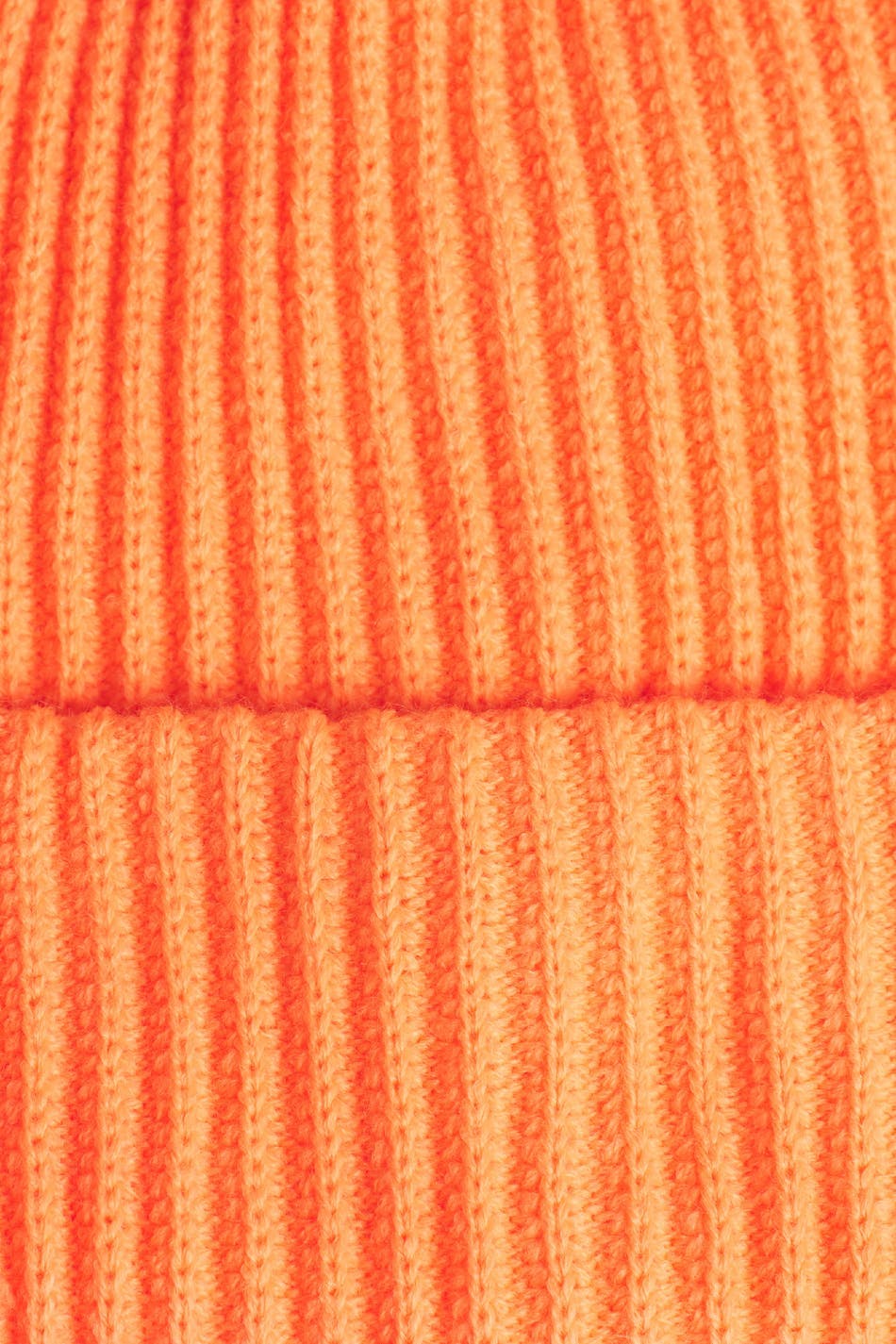 Knitted beanie with a folded edge. The beanie is neon orange.