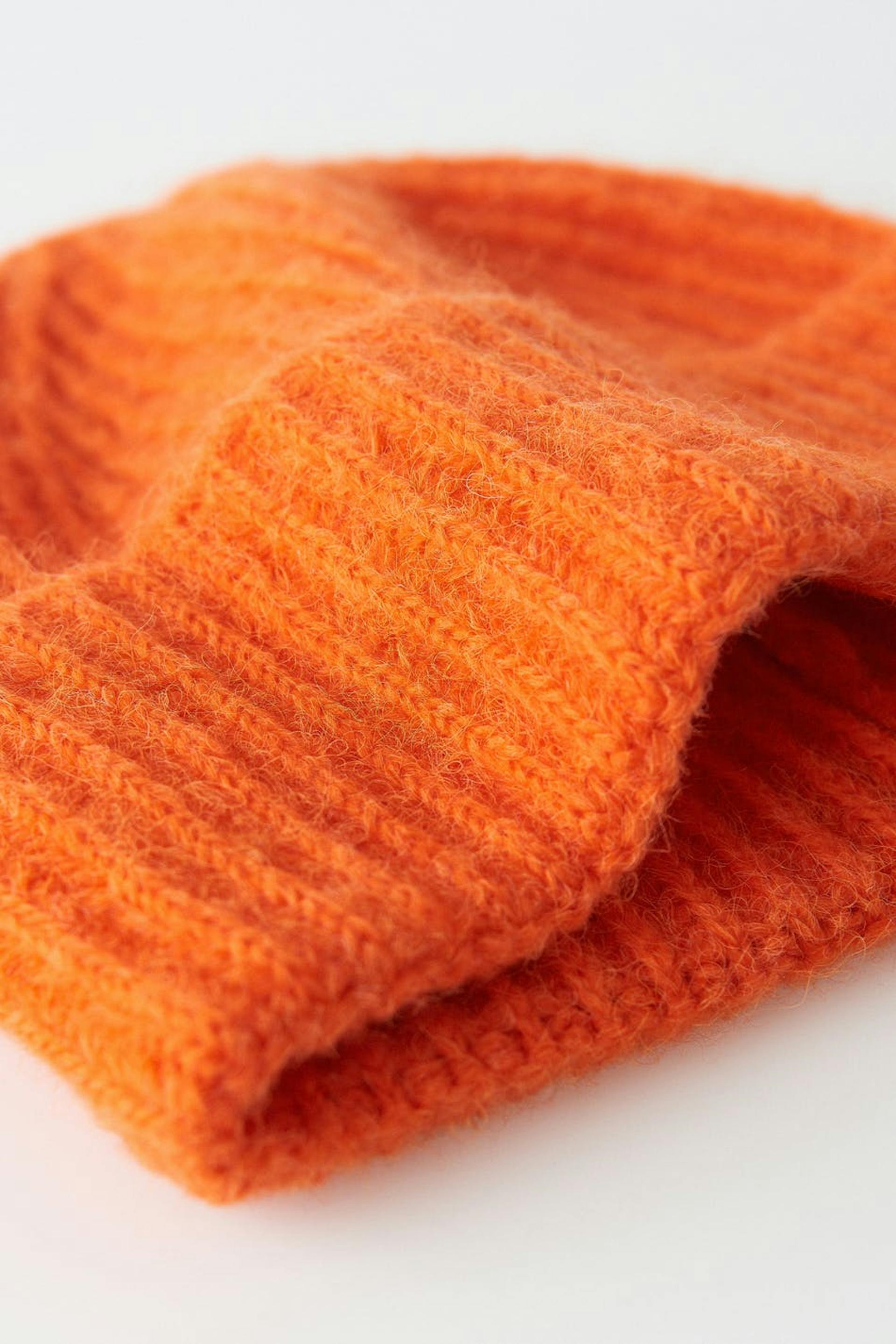 Rib-knit beanie with fold up edge. The beanie is orange.