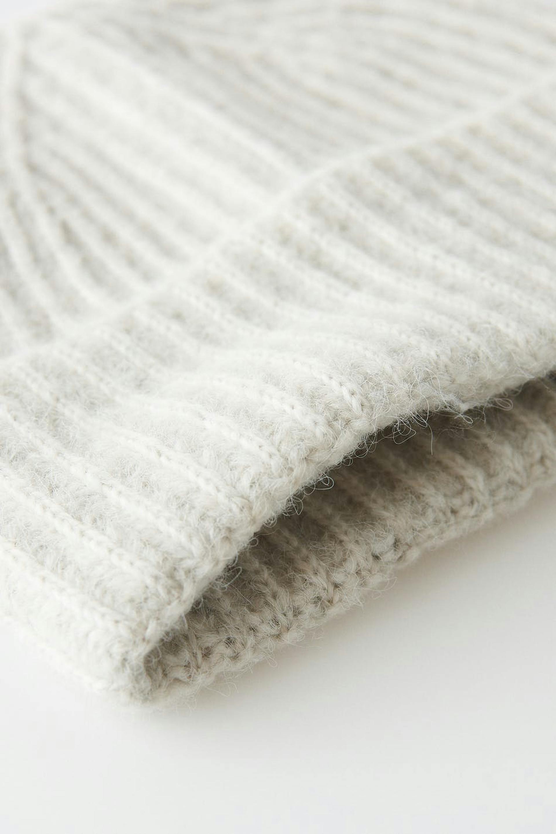 Rib-knit beanie with fold up edge. The beanie is grey.