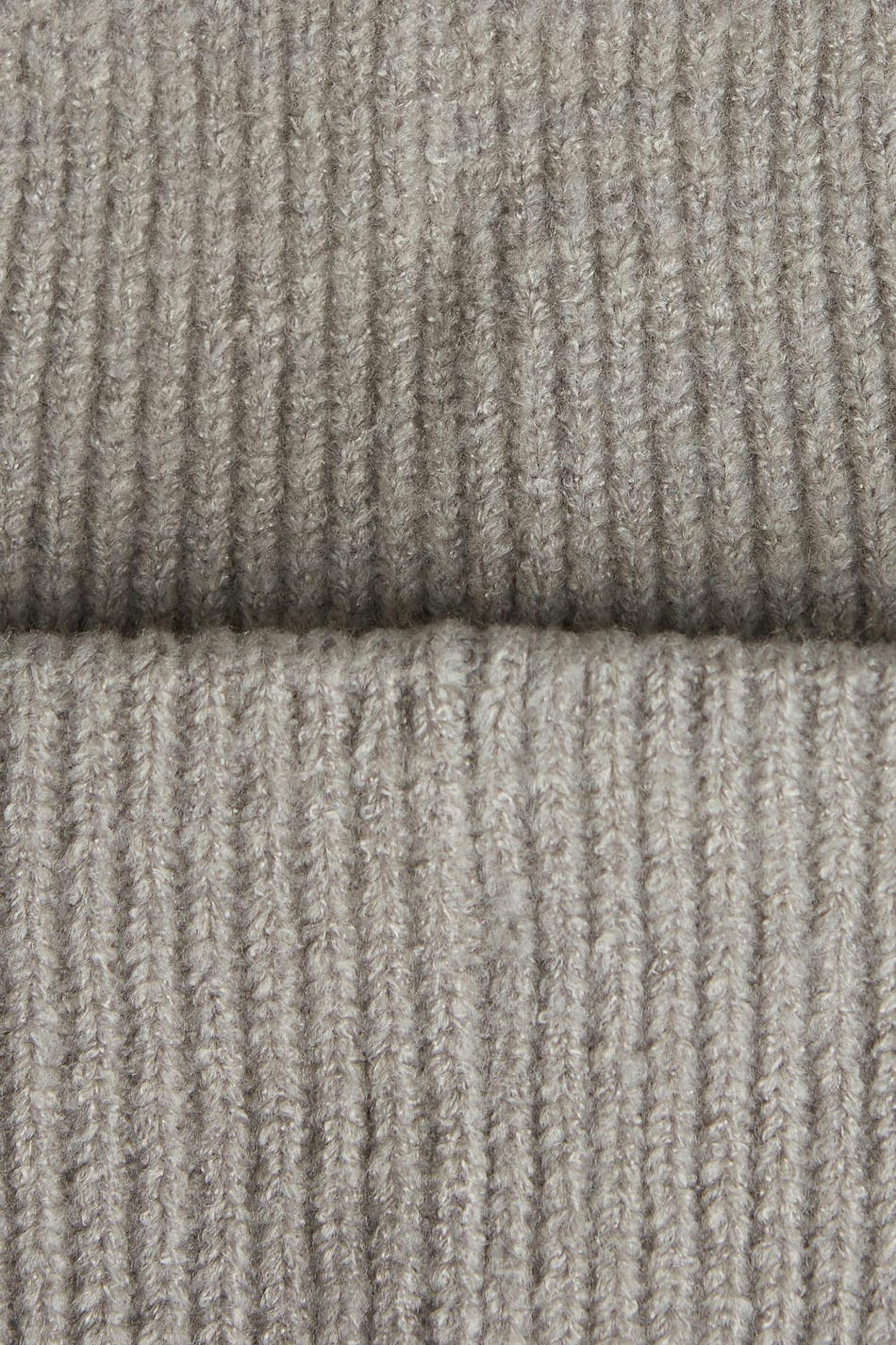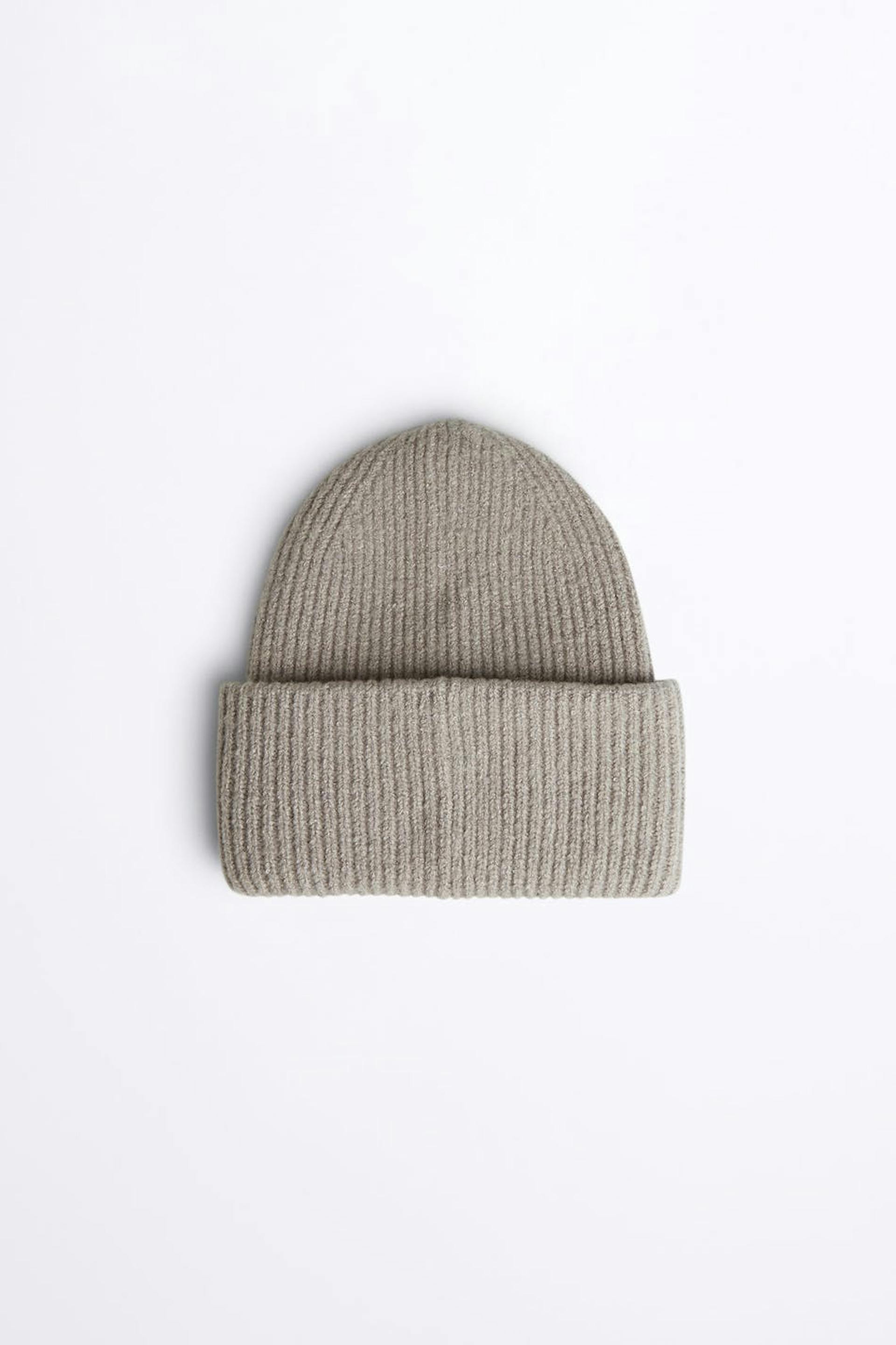 Rib-knit beanie with a folded rim. The beanie is grey.