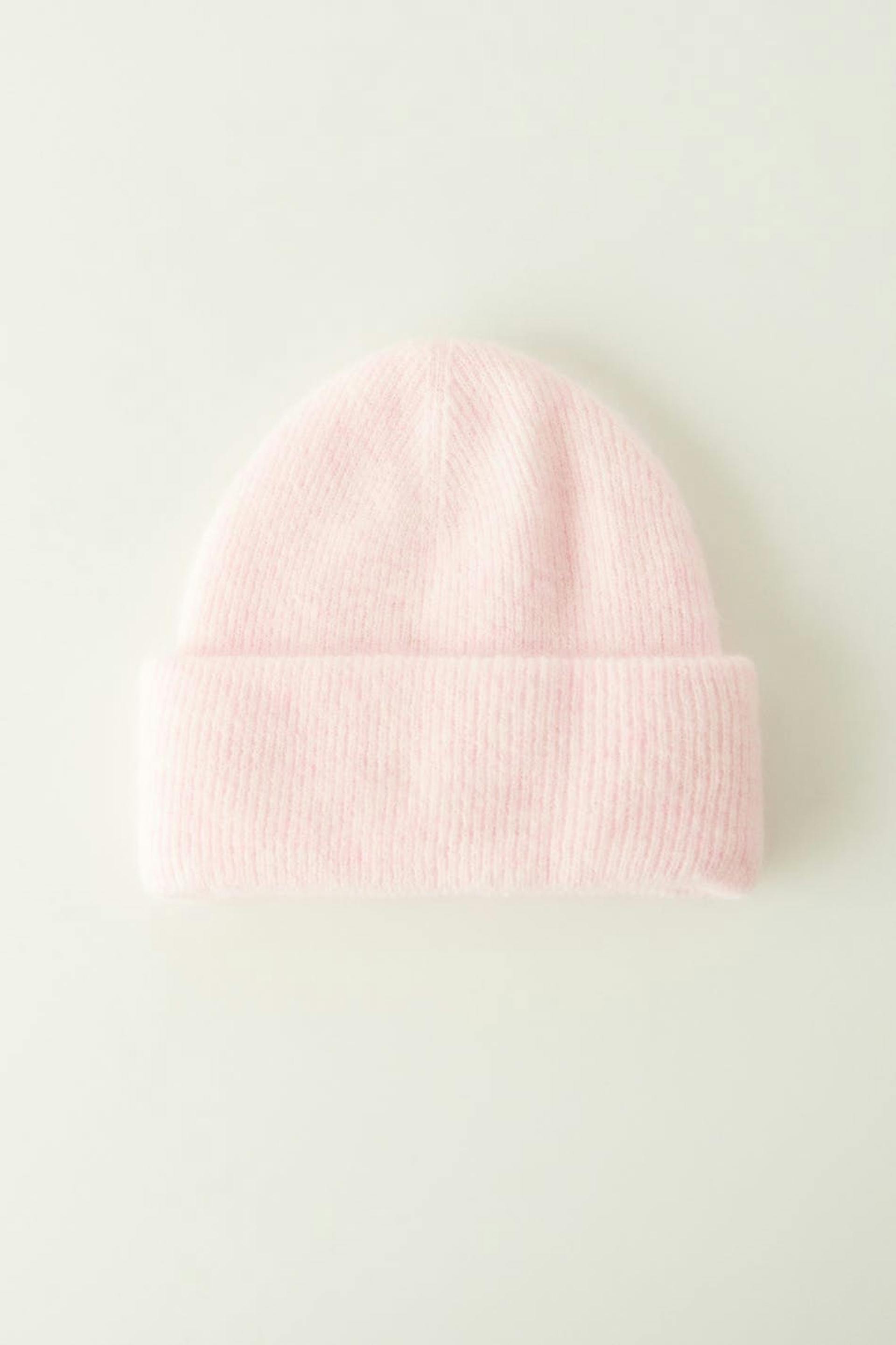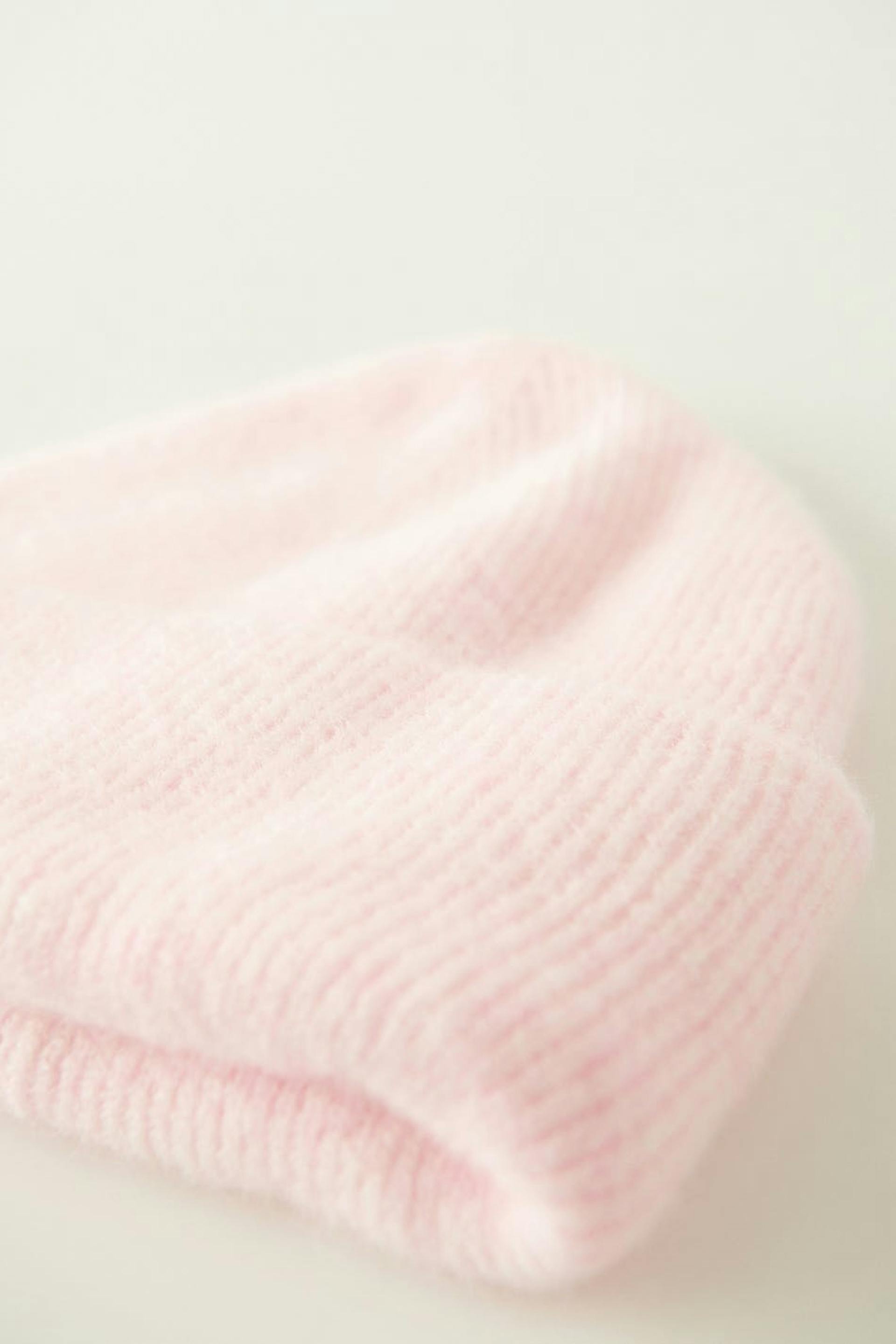 Soft knit beanie with fold-up hem. The beanie is pink.
