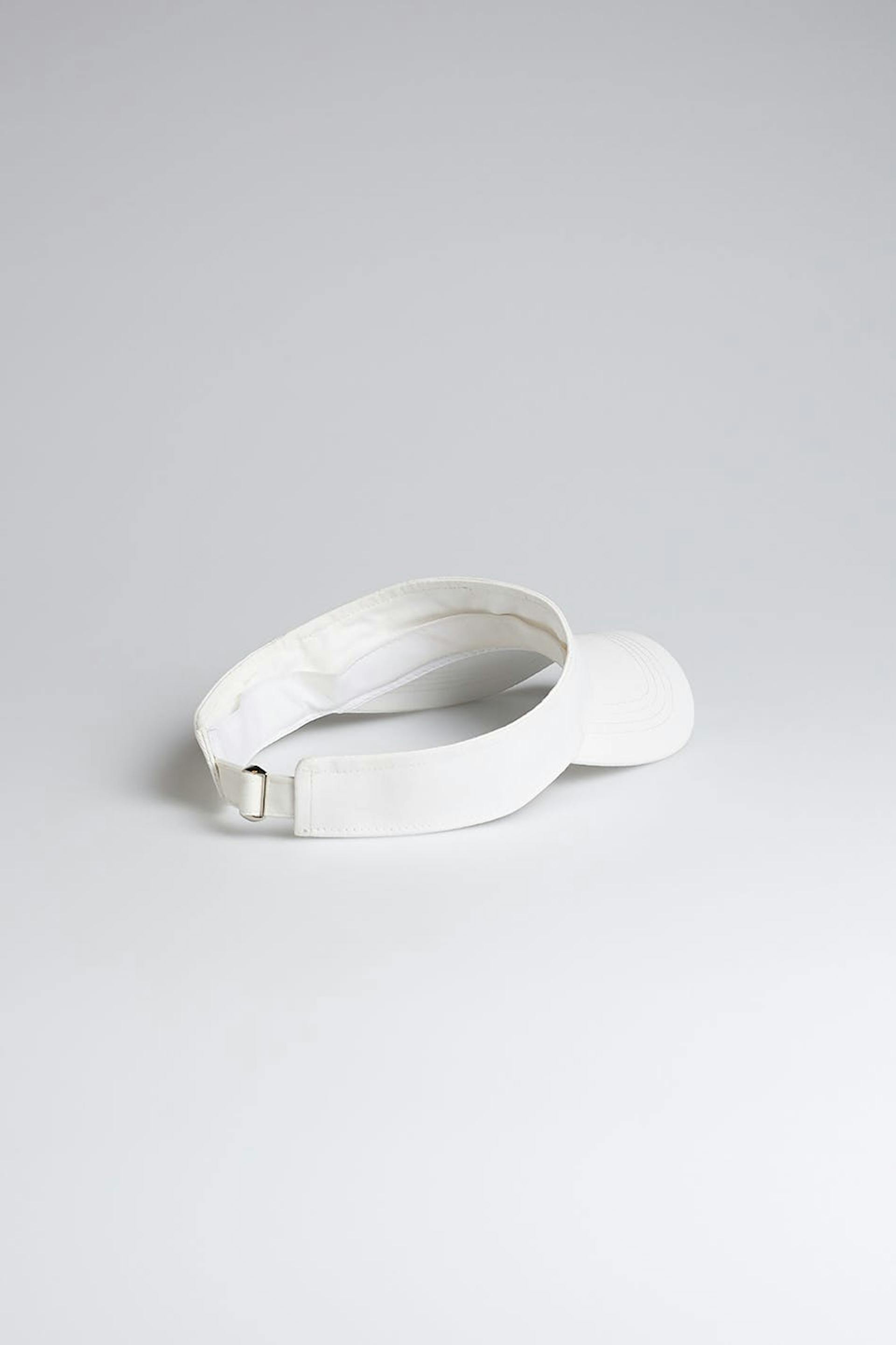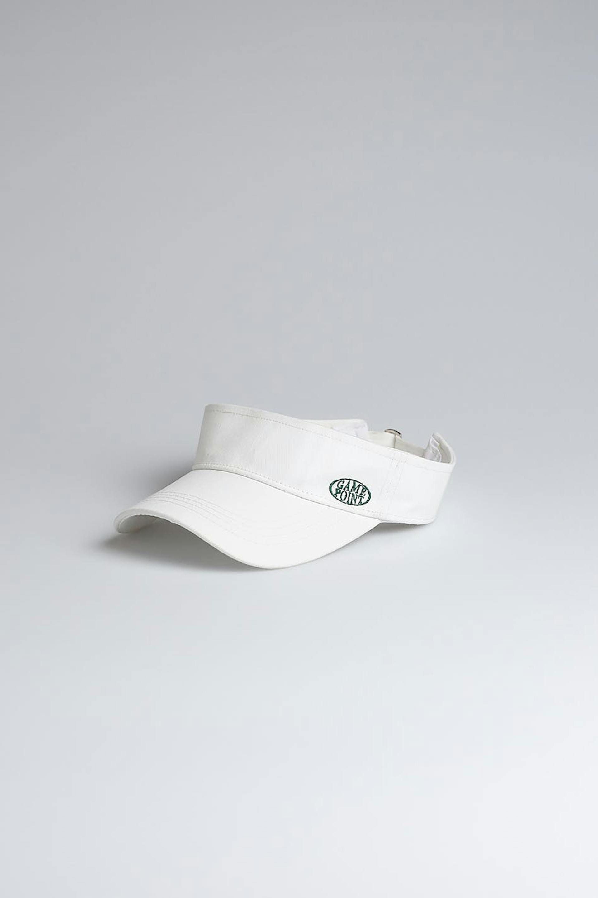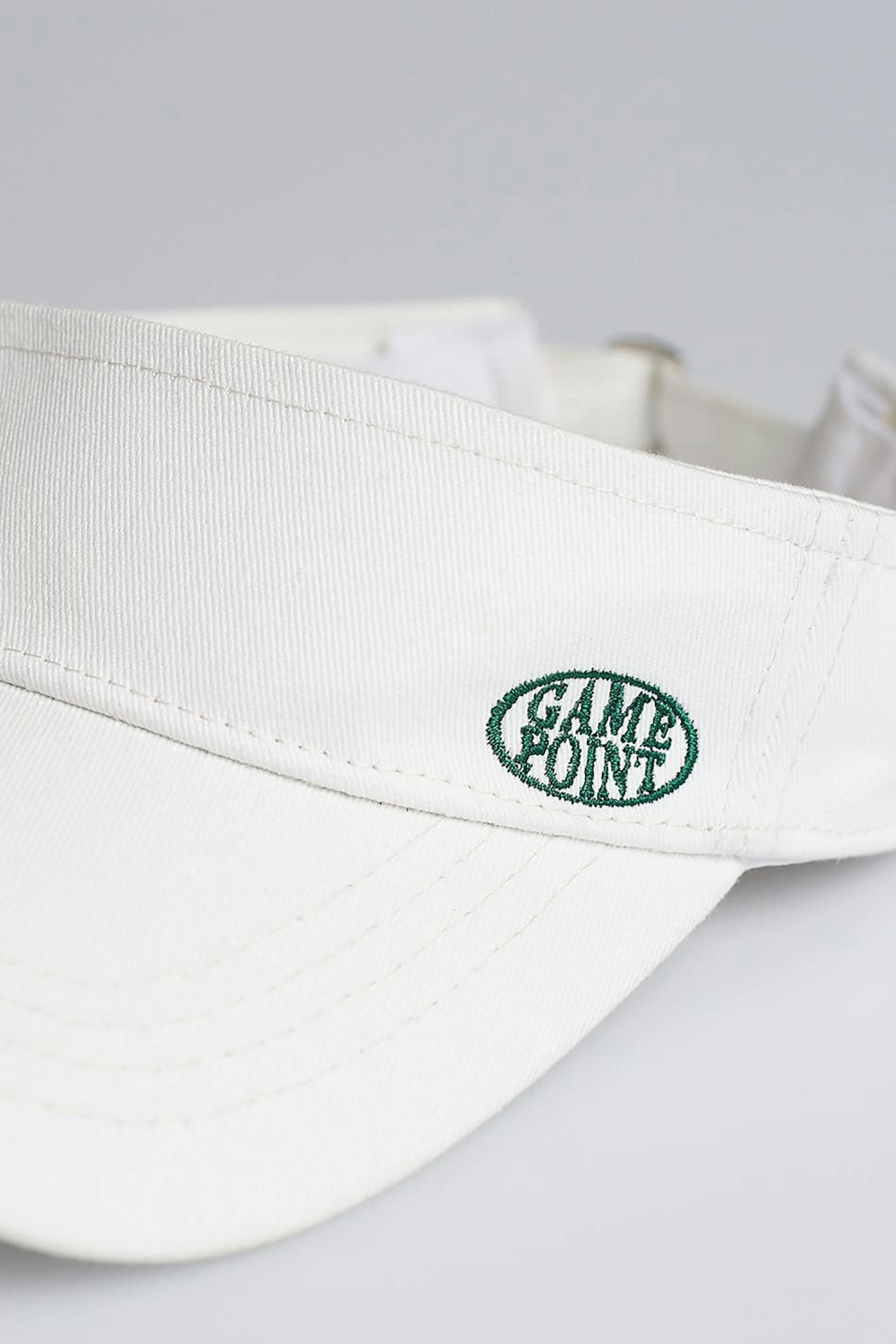 Trendy sun shield with sporty, green embroidery on the front. The sun shield is white and has a tennis-style. It has an adjustable strap at the back.