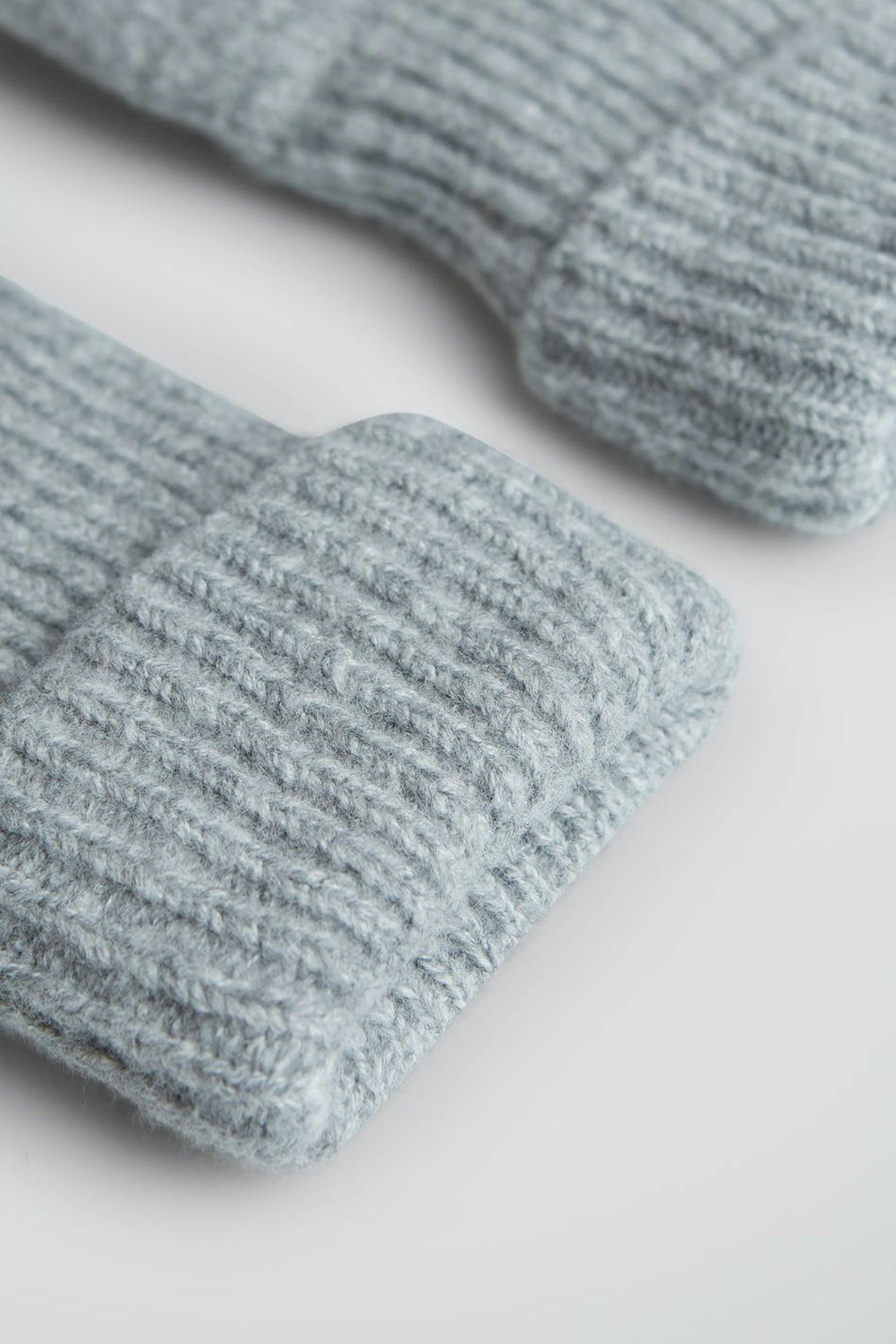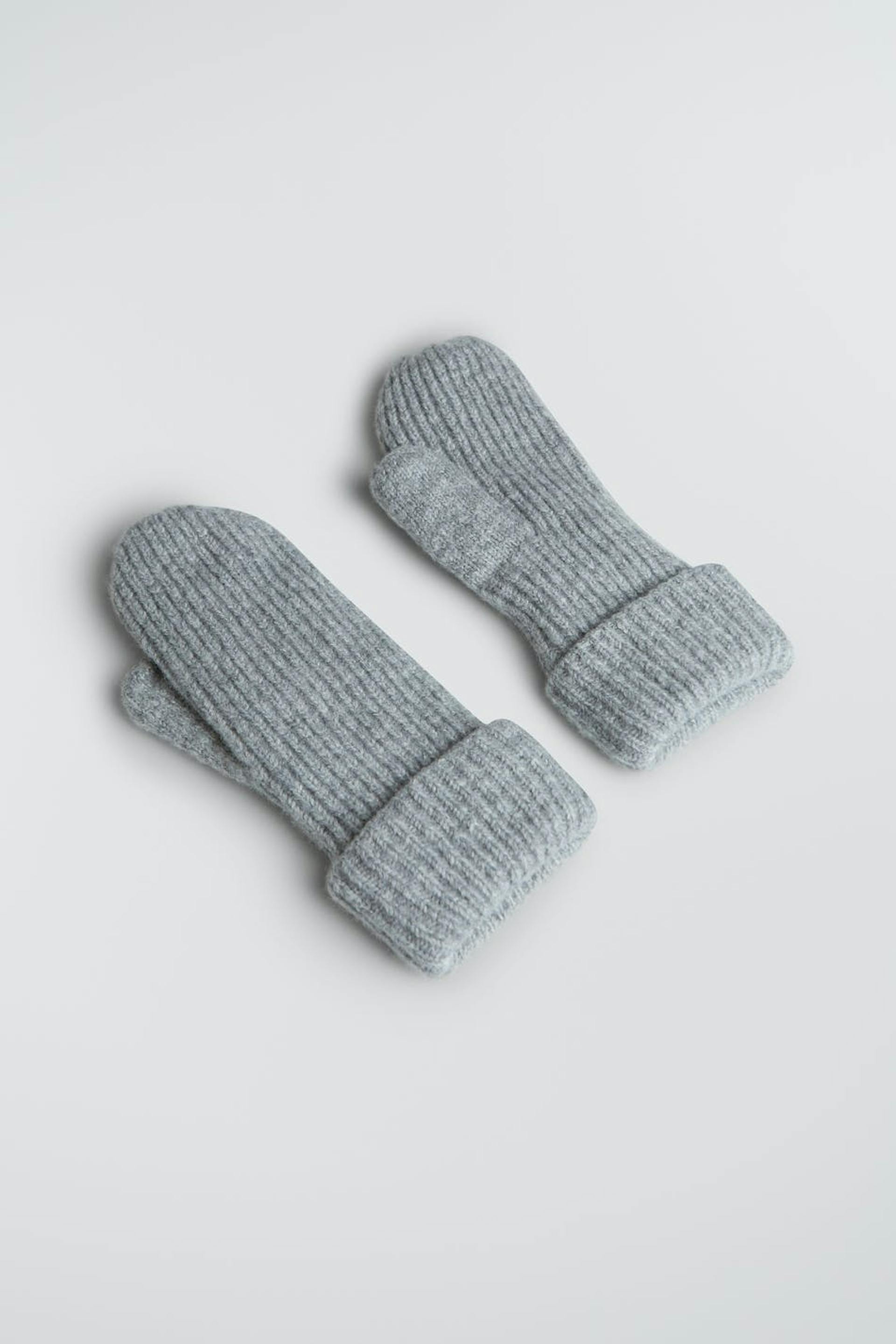 Rib-knit mittens. The mittens are grey.