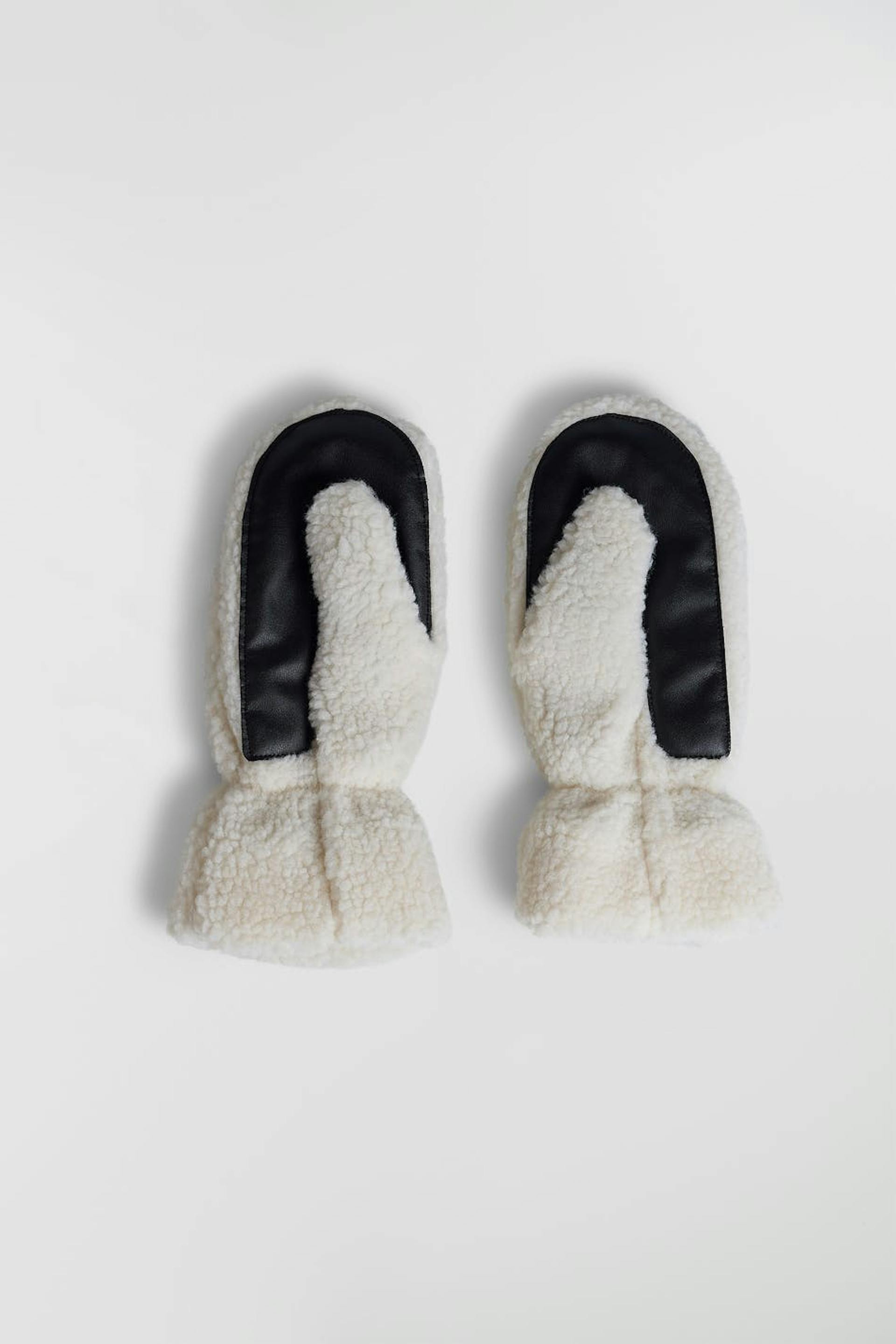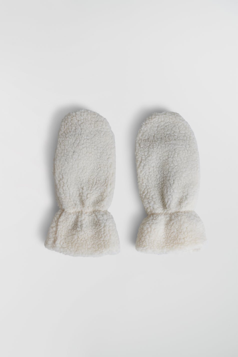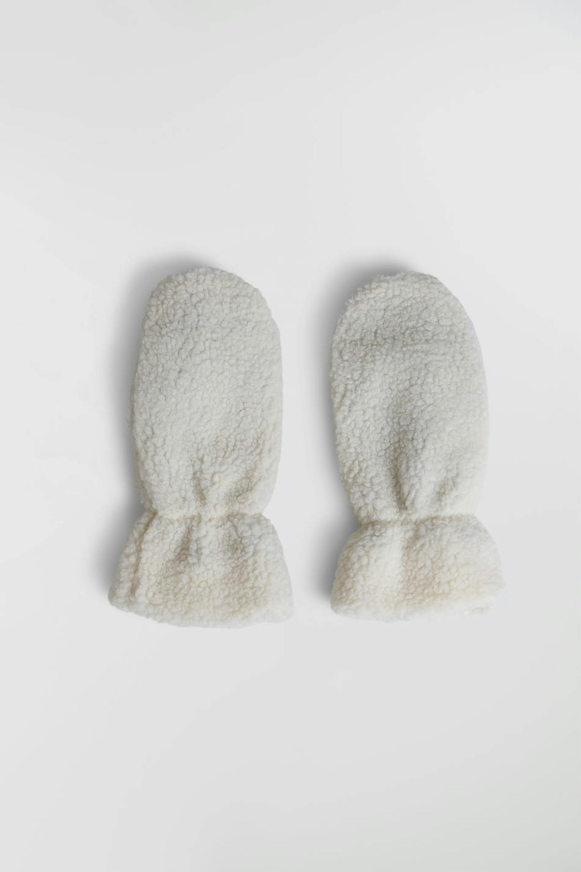 Mittens with a soft teddy material. The mittens are white.