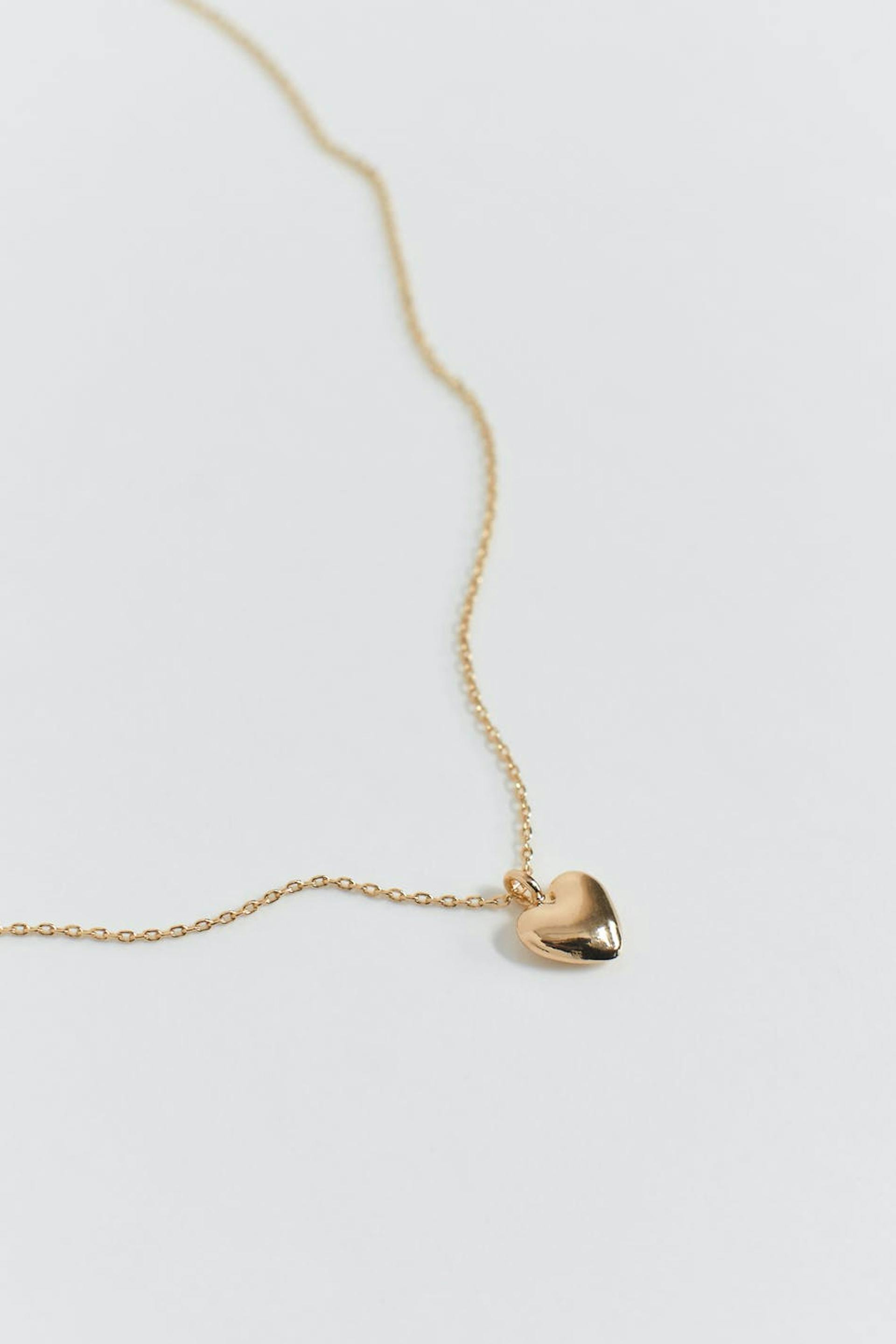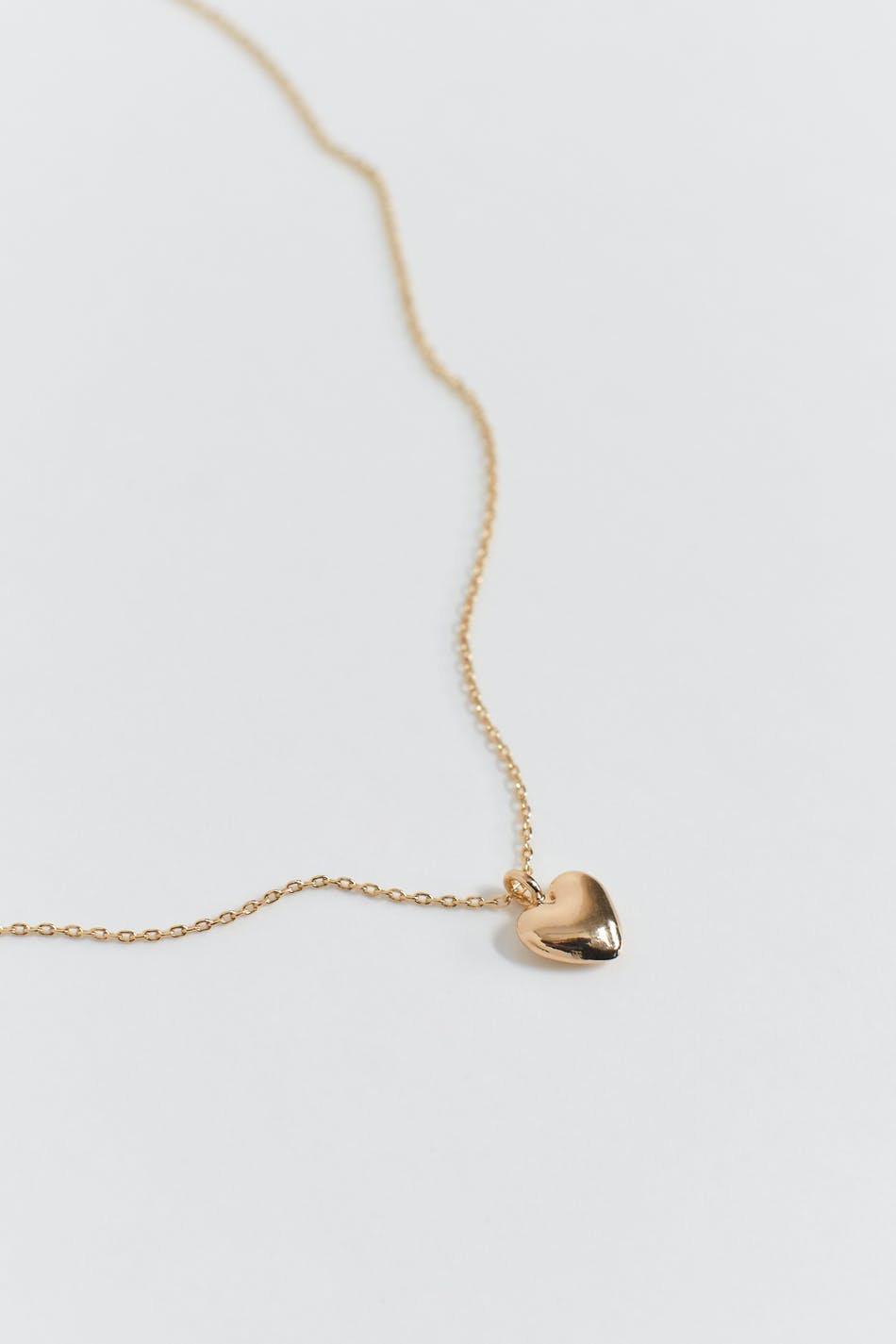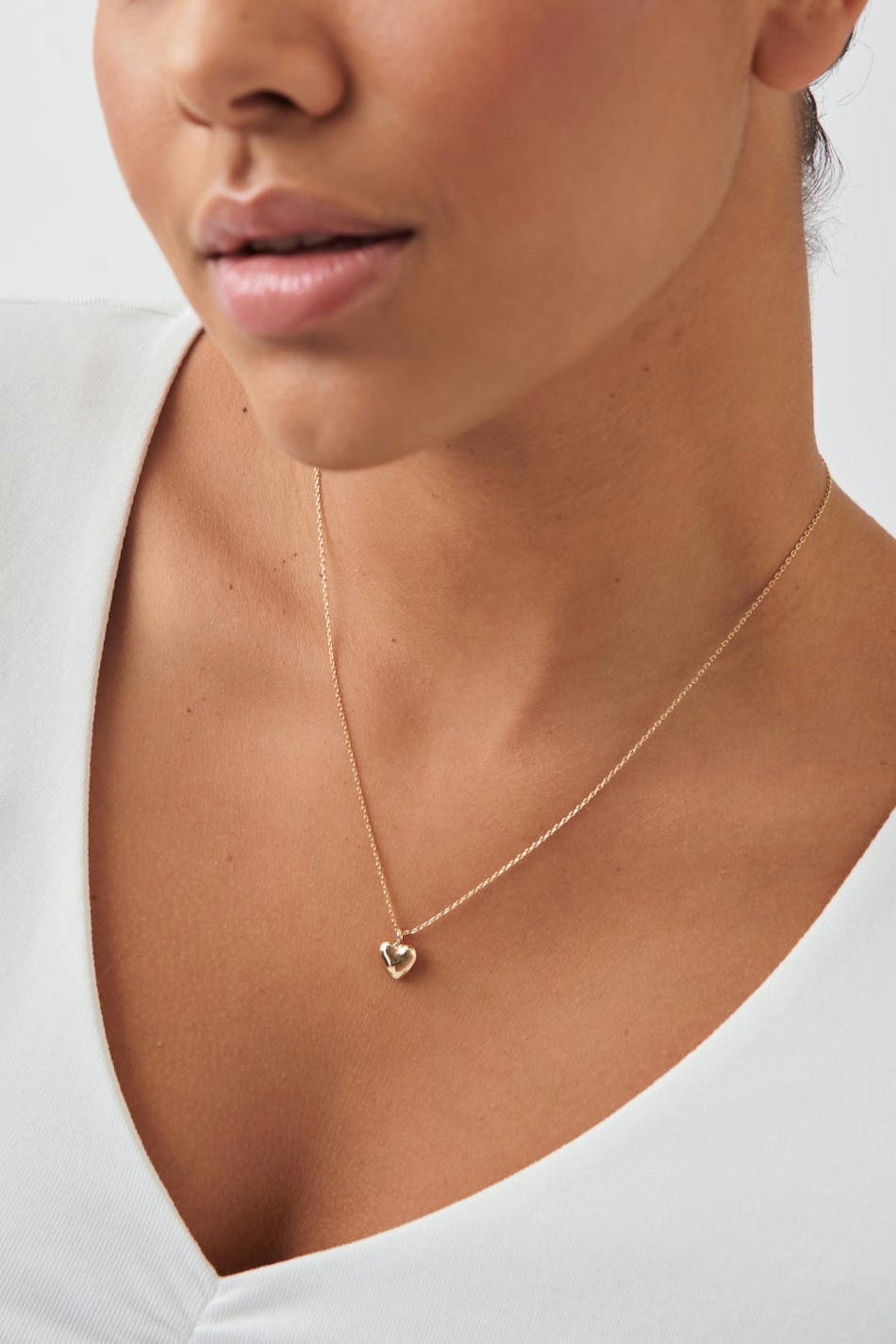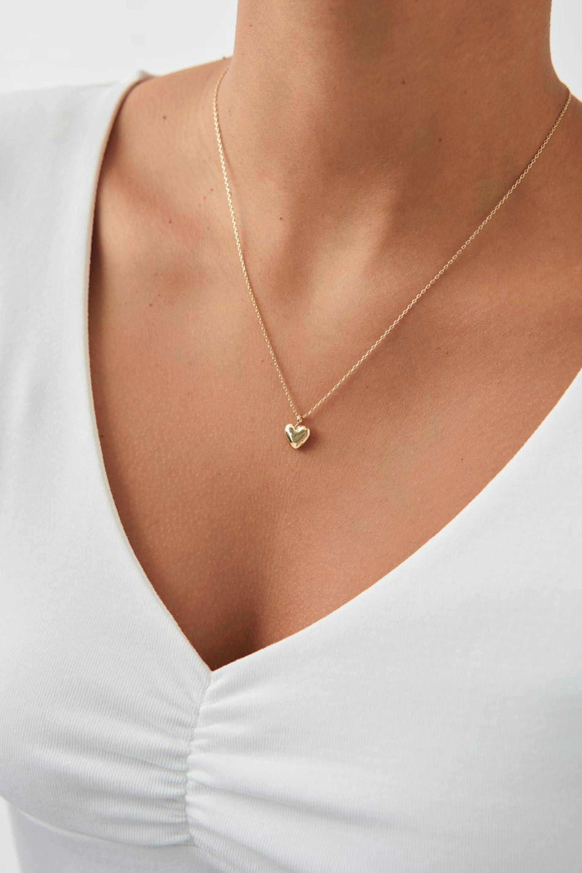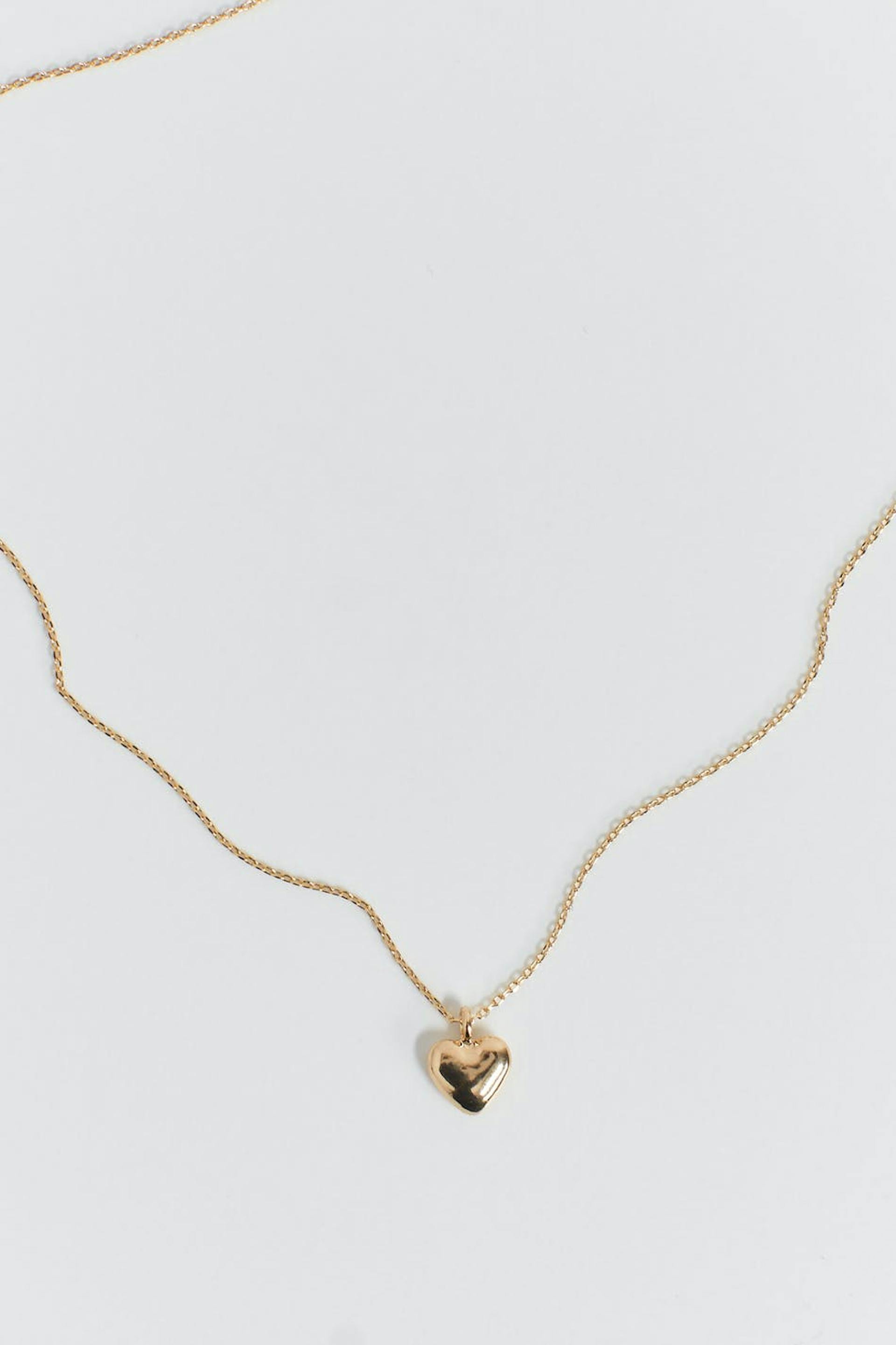 Necklace with small heart. The jewellery is gold coloured and has thin chain.
