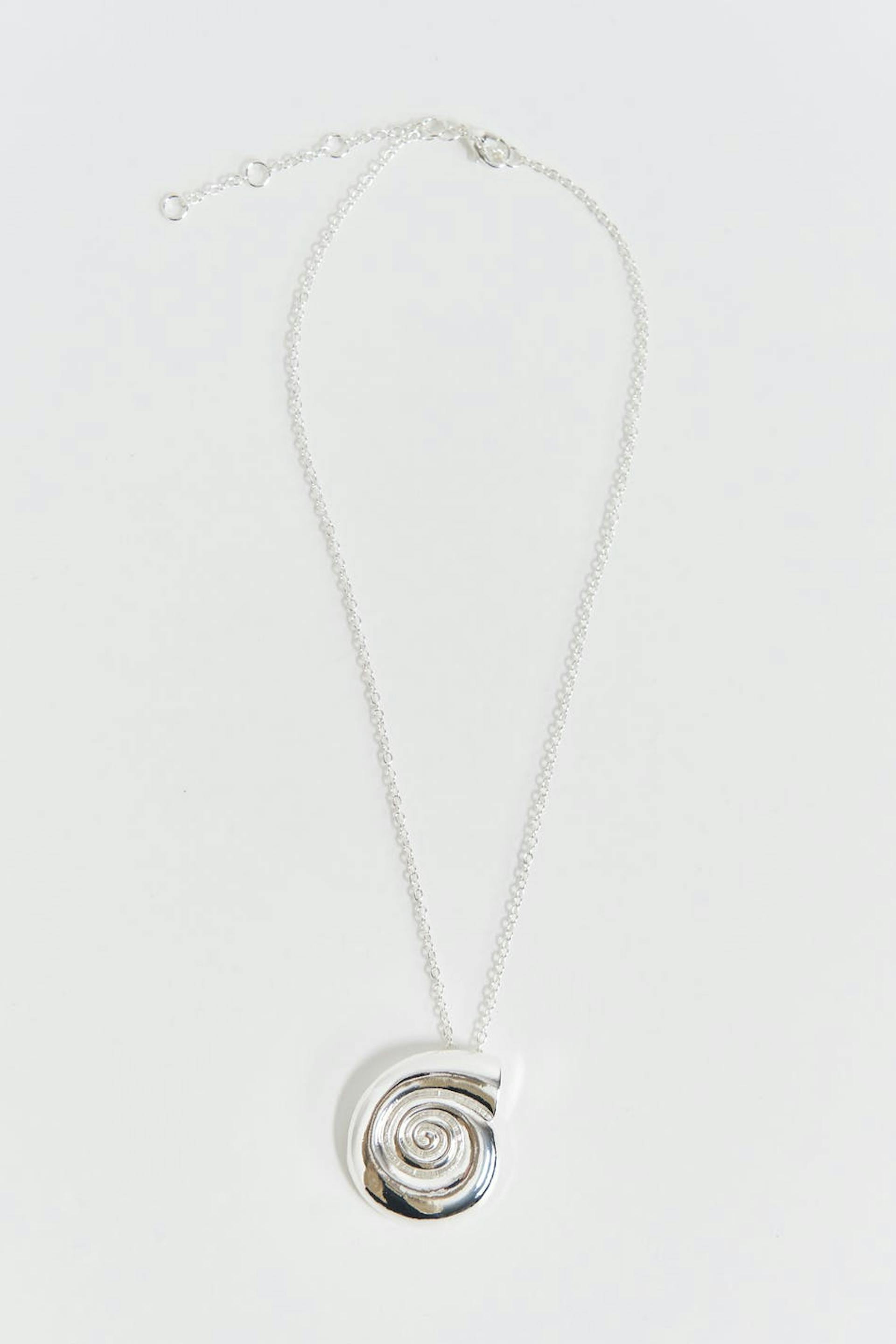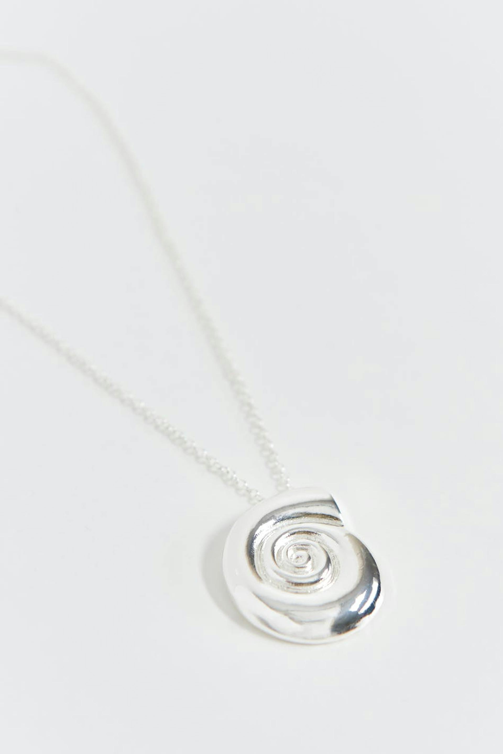 Necklace with thin chain. The jewellery is silver coloured and has pendant with shell.