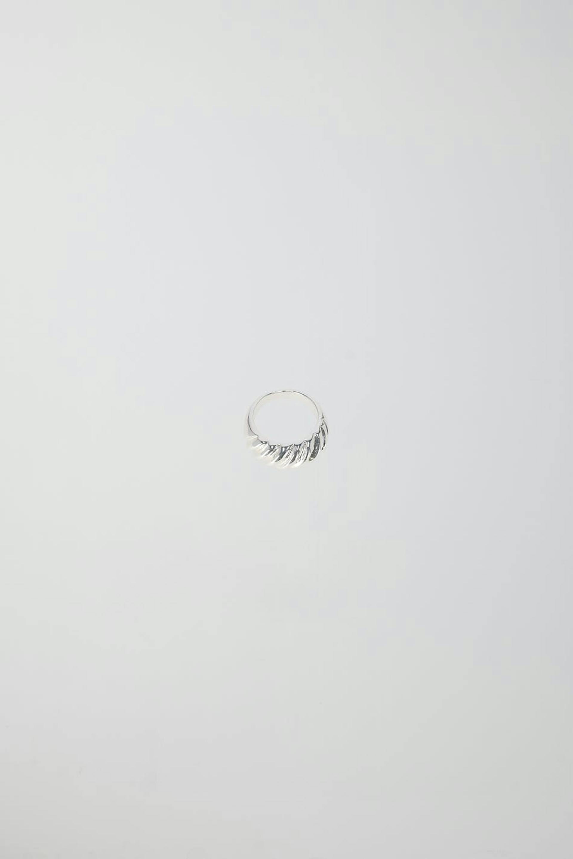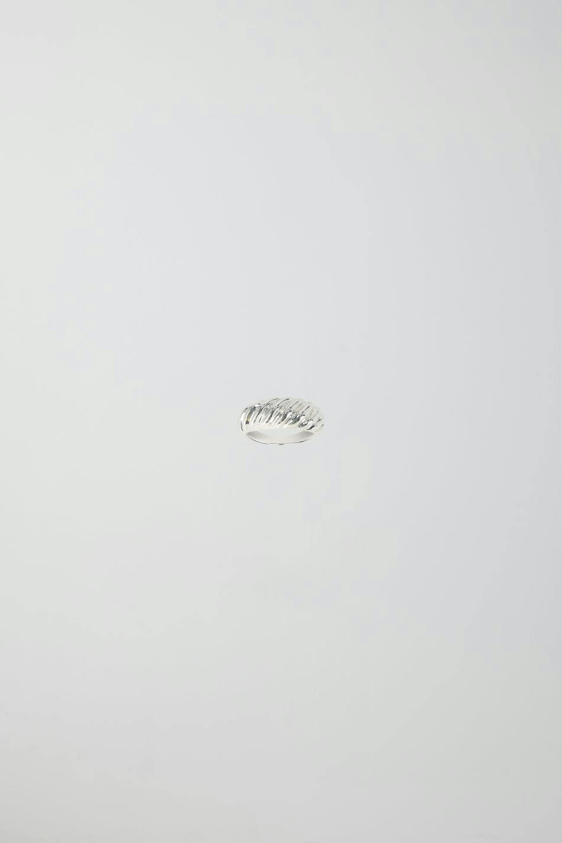 Ring with a twisted look. The ring is silver coloured and has a shiny finish.