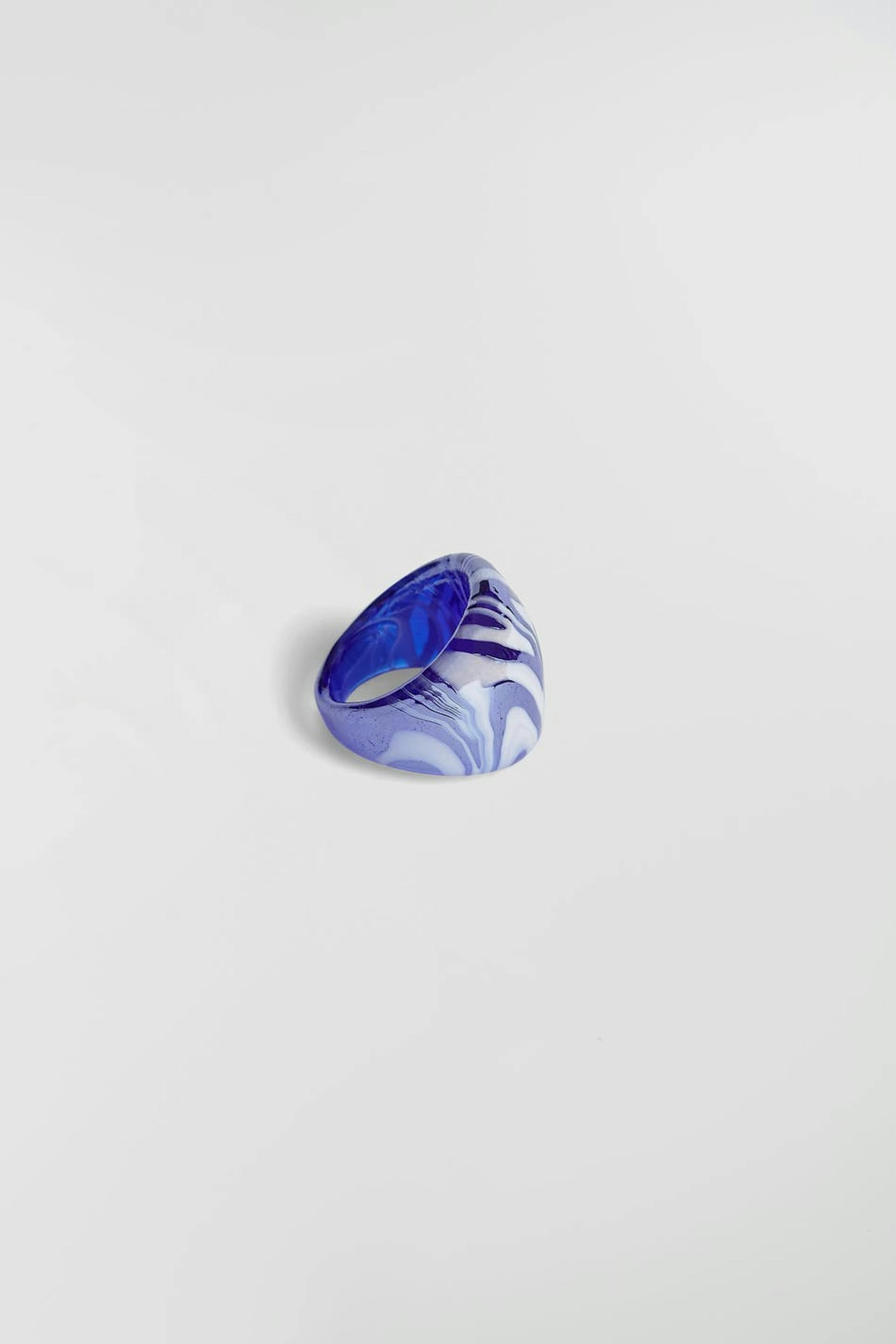 Ring in glass with a chunky design. The ring is blue, white and zebra patterned.