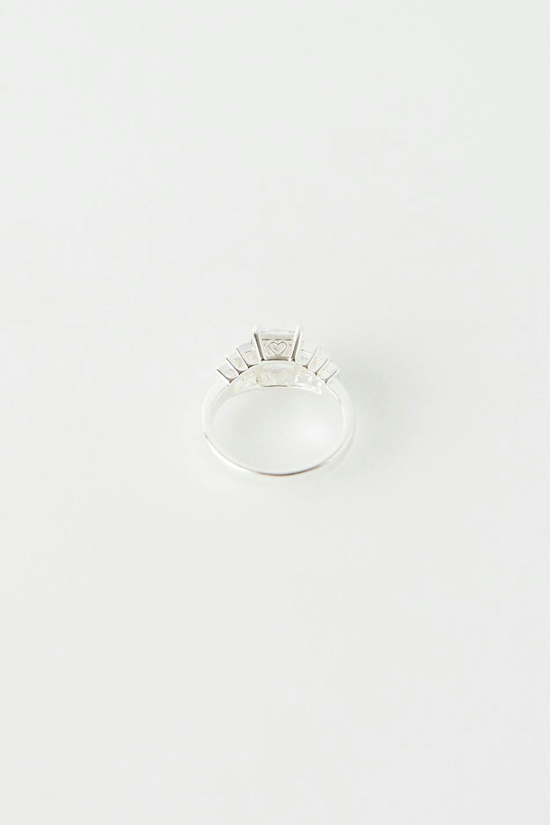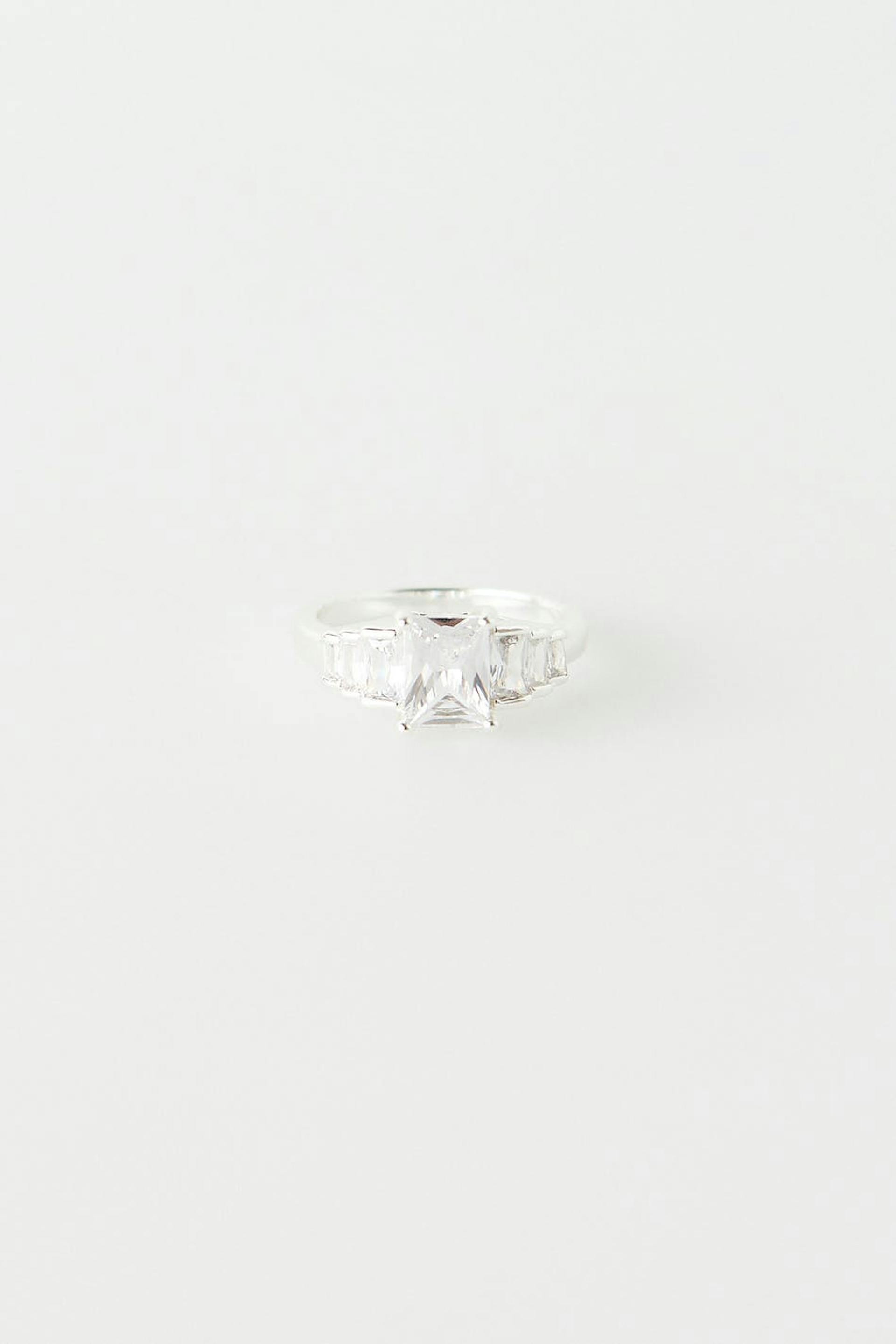 Ring with a sparkly, big stone. The ring is silver coloured and has decorative, small stones.