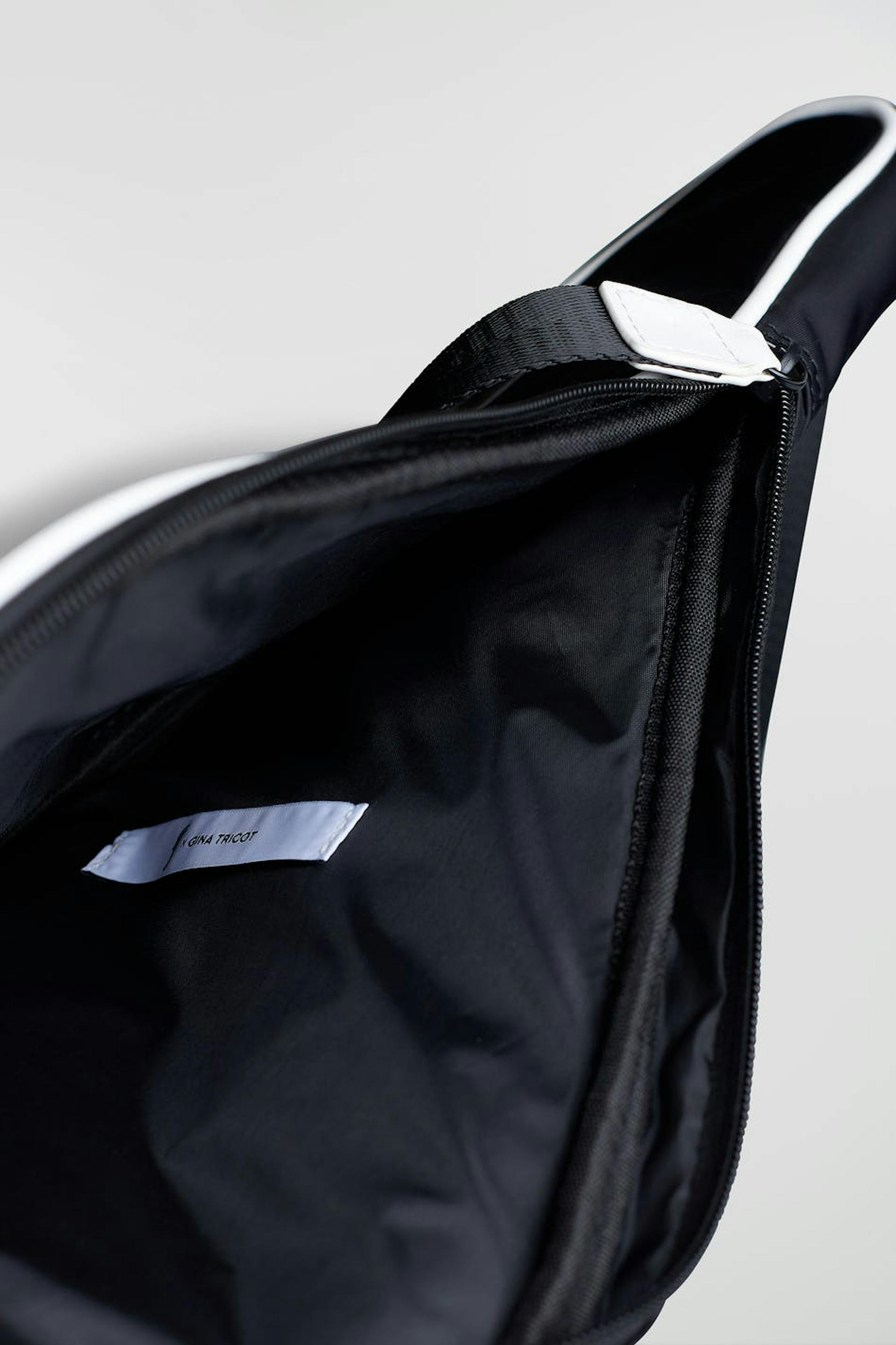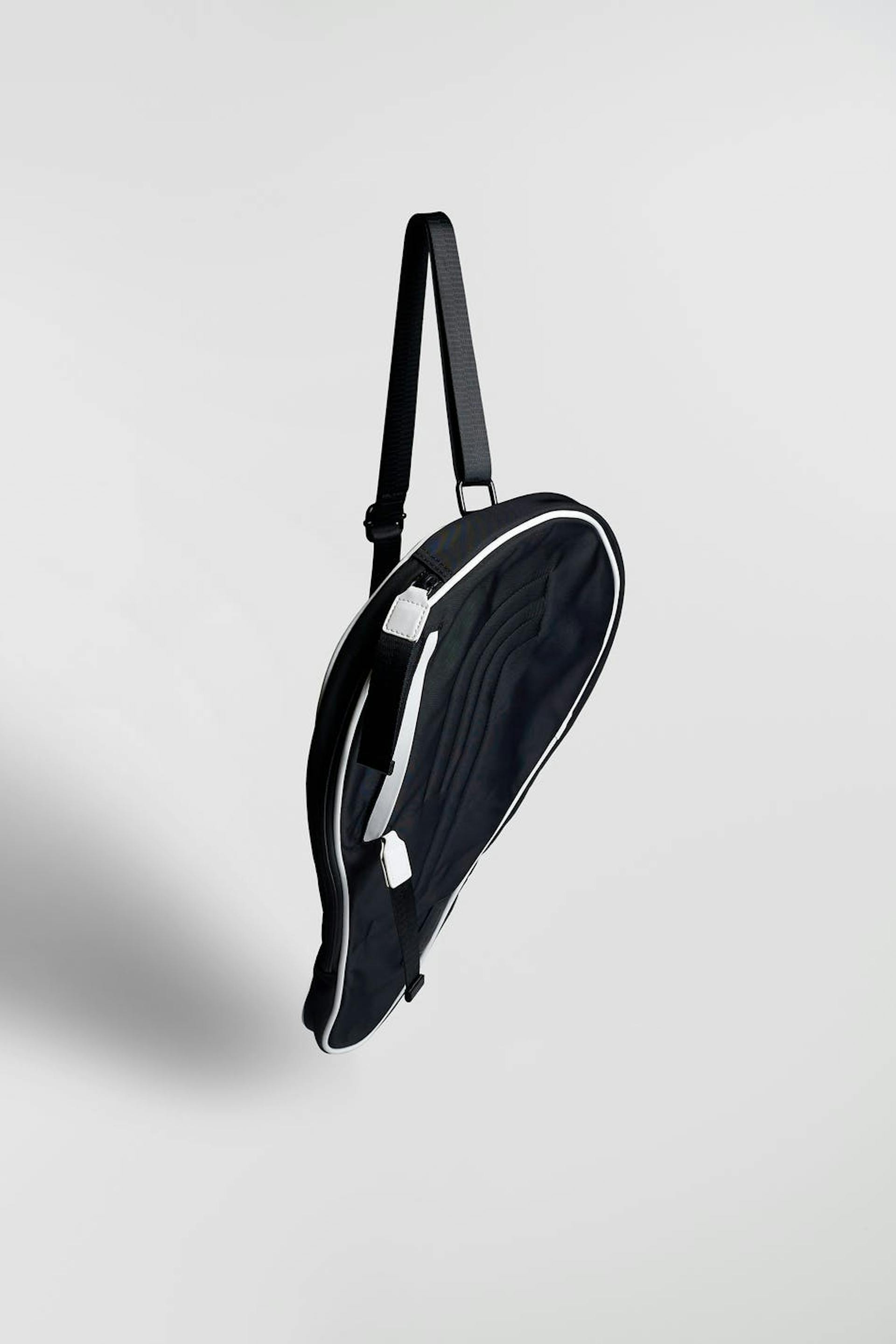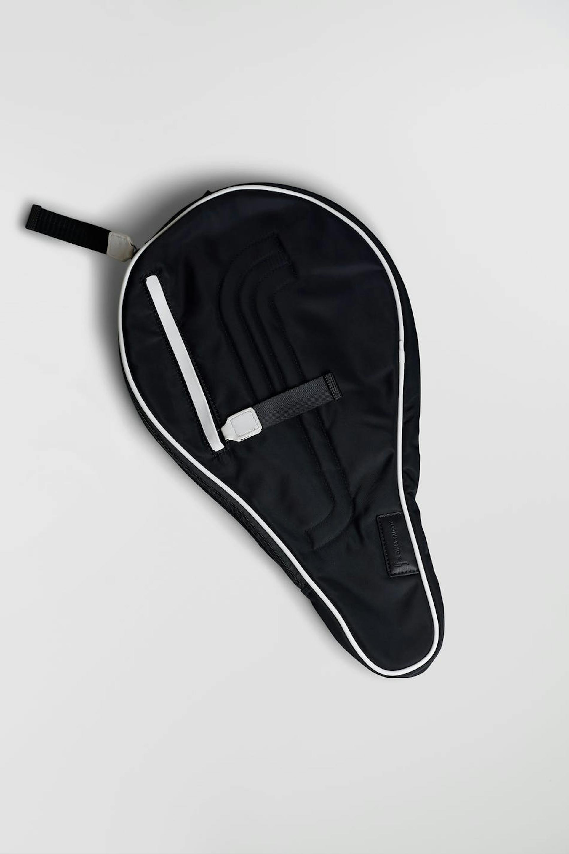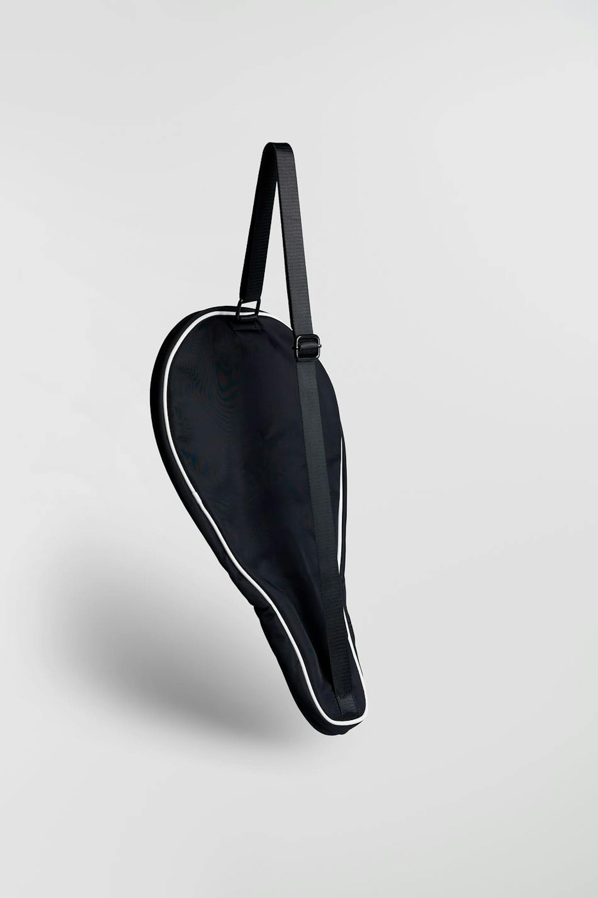 RS X Gina Tricot. Padded padel case with adjustable shoulder strap. The case is black and has white details. It has a zip closure and an outer compartment at the front.
