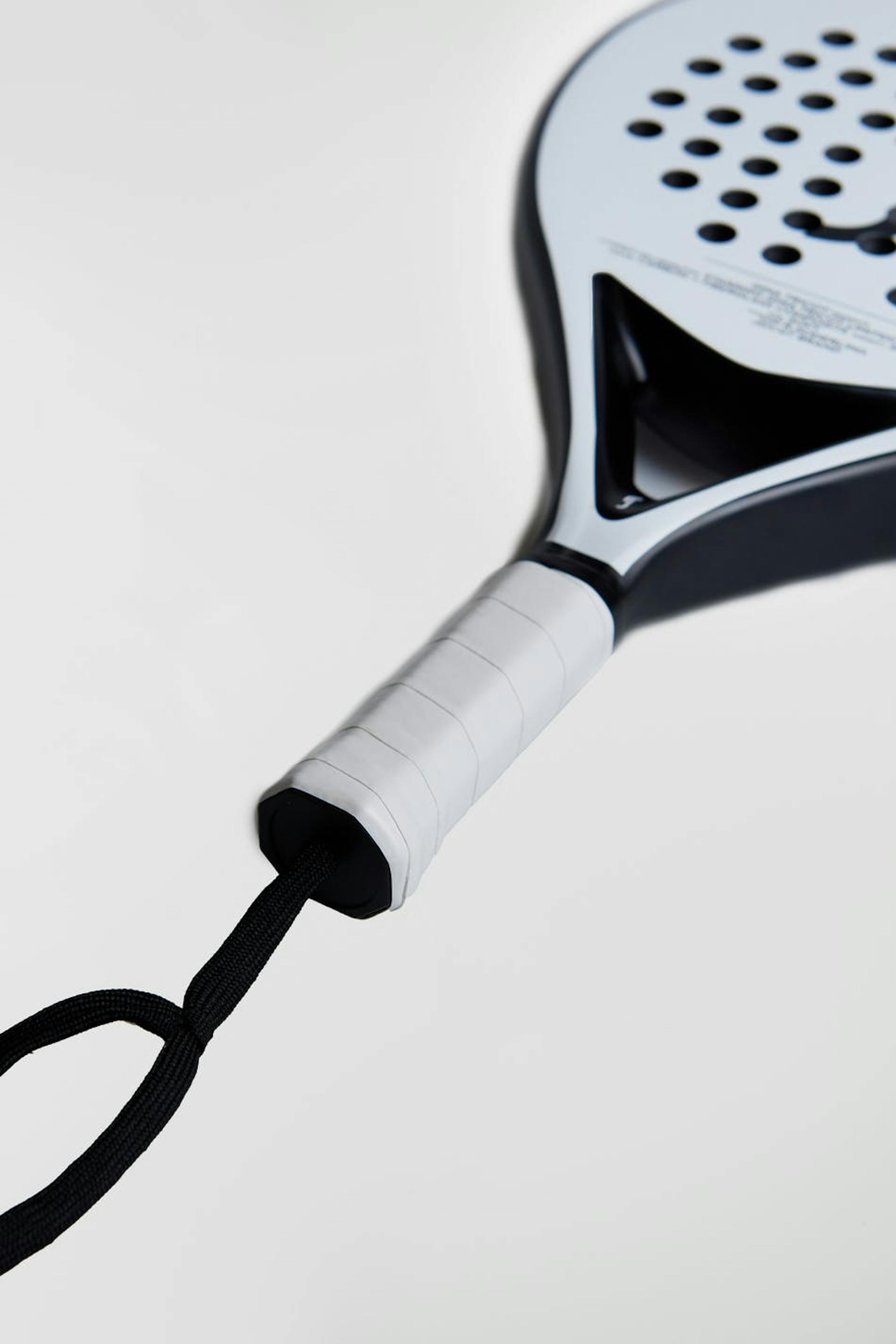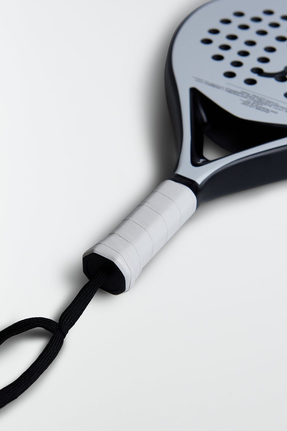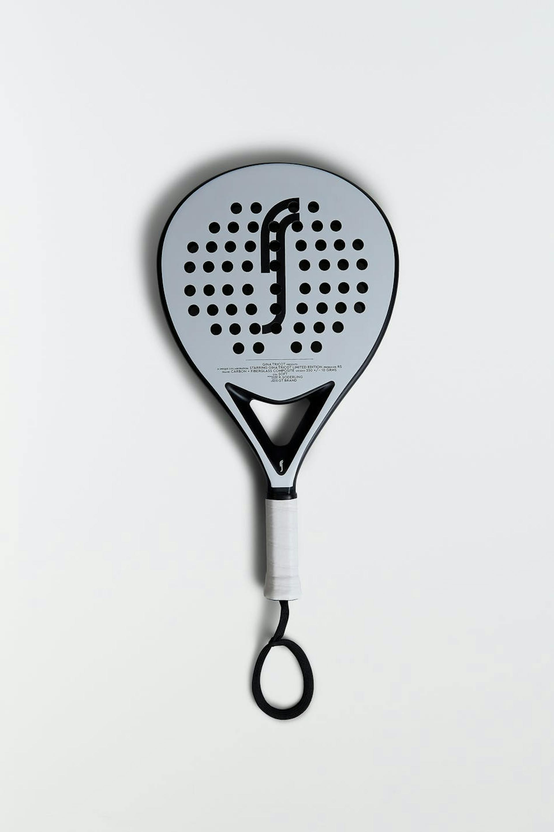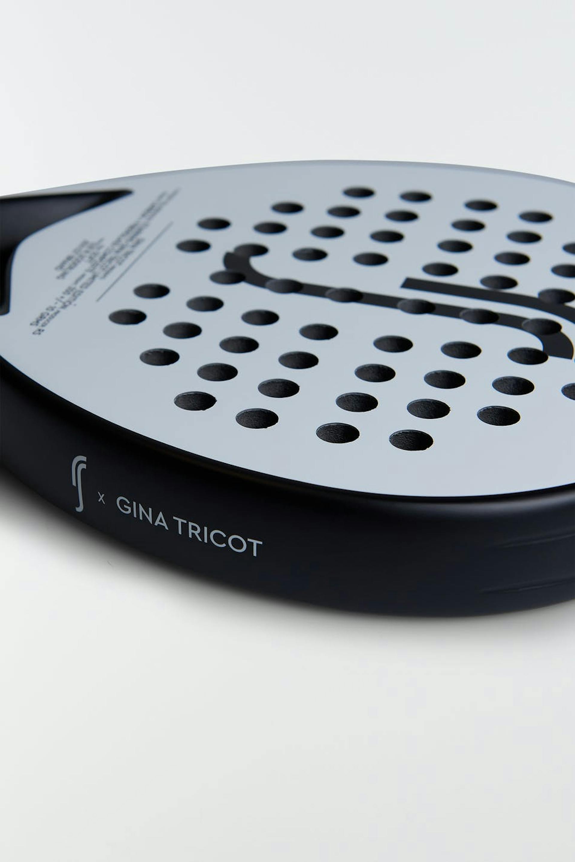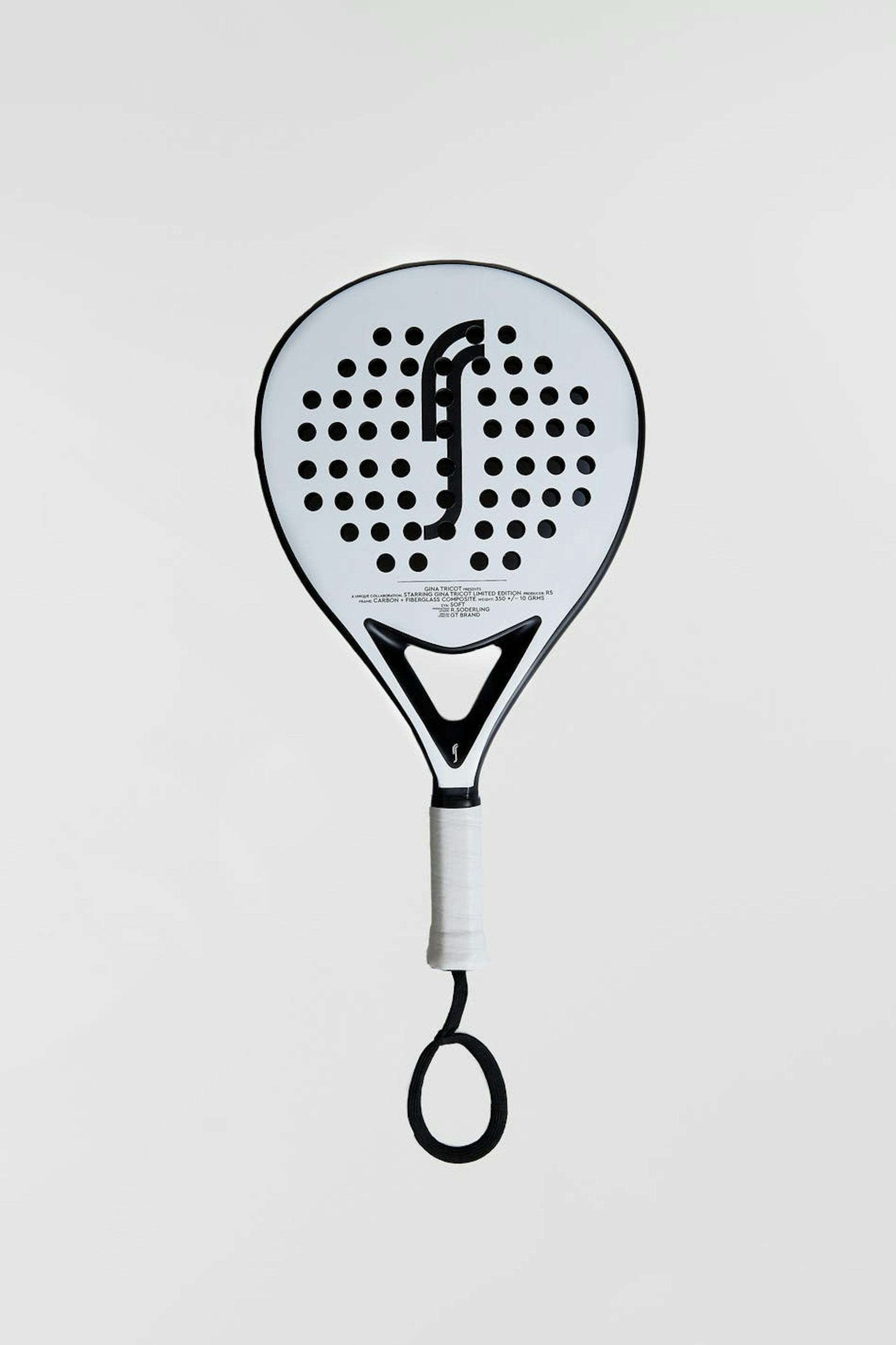 RS X Gina Tricot. Padel racket with high, for both beginners and experienced players quality. The padel racket is white and has black details. It has a rounded shape and a brand logo at the front.