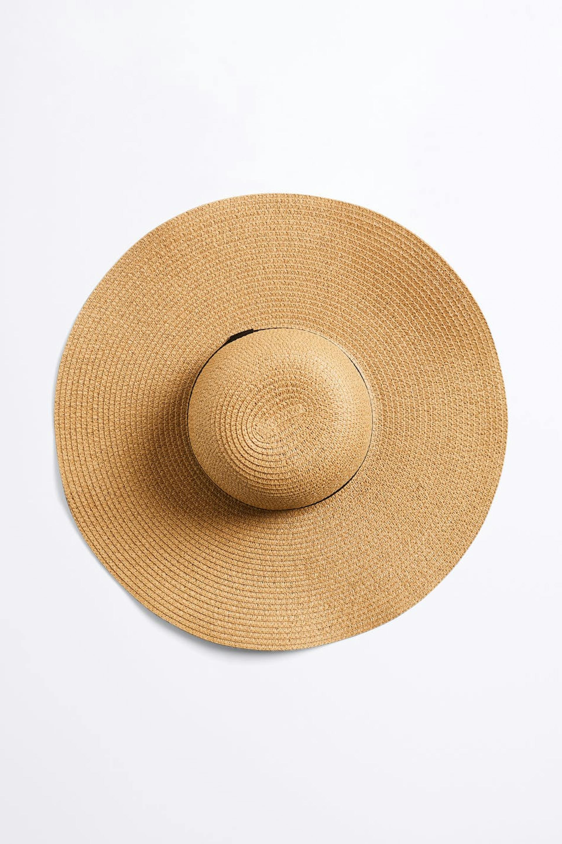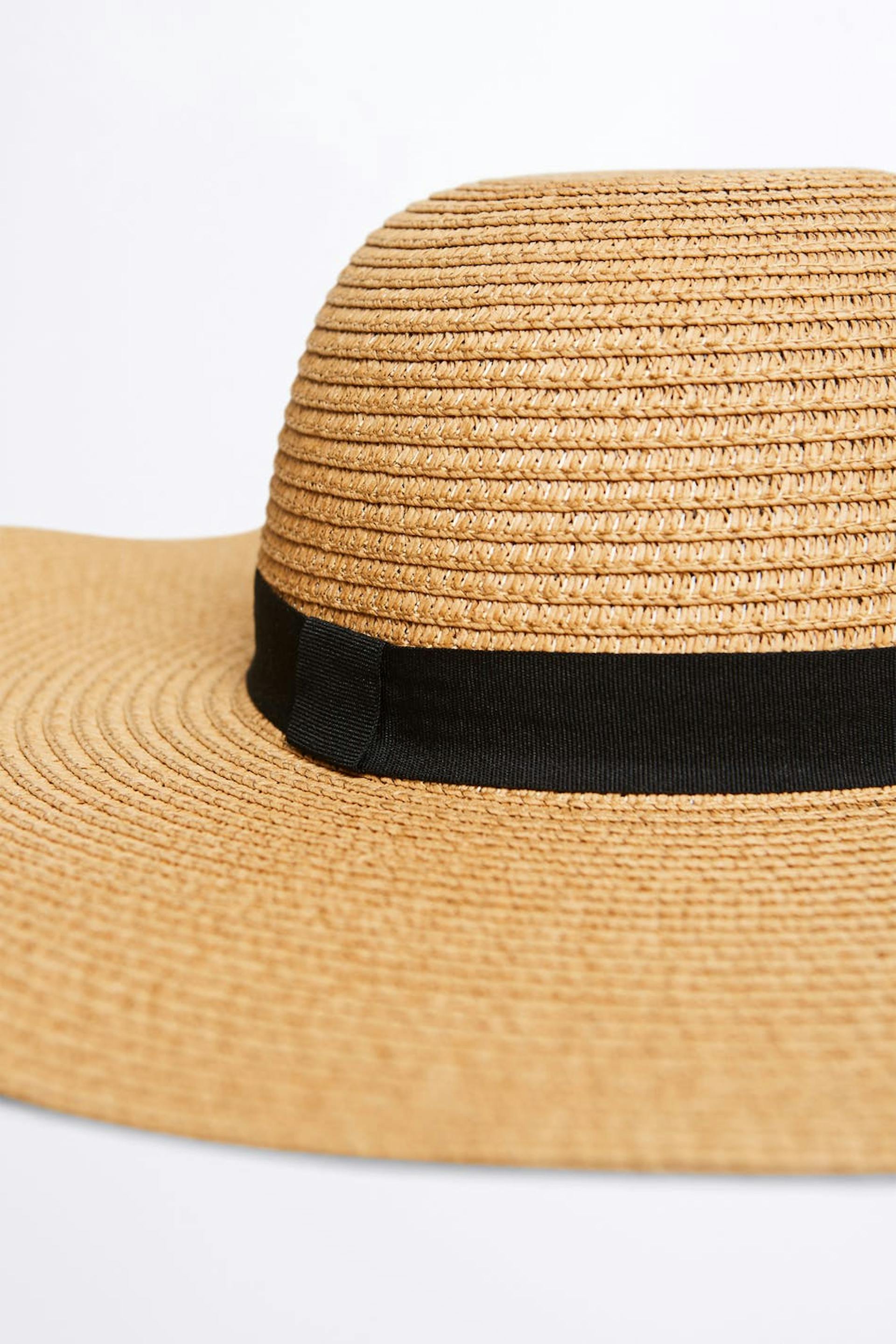 Sun hat. The sun hat is beige and black.