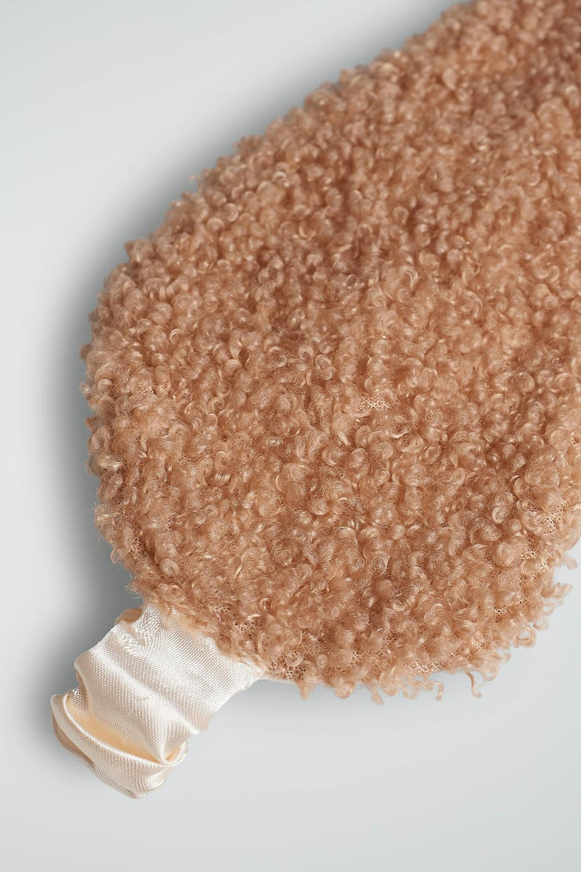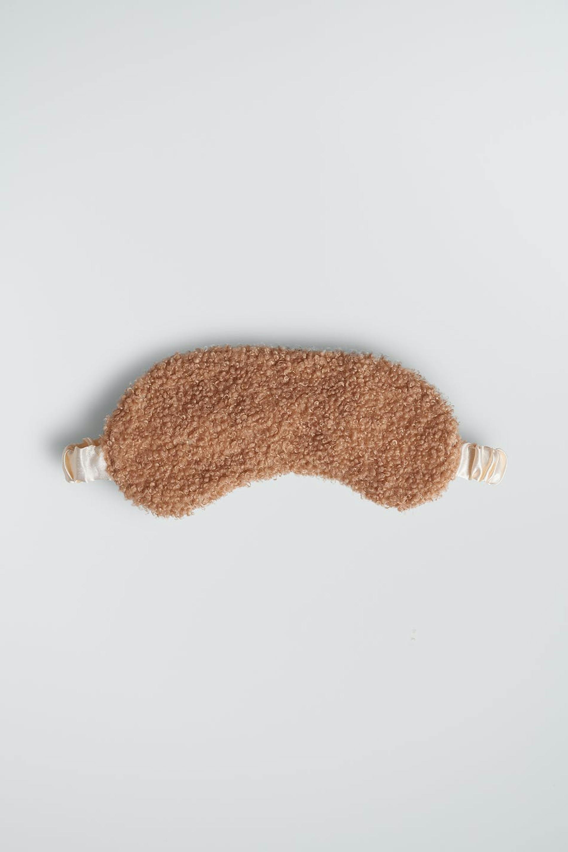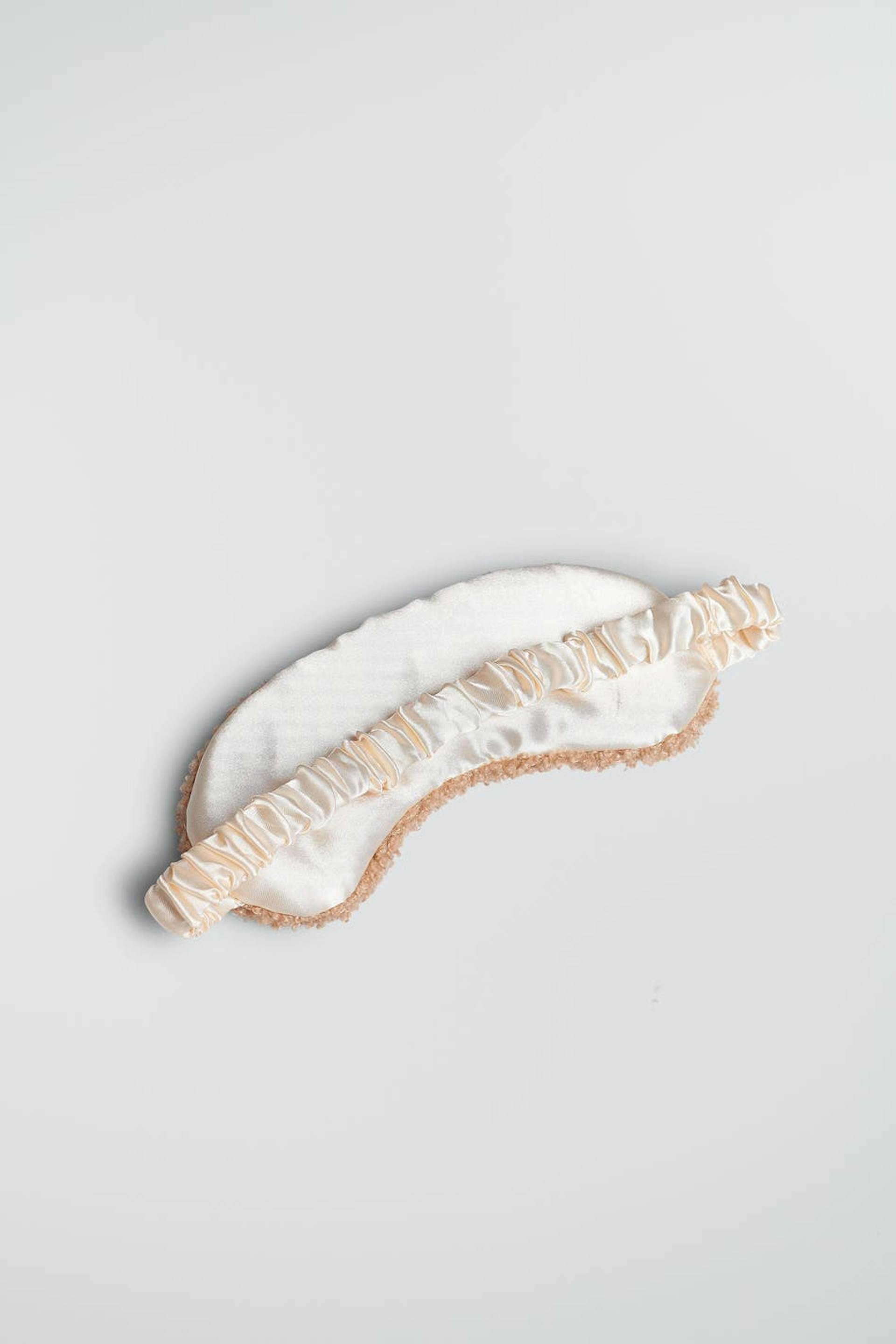 Champagne colour eye mask with an inner material in satin. The eye mask is perfect for sleeping, beige and soft. It has a teddy material on the outside.