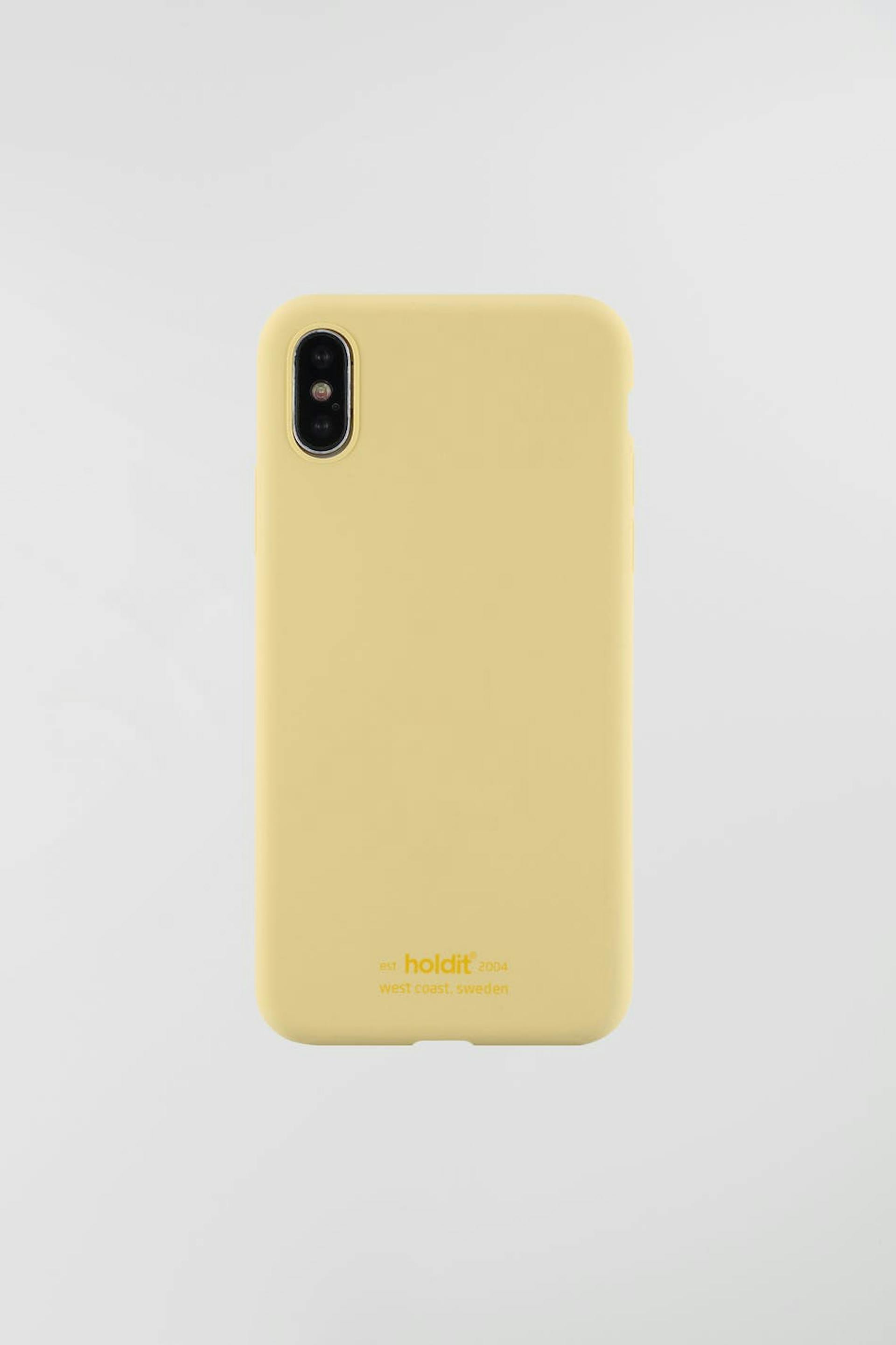 Smartphone case by Holdit. The smartphone case is yellow. It is made of silicone. iPhone X/XS.