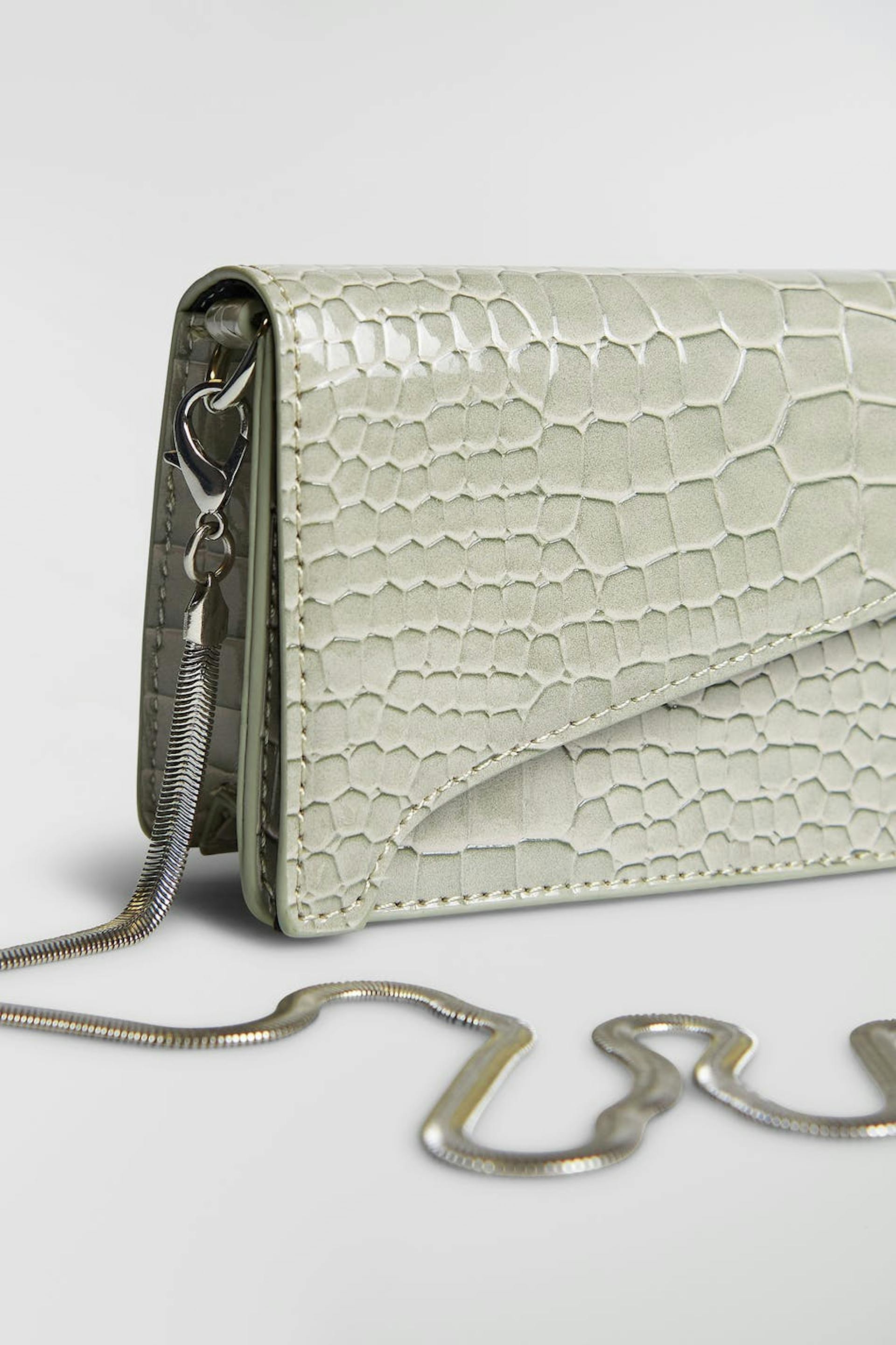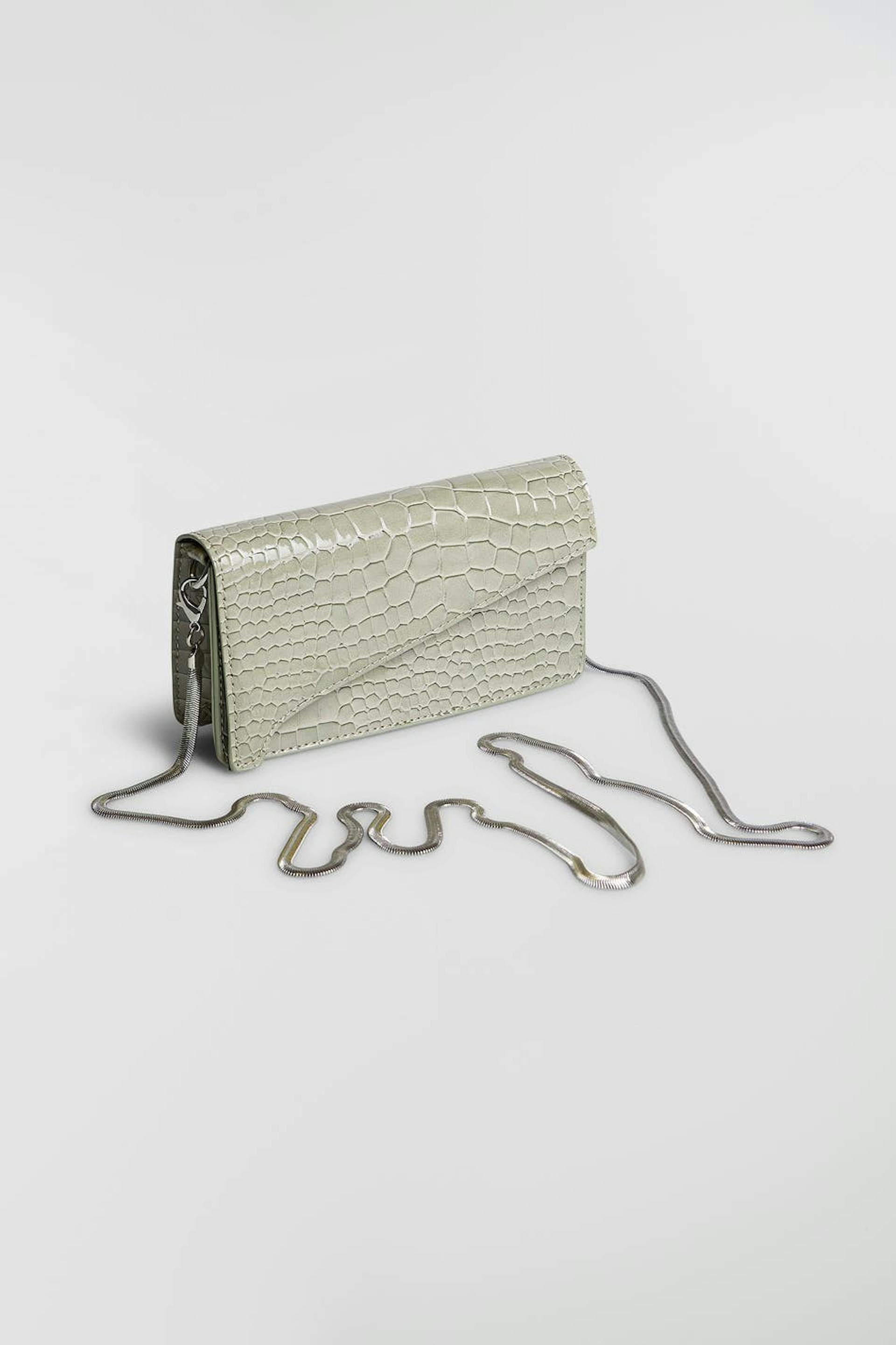 Small purse with a gold coloured, thin, detachable shoulder strap. The bag is perfect for the festivities and beige. It is made of snake-effect finish.