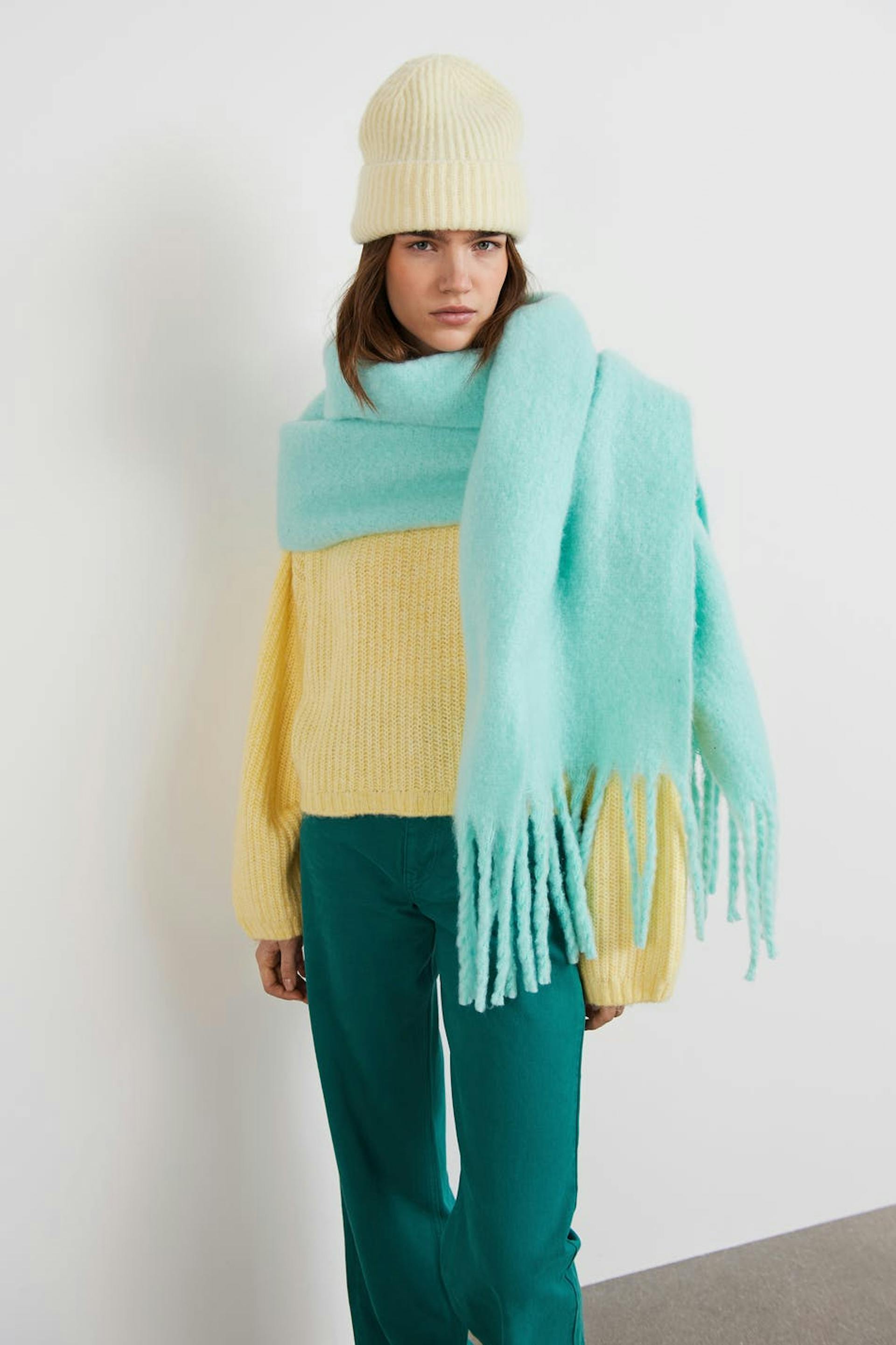 Soft scarf with fringes on the short sides. The scarf is blue.