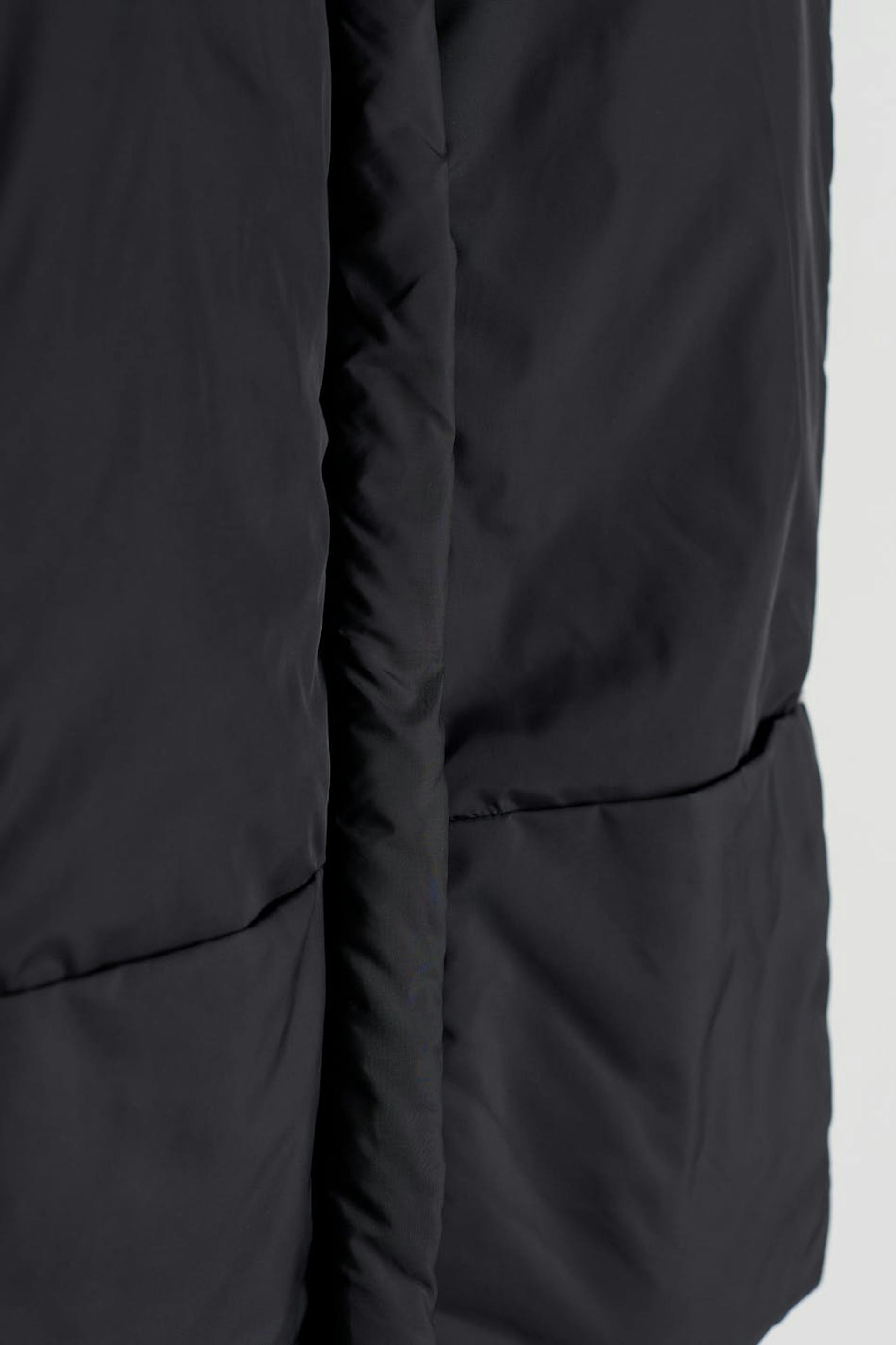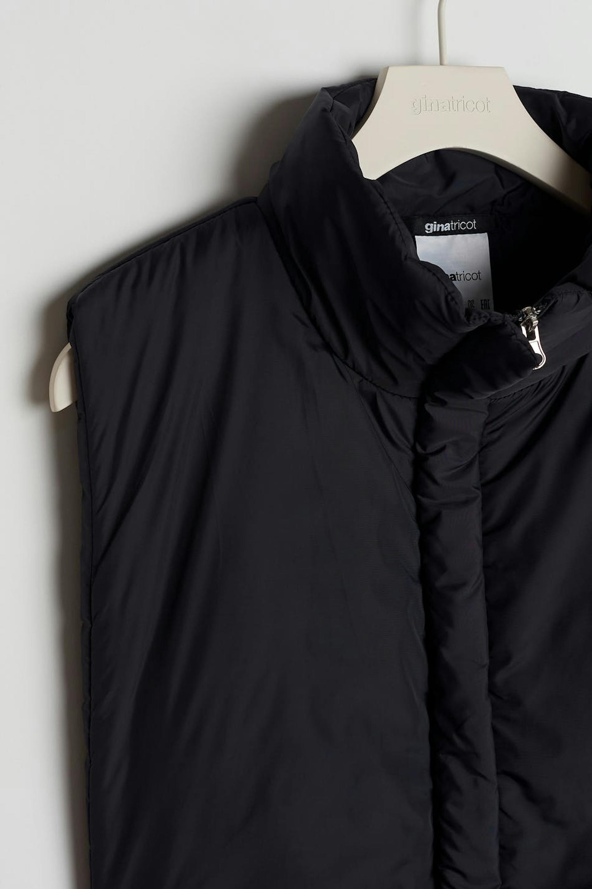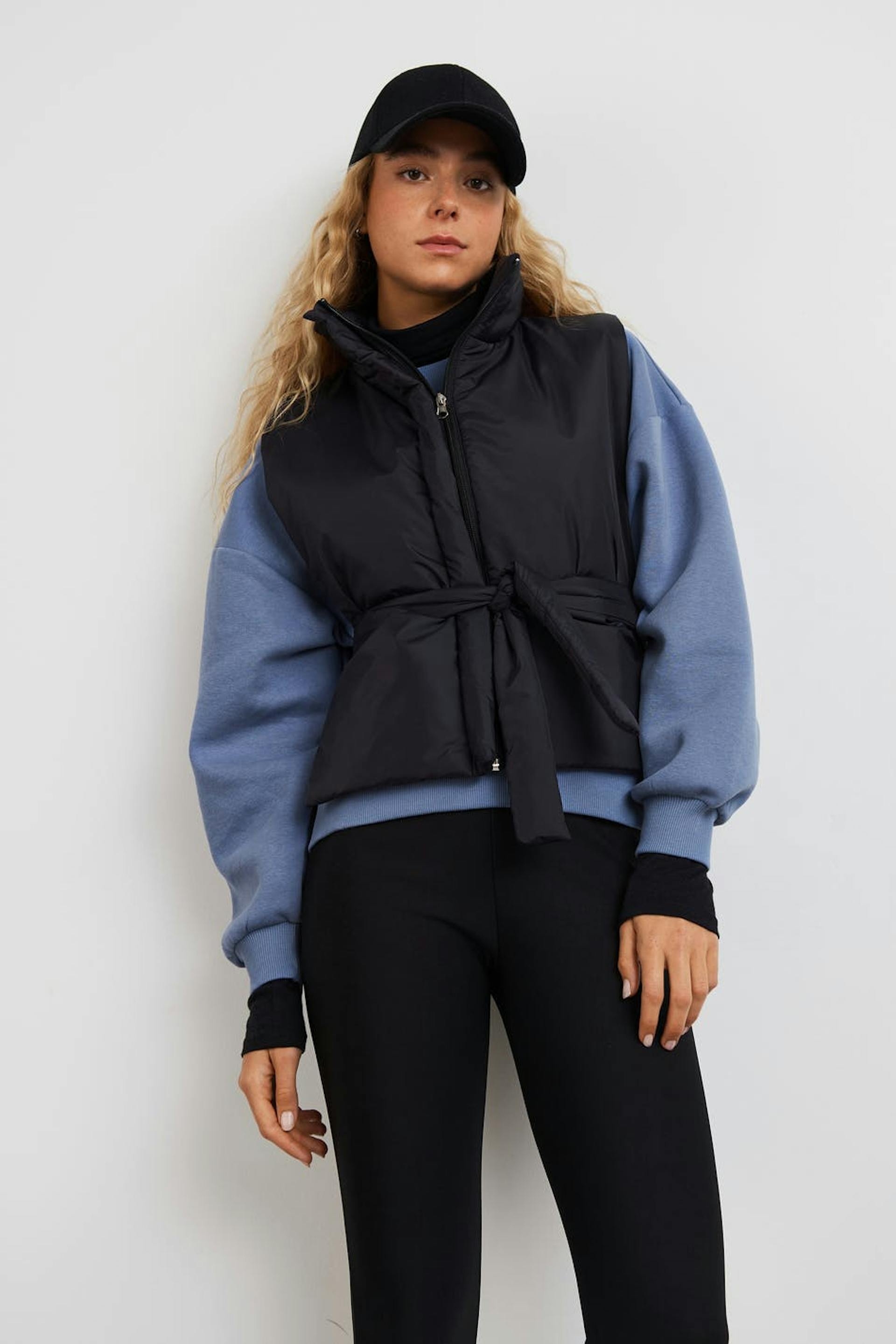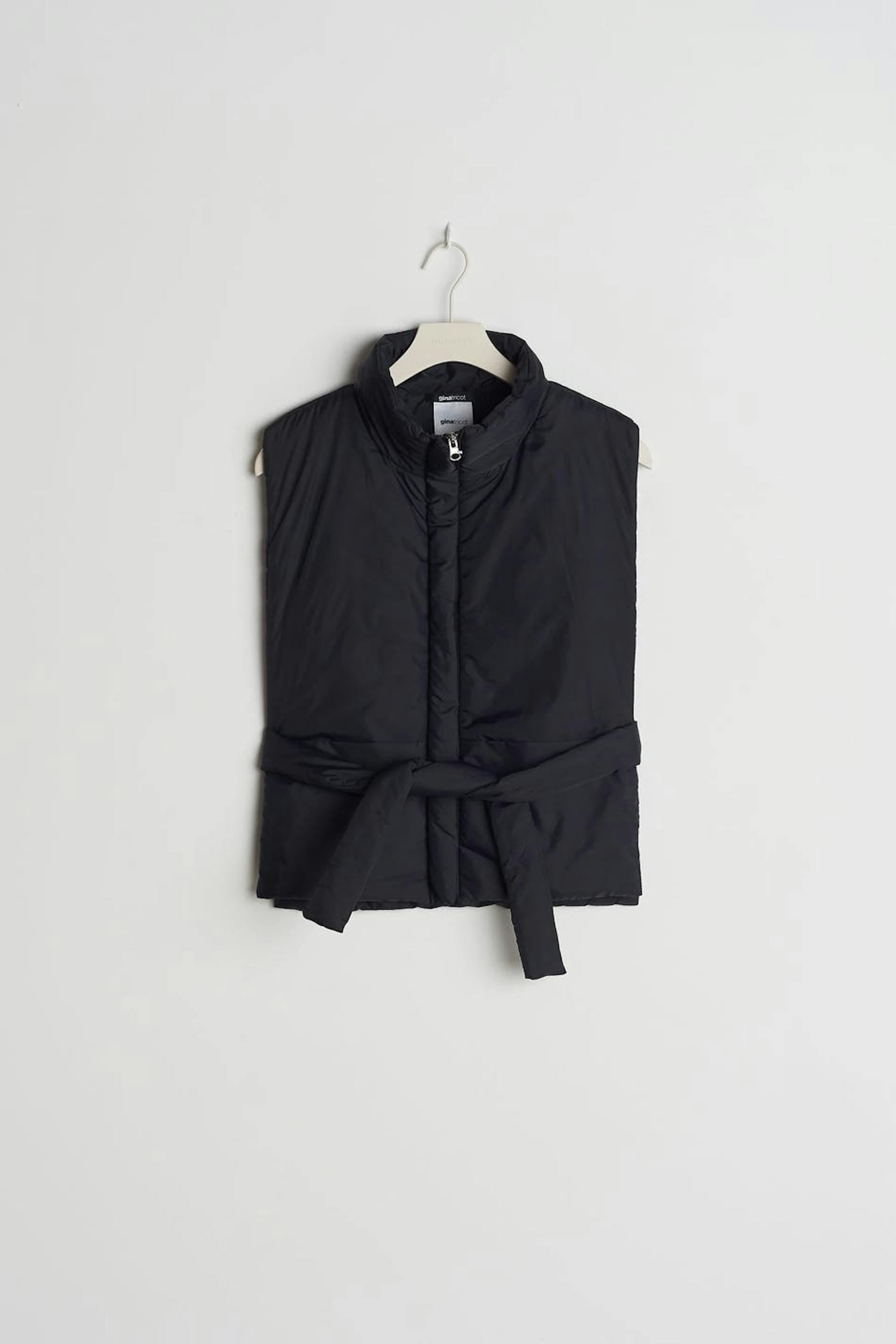 Padded gilet with high neck. The waistcoat is black and has a zip at the front. It has a tie belt at the waist.