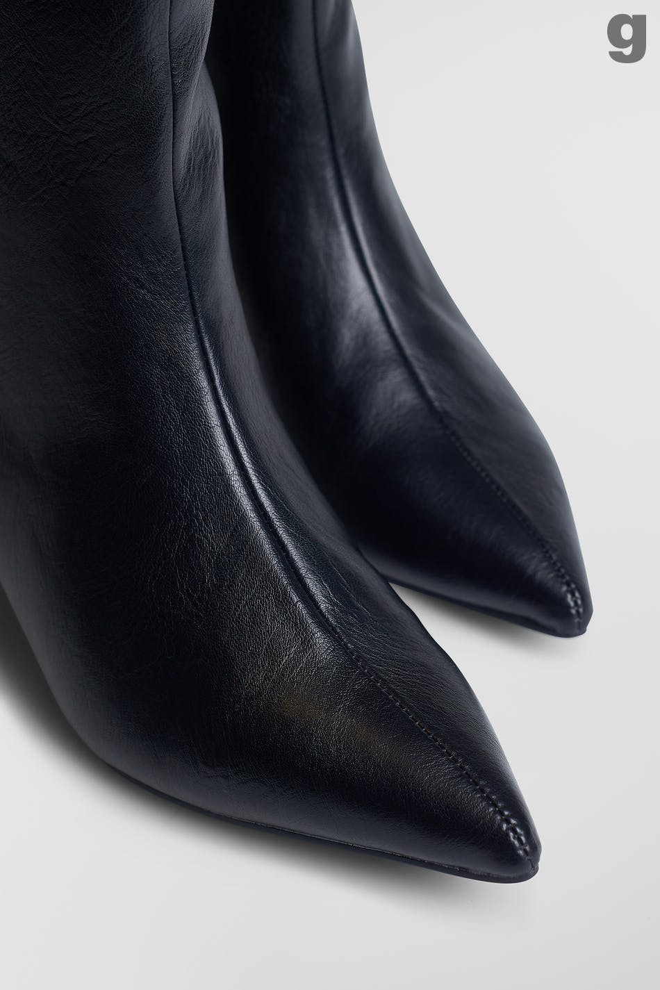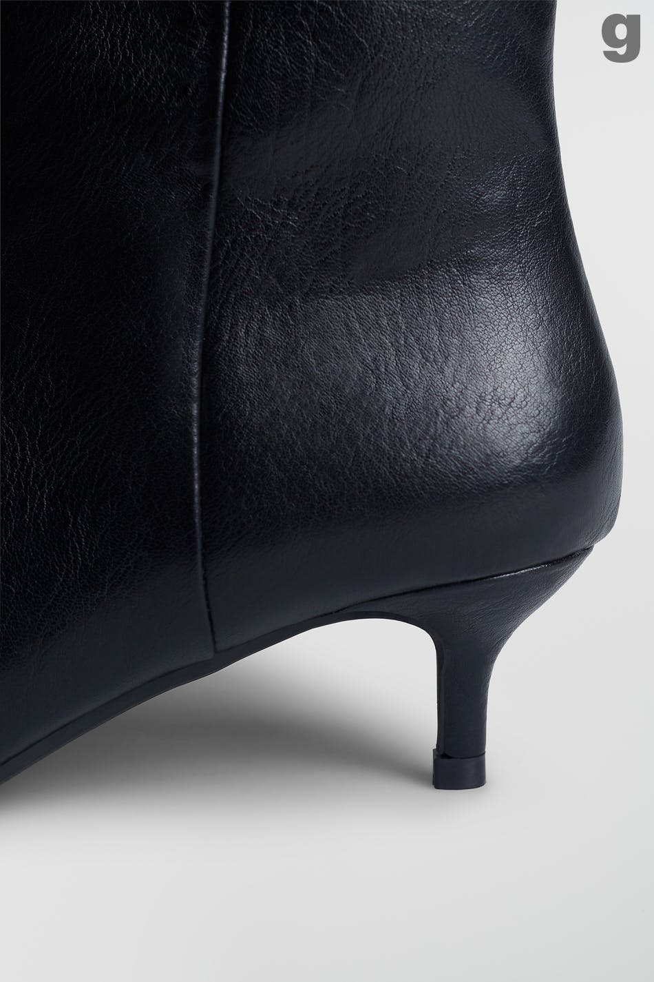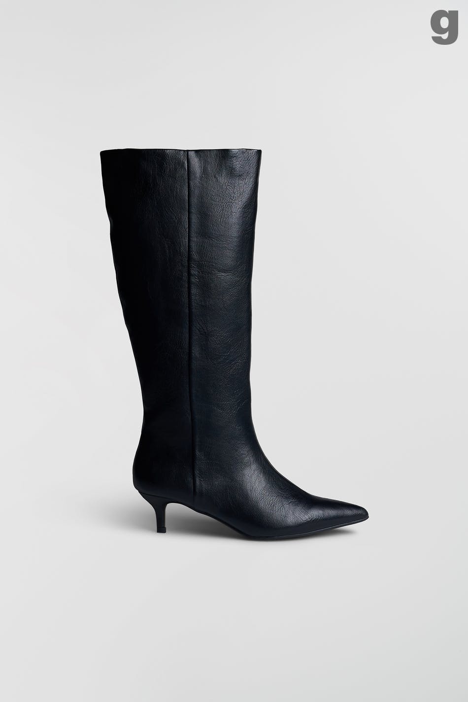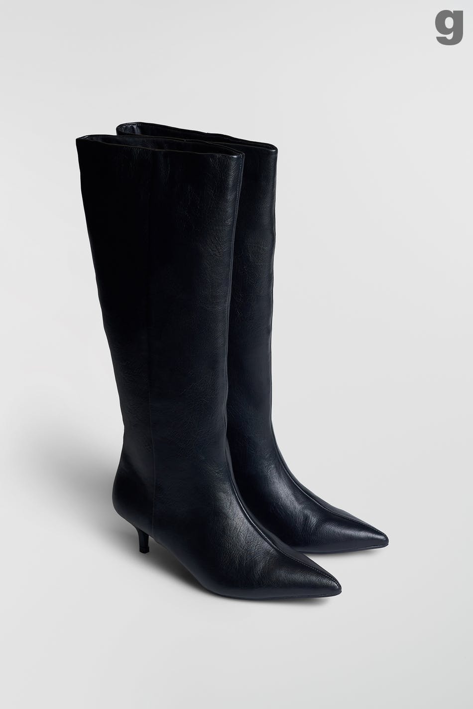 High boots with kitten heel. The boots are black and have a pointed toe.