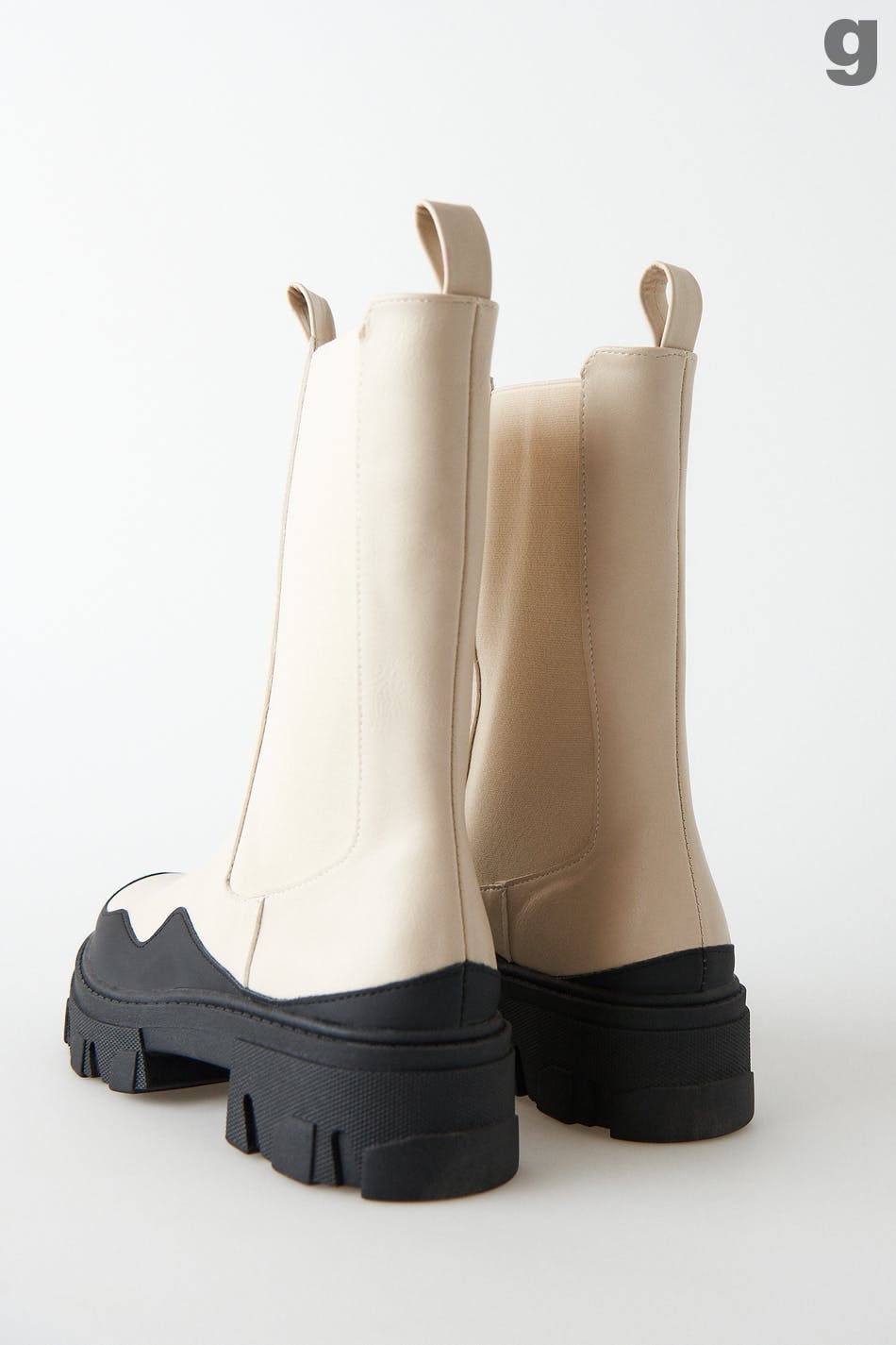 Chunky boots in PU with elastic in the sides. The boots are white and have mid high shaft. They have chunky soles and round toe.