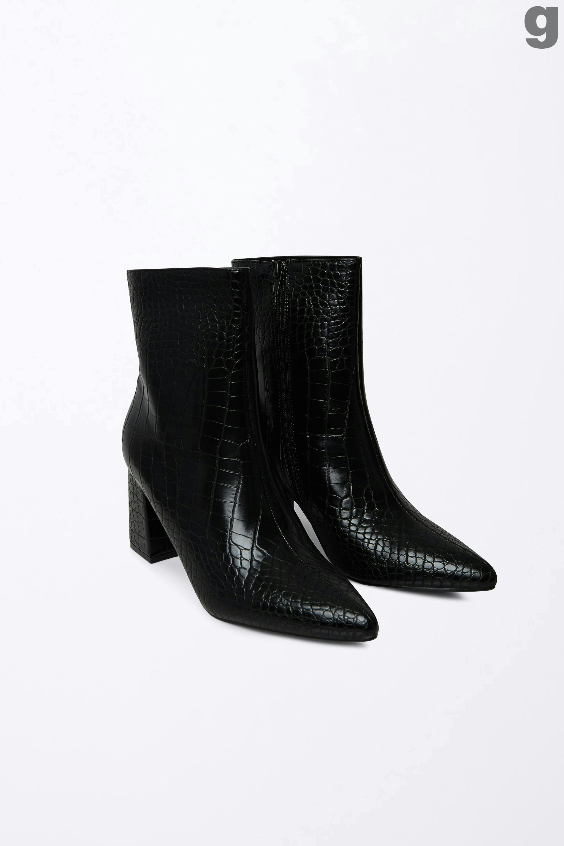Ankle high boots with a heel. The boots are black and have a crocodile pattern.