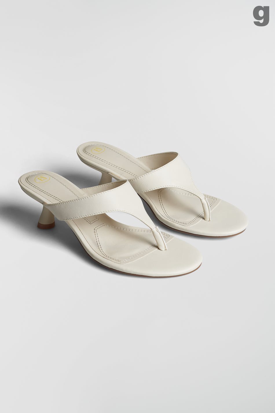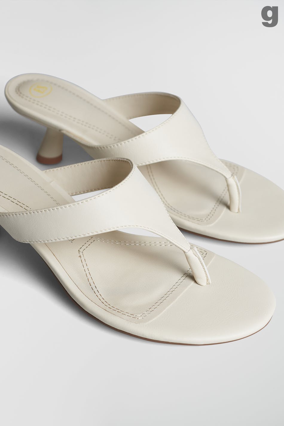 Designed by Emili Sindlev.. Sandals with a low kitten heel pump. The sandals are white and have a band over the feet.