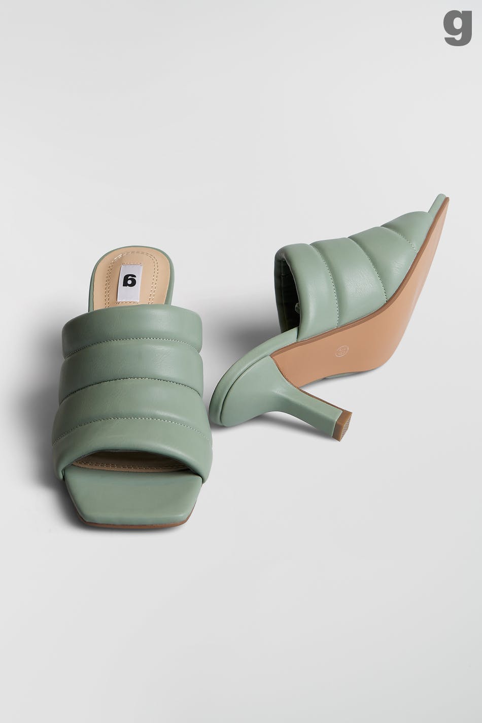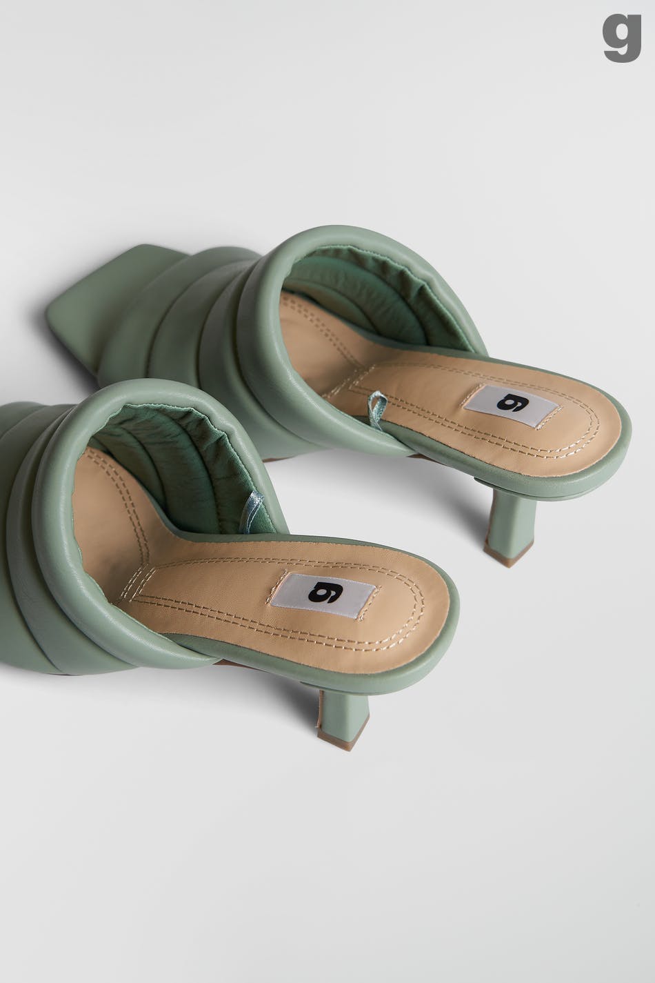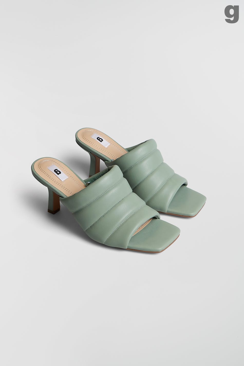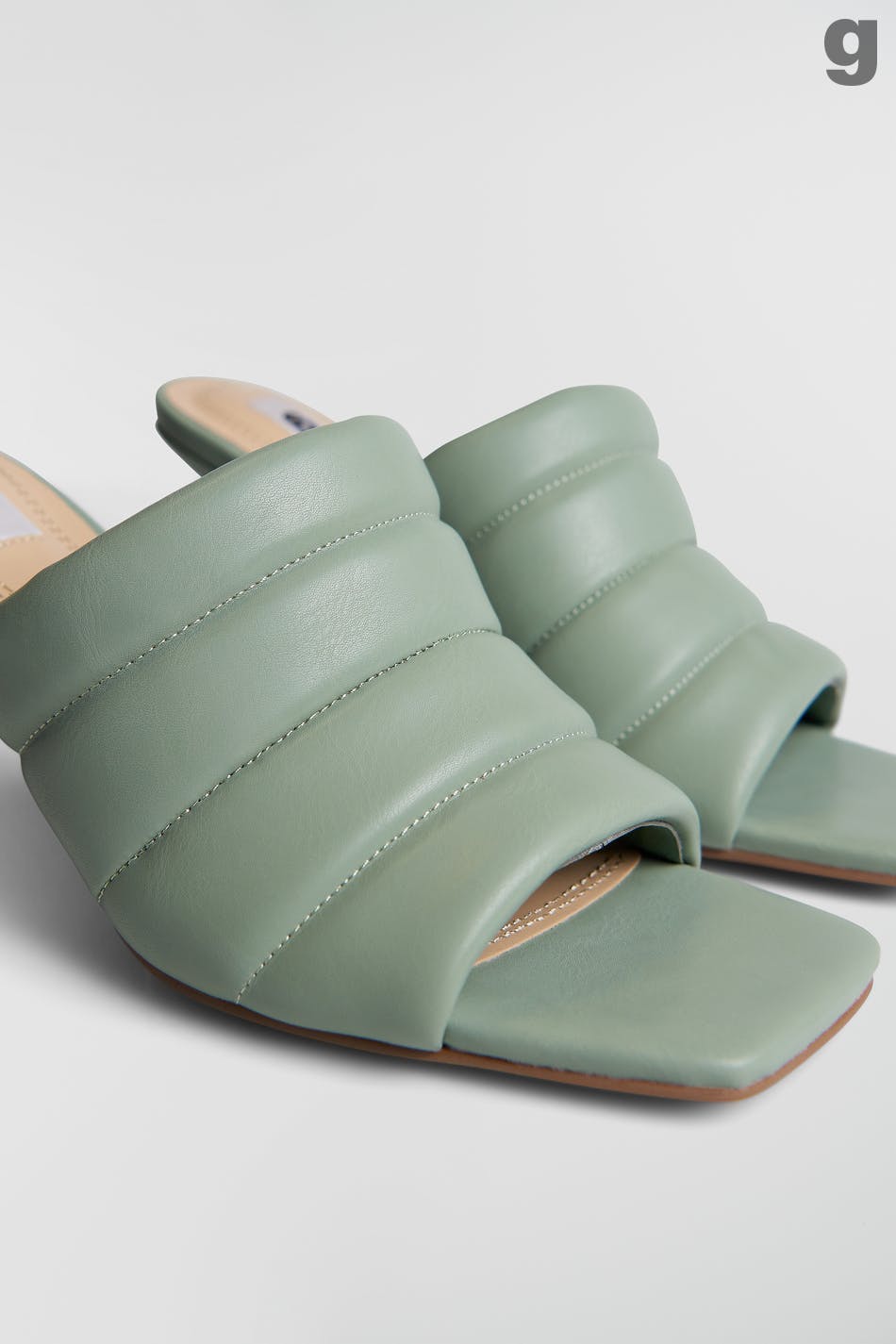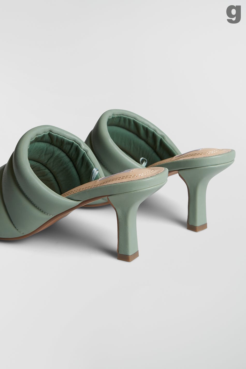 Heeled sandals with slip in-design. The sandals are green and have a peep toe. They have slim heels and a faux-leather, padded top part.