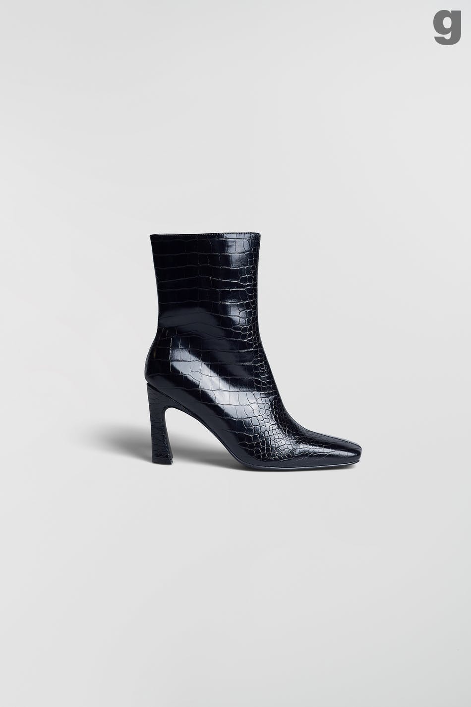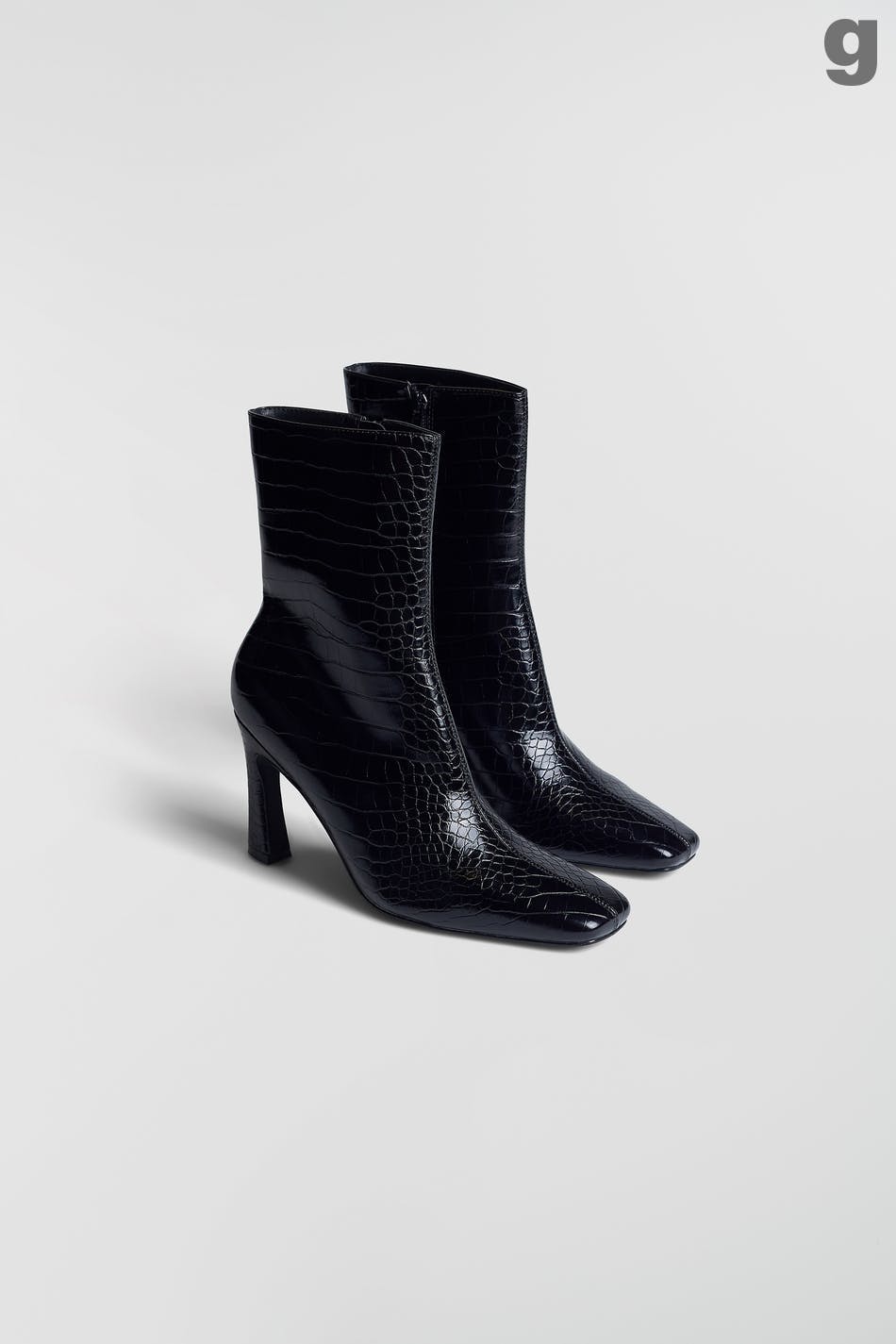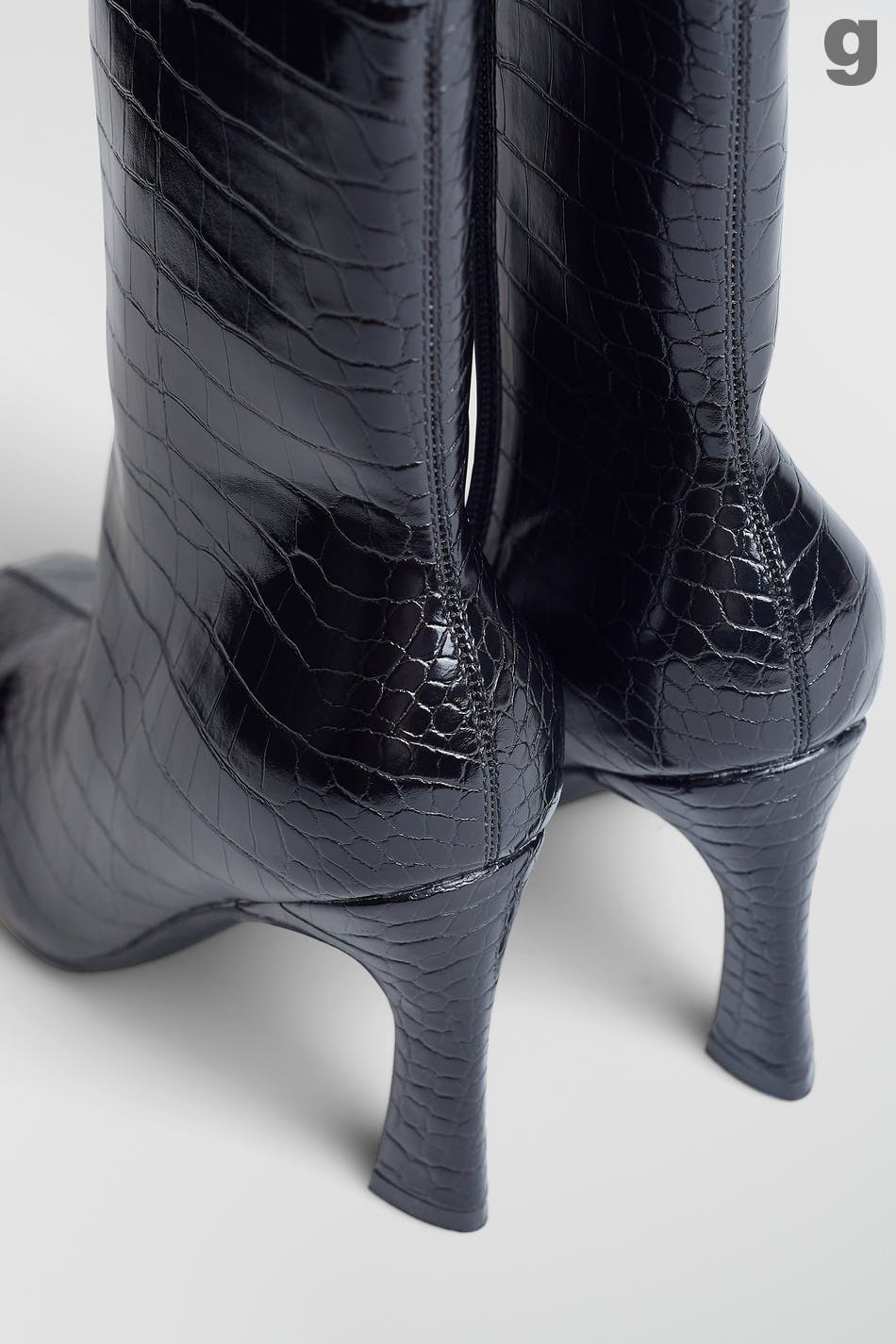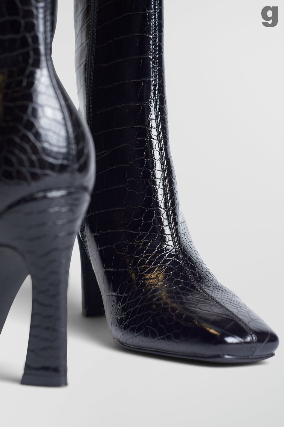 High-heeled boots with a zip on the inside. The boots are black and have a crocodile pattern.