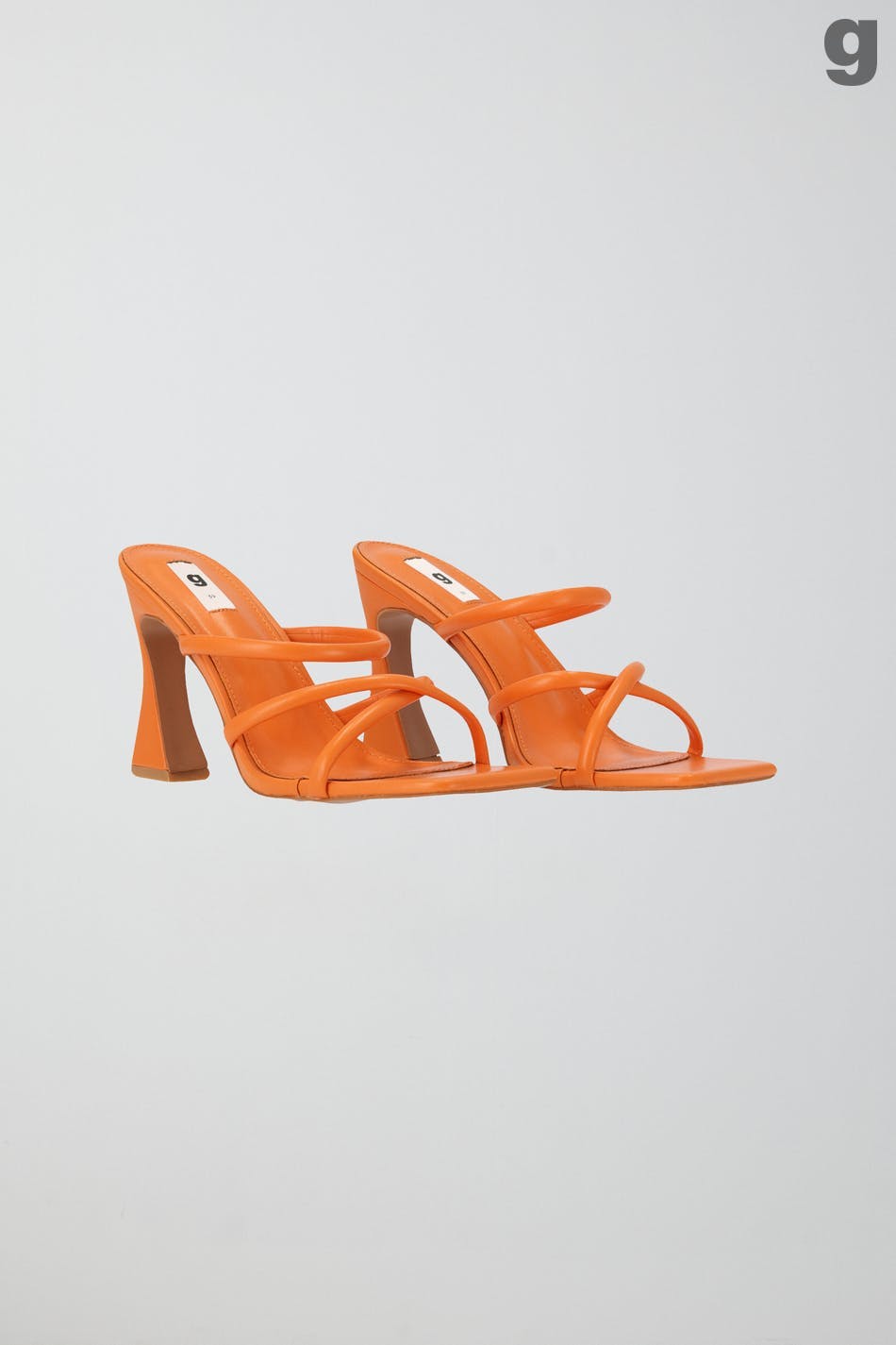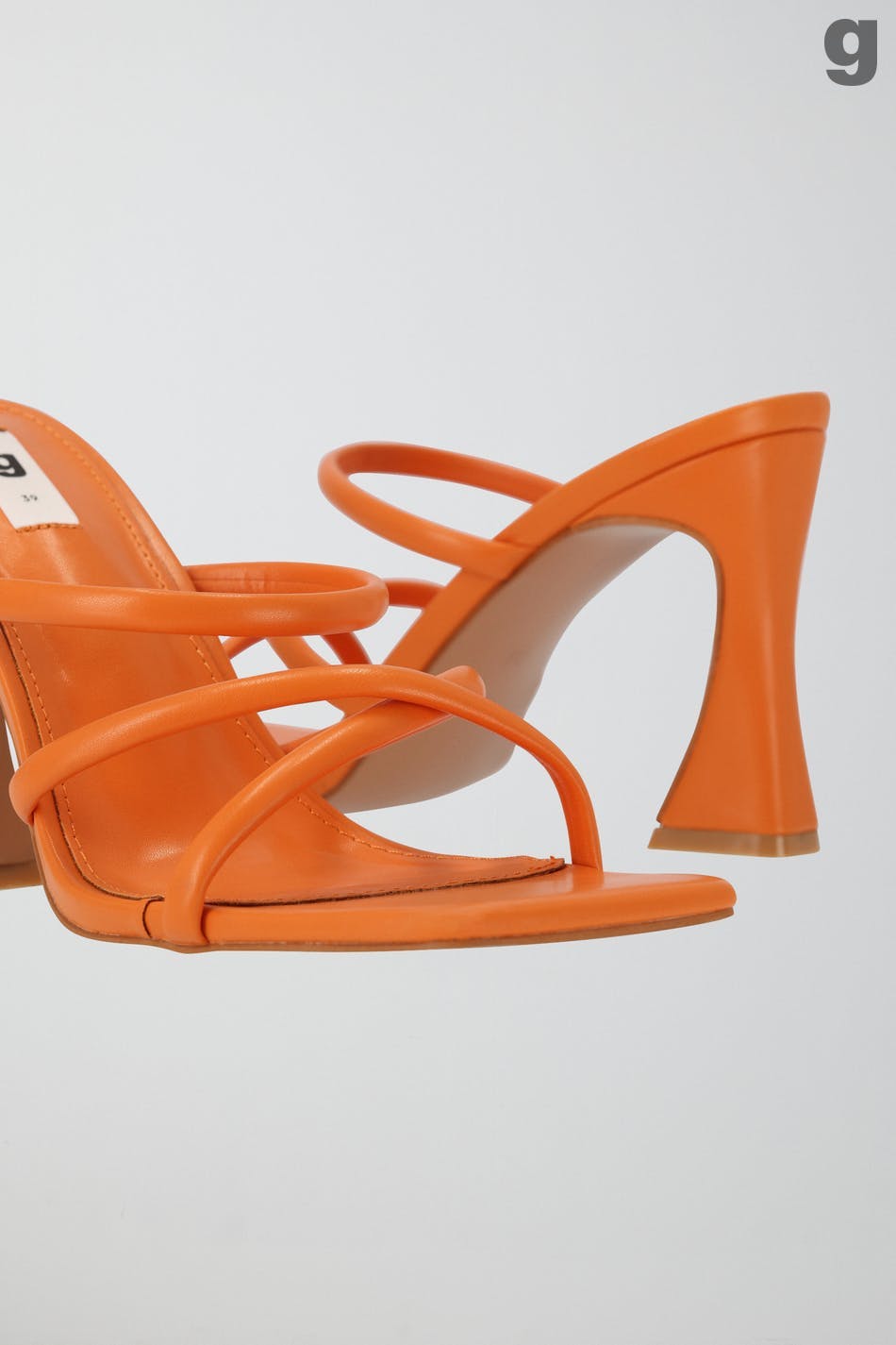 High-heeled sandals in imitation leather with padded foot straps. The sandals are orange and have squared toe.