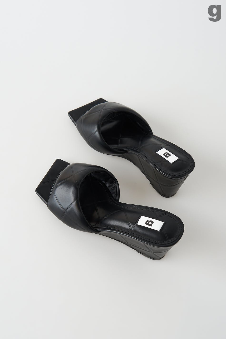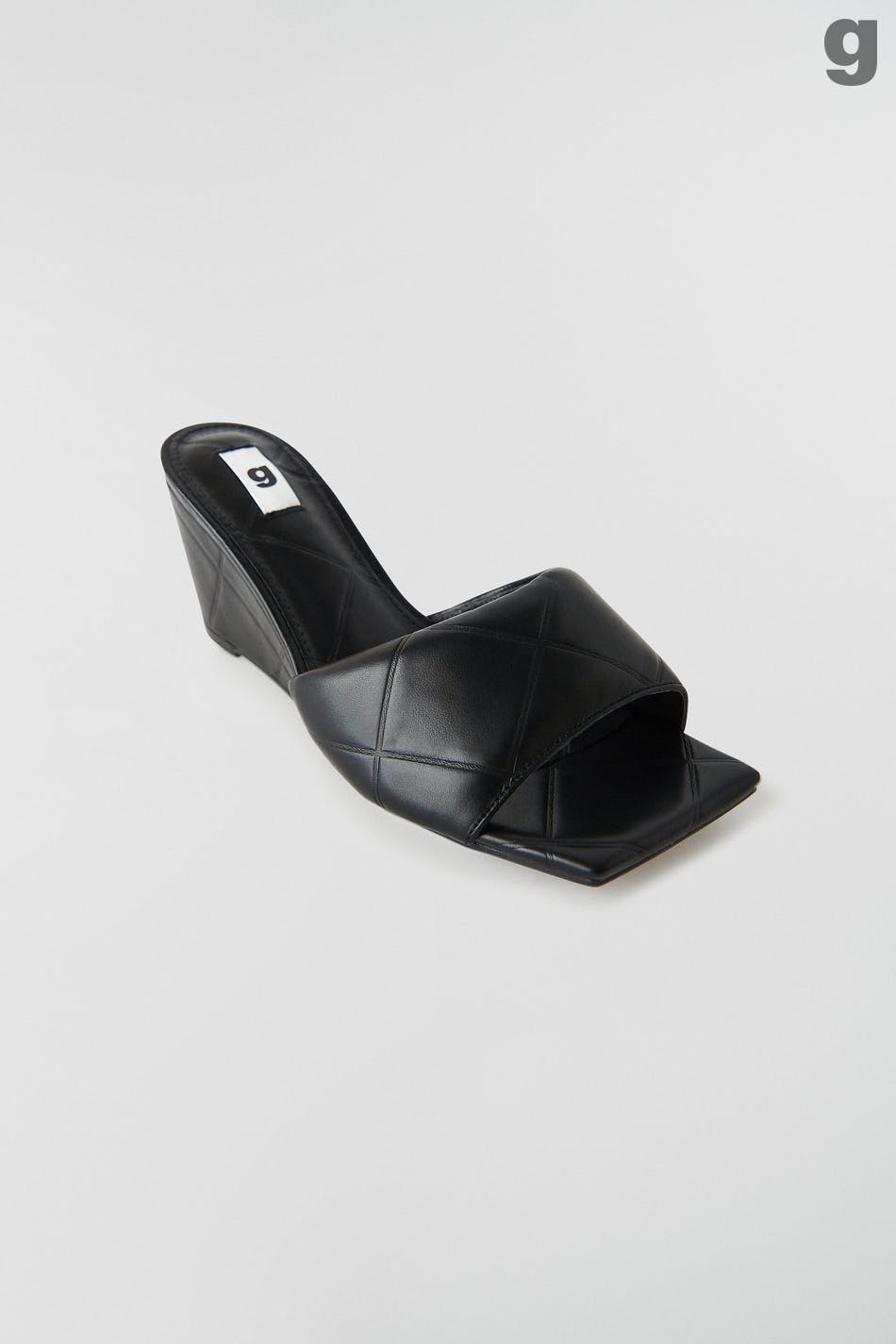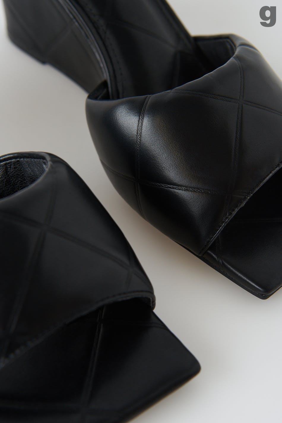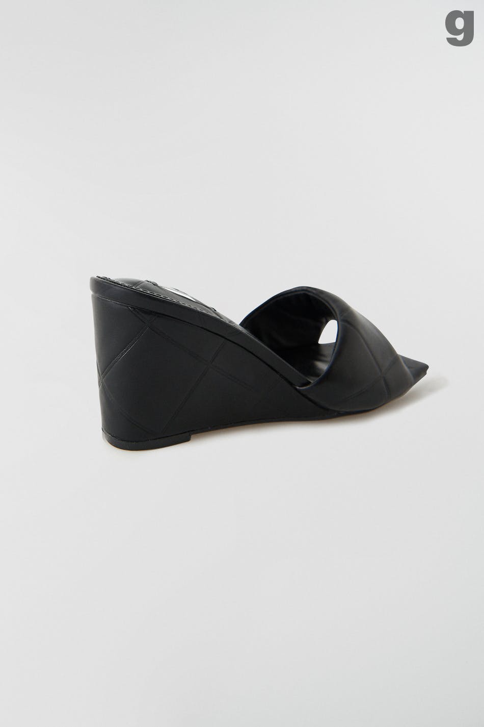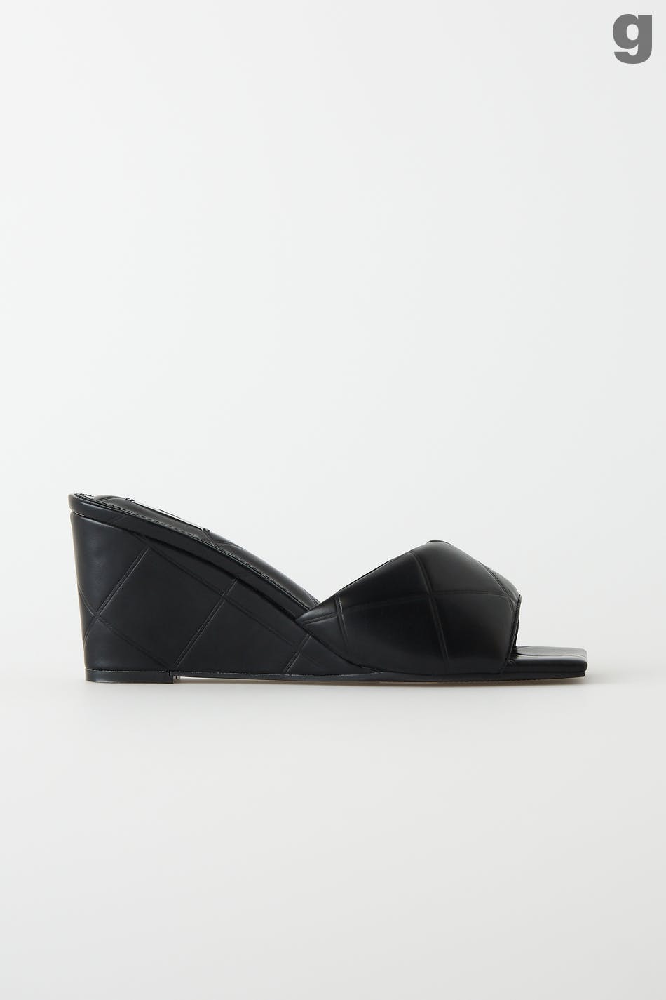 Sandals in PU with wedge heel. The sandals are black and have wide foot strap with peep toe. They have slip in-design, squared toe and a quilted pattern.