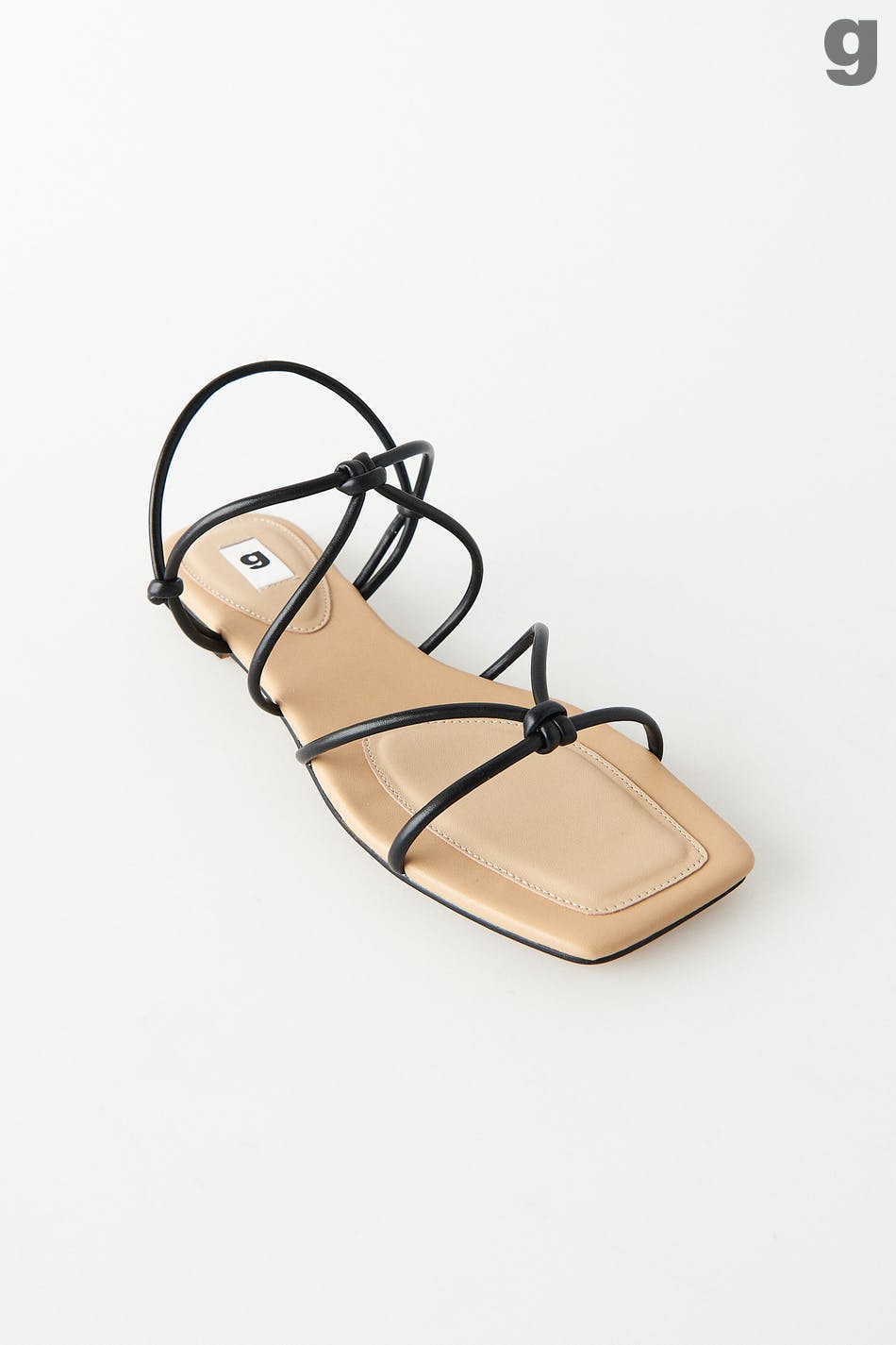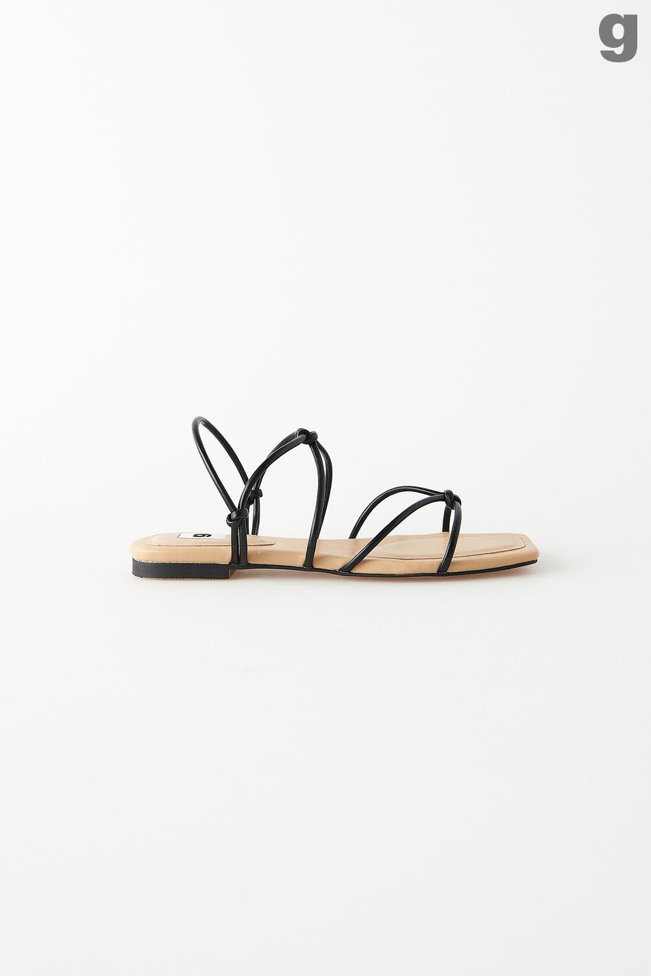 Flat sandal with a beige sole. The sandal is black and has thin straps. It has a slip in-design in imitation leather and knot details on the sides and at the front.