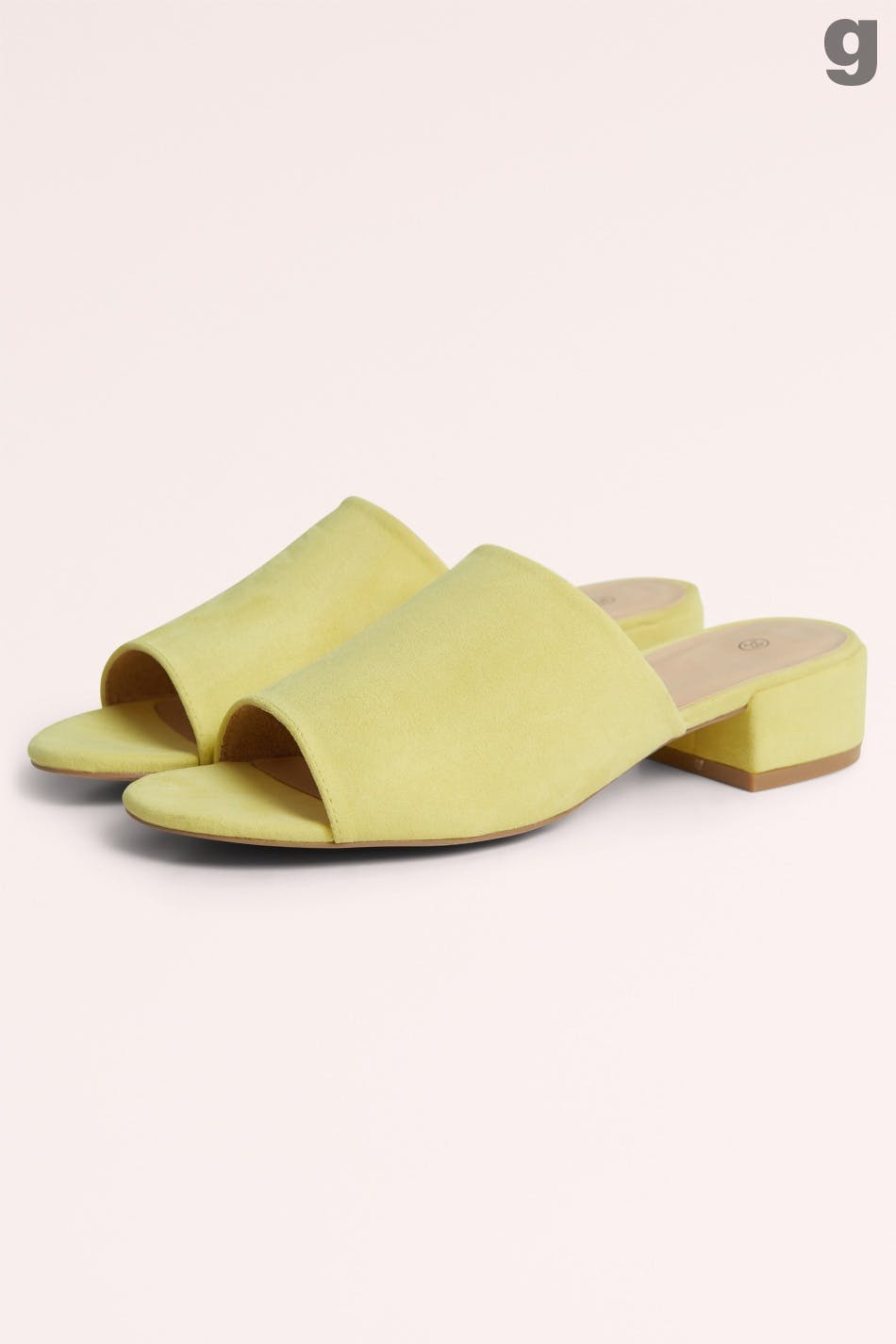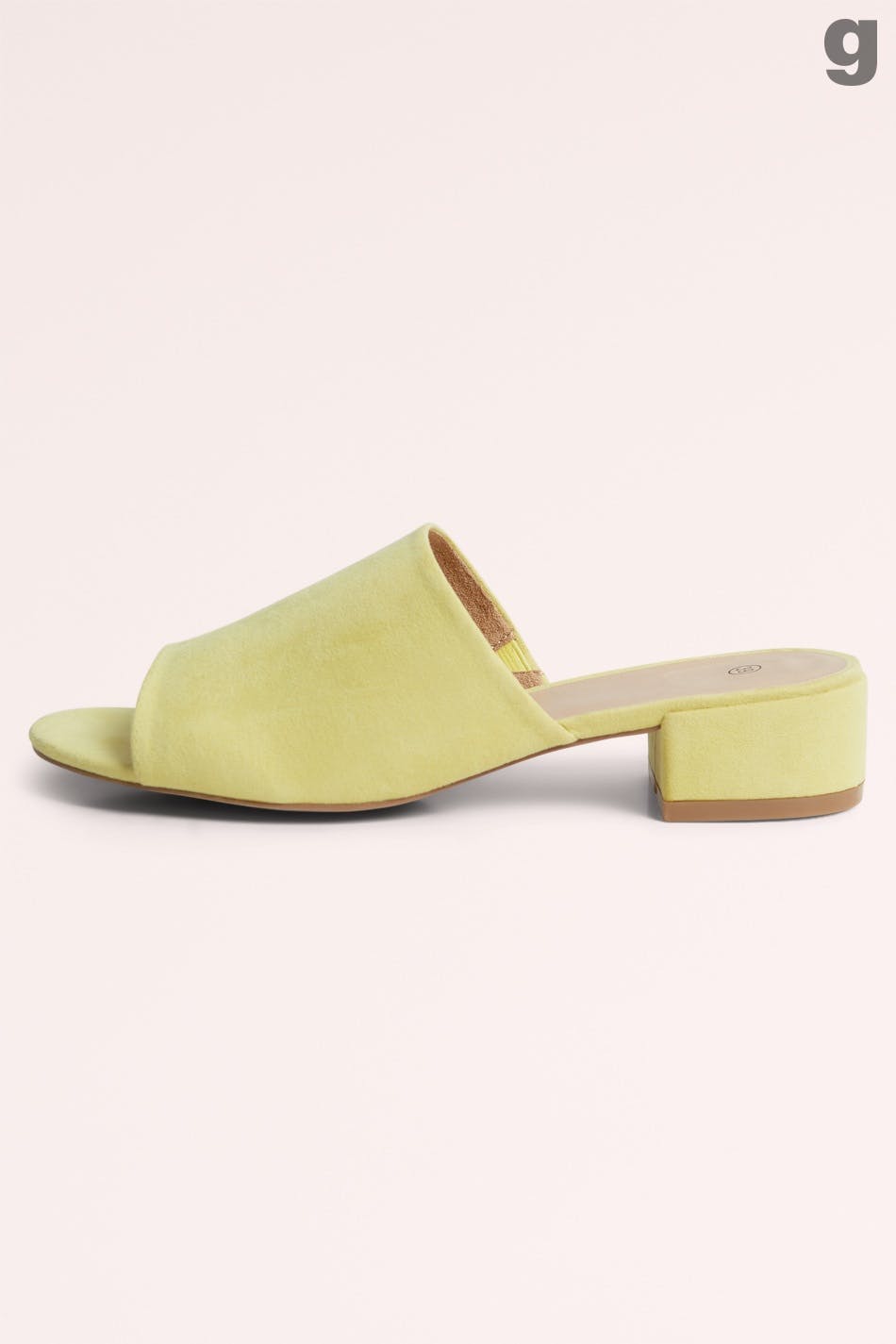 Shoes with a low heel height. The shoes are yellow and have a peep toe.