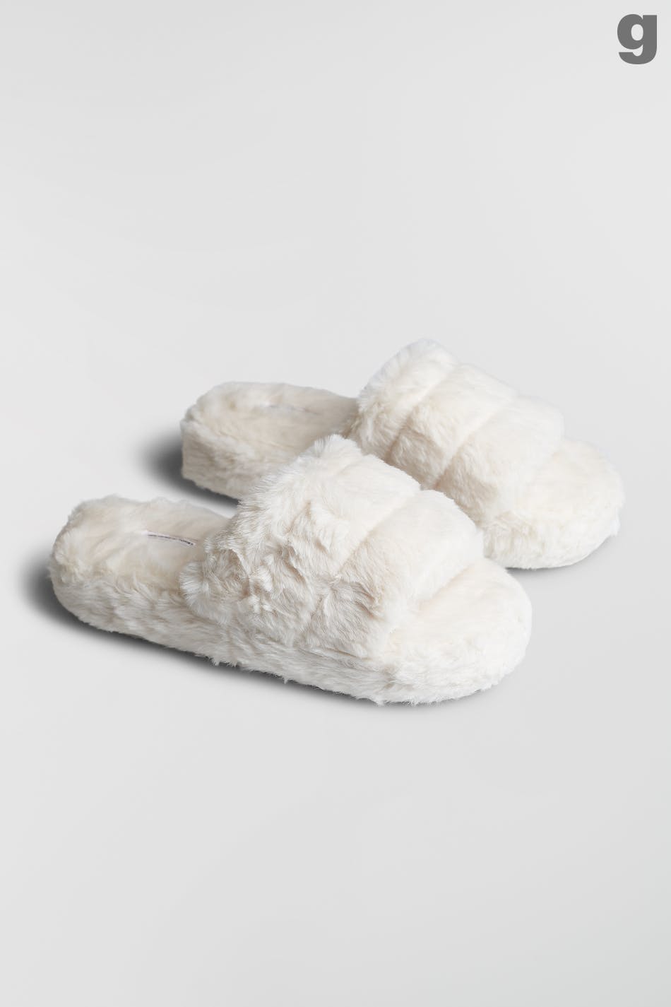Fluffy slippers by our Young assortment with faux fur. The slippers are white and cosy and have a soft quality. They have faux fur and a slip in-design.