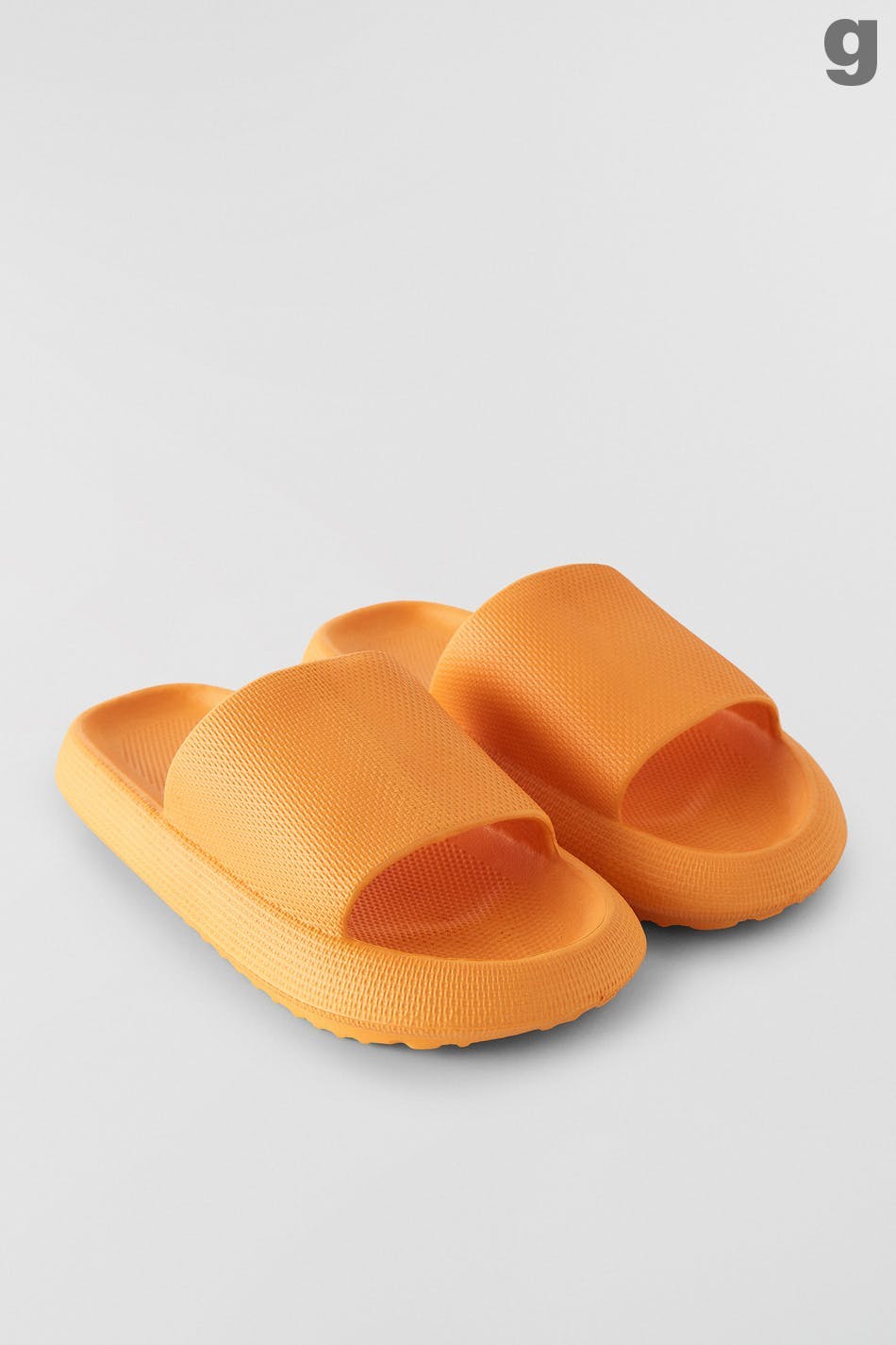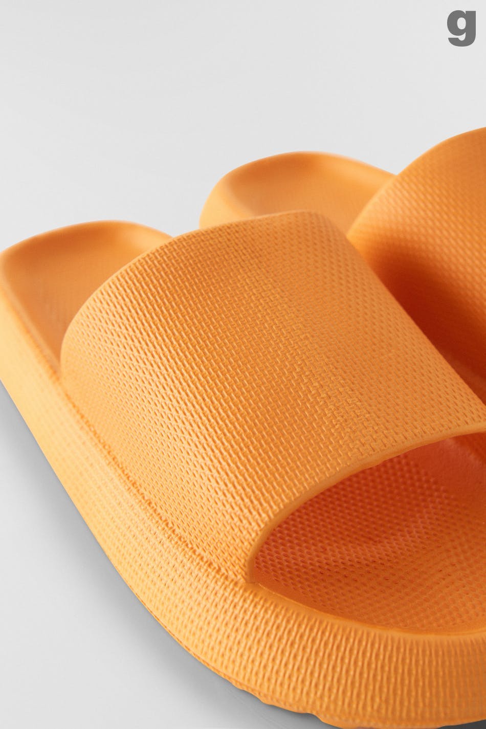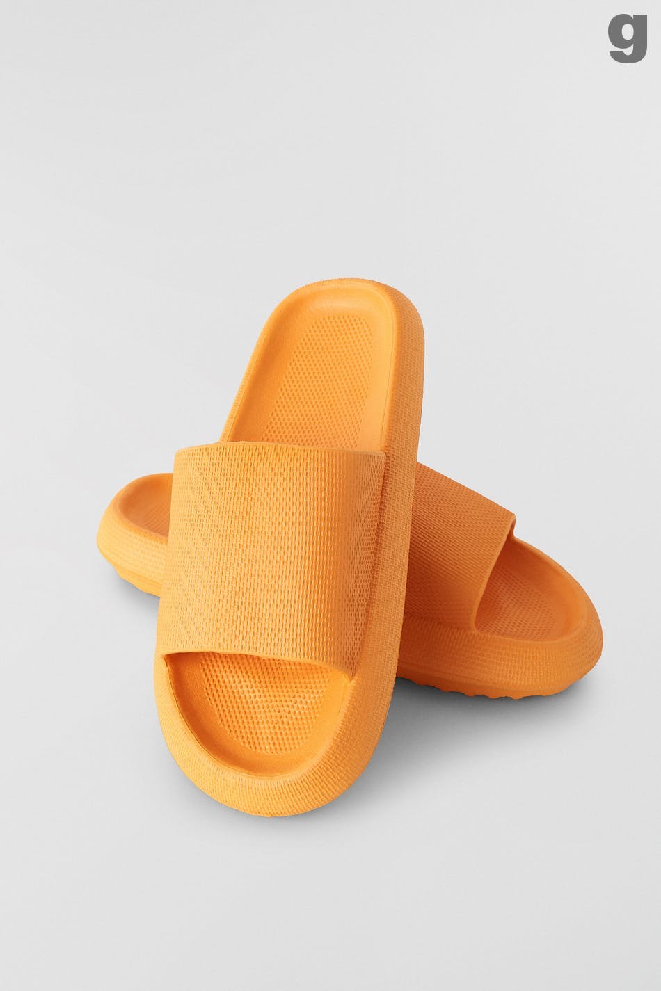 Slippers with slip in-design. The slippers are orange and have a chunky fit with high sole. They have peep toe and wide foot straps.