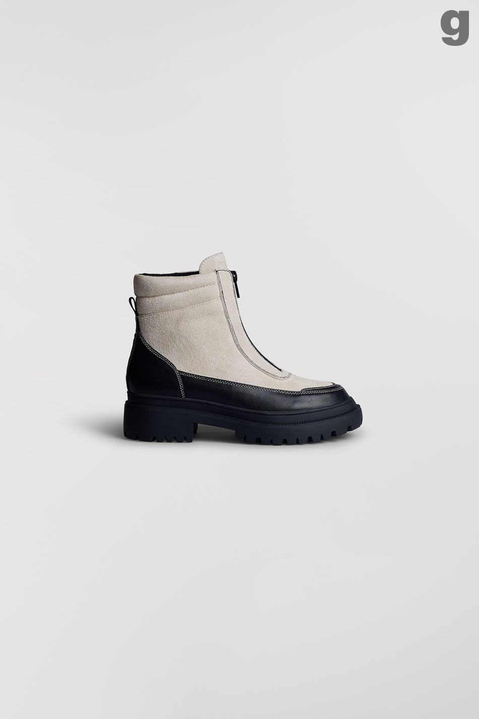 Boots with chunky sole. The boots are light beige and have black details. They have a round toe and a zip closure at the front.