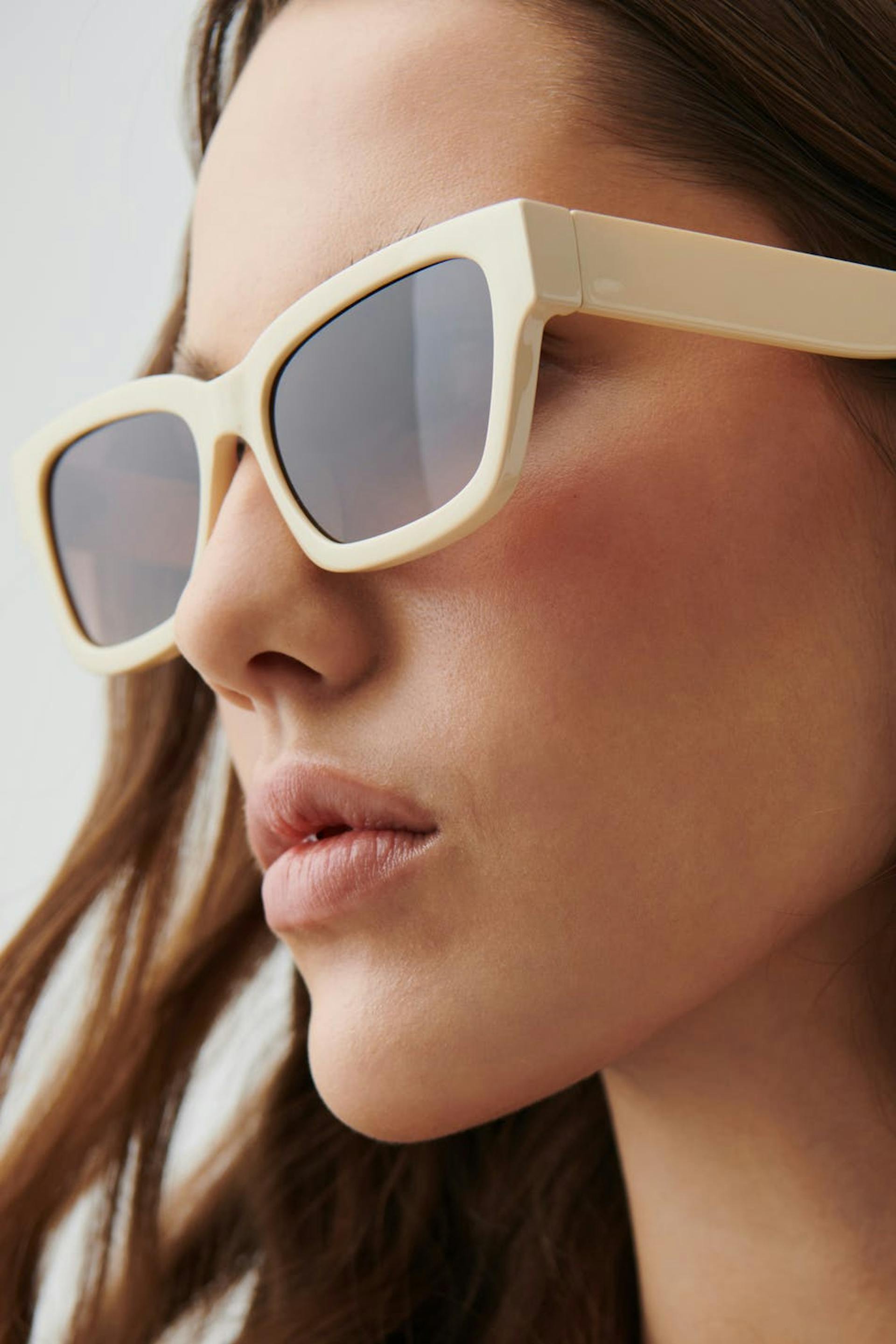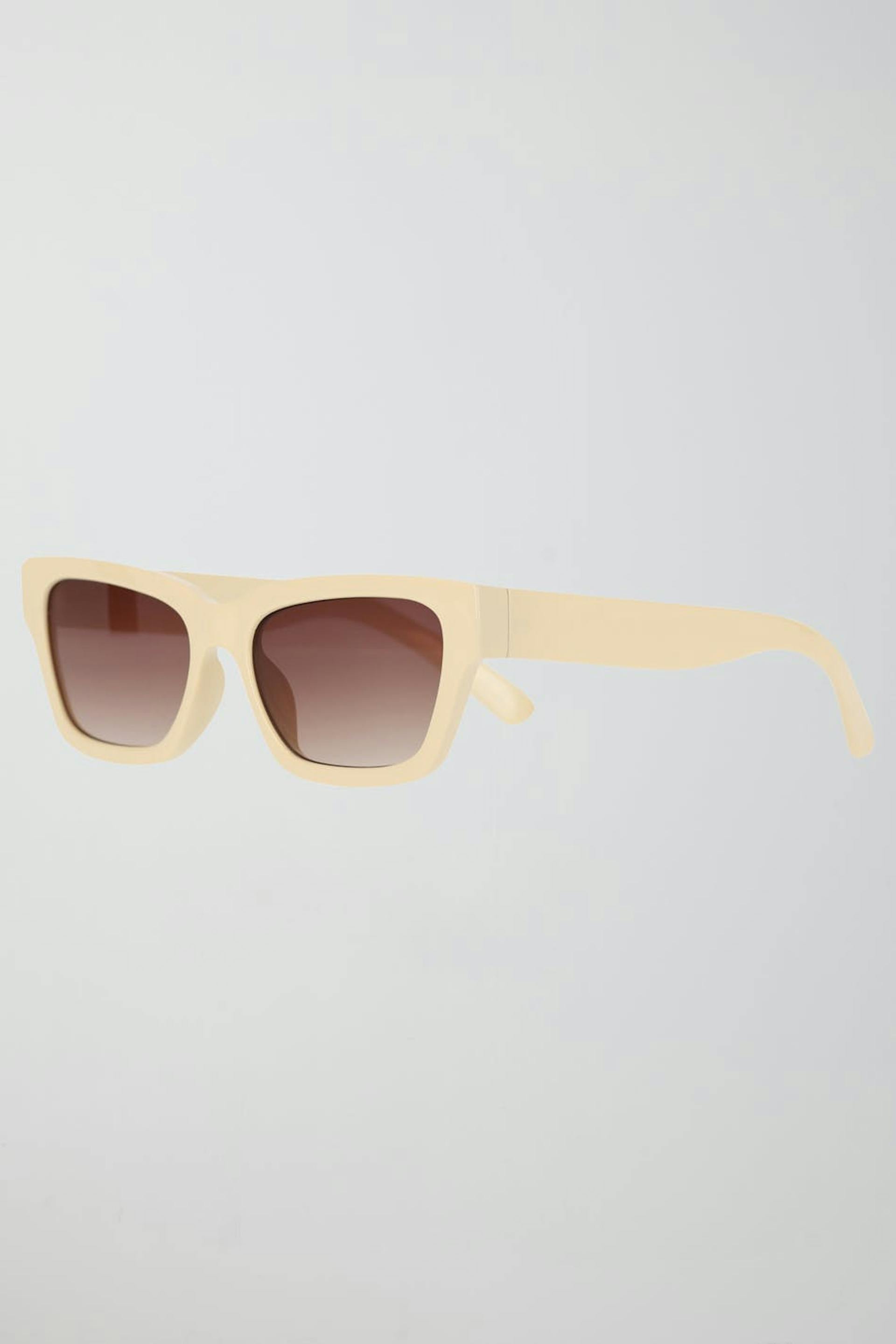 Sunglasses with plastic frames in recycled plastic. The sunglasses is beige and has tinted glasses with UV400 protection.