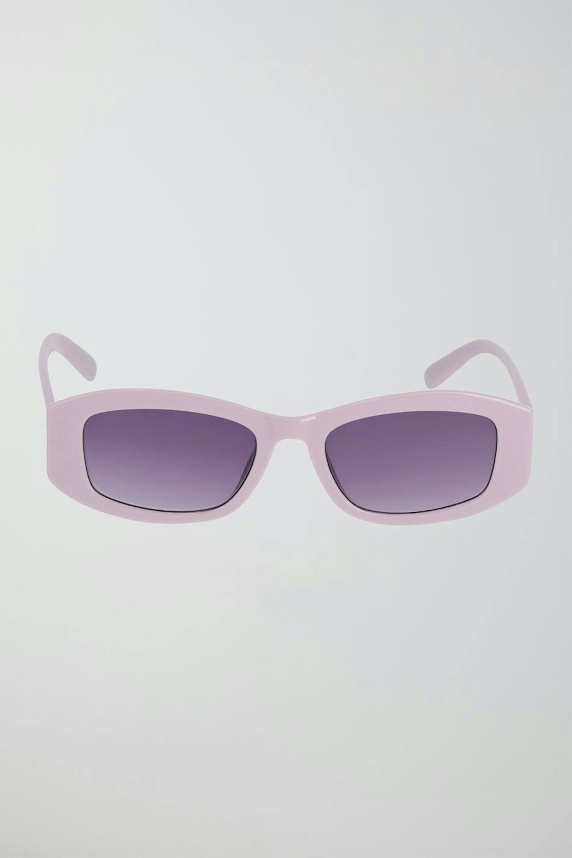 Slim sunglasses with plastic frames in 100% recycled plastic. The sunglasses is purple and has tinted glasses with UV400 protection.