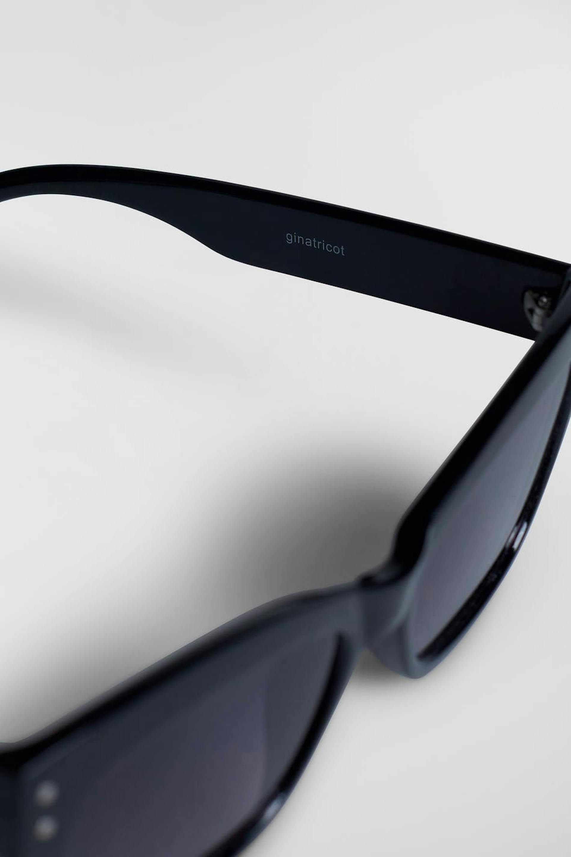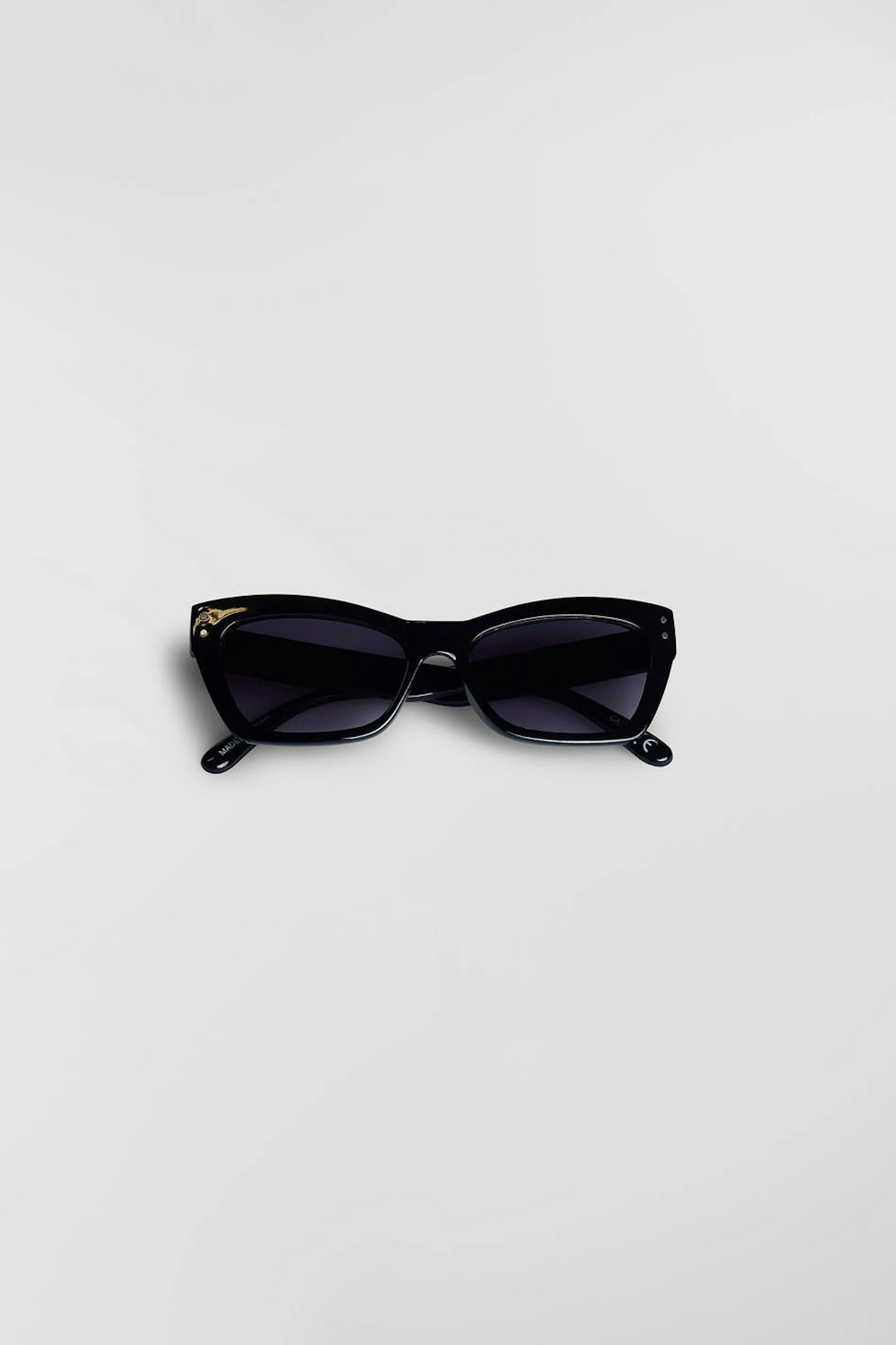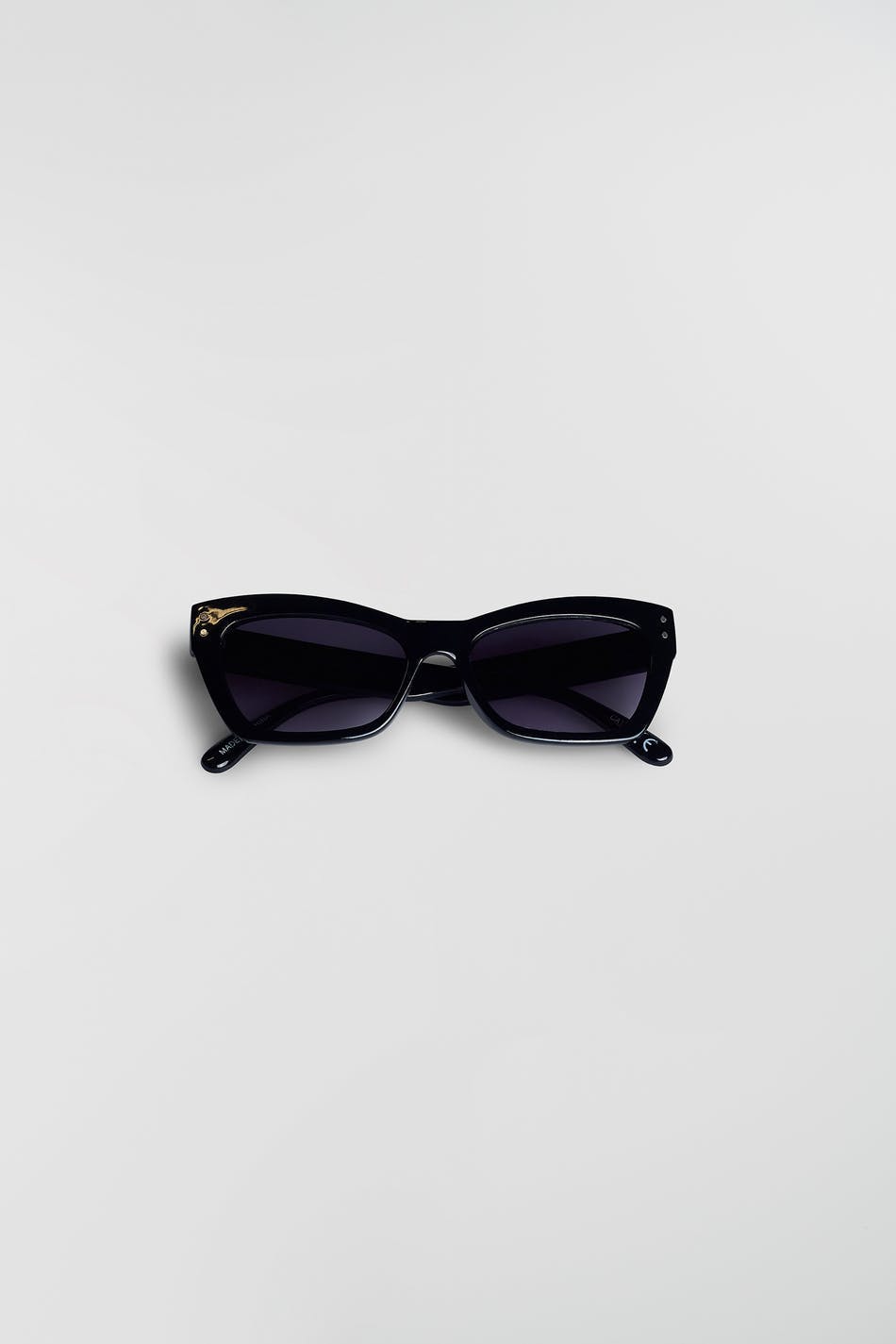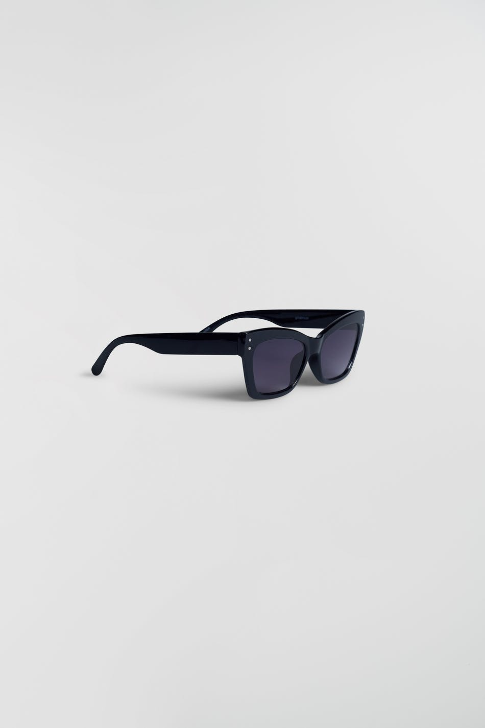 Sunglasses with an angled cat-eye design. The sunglasses are black and have a frame in plastic.
