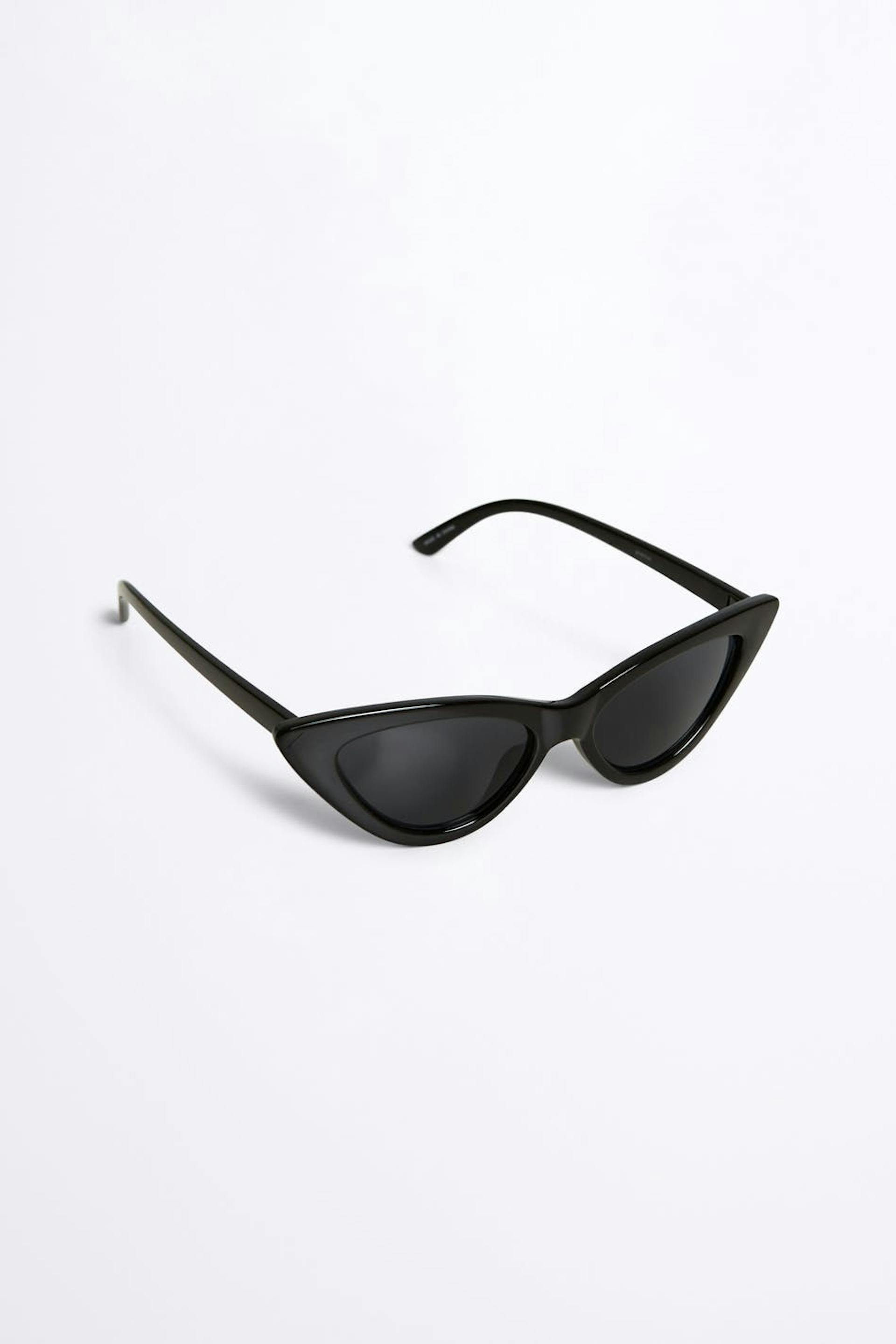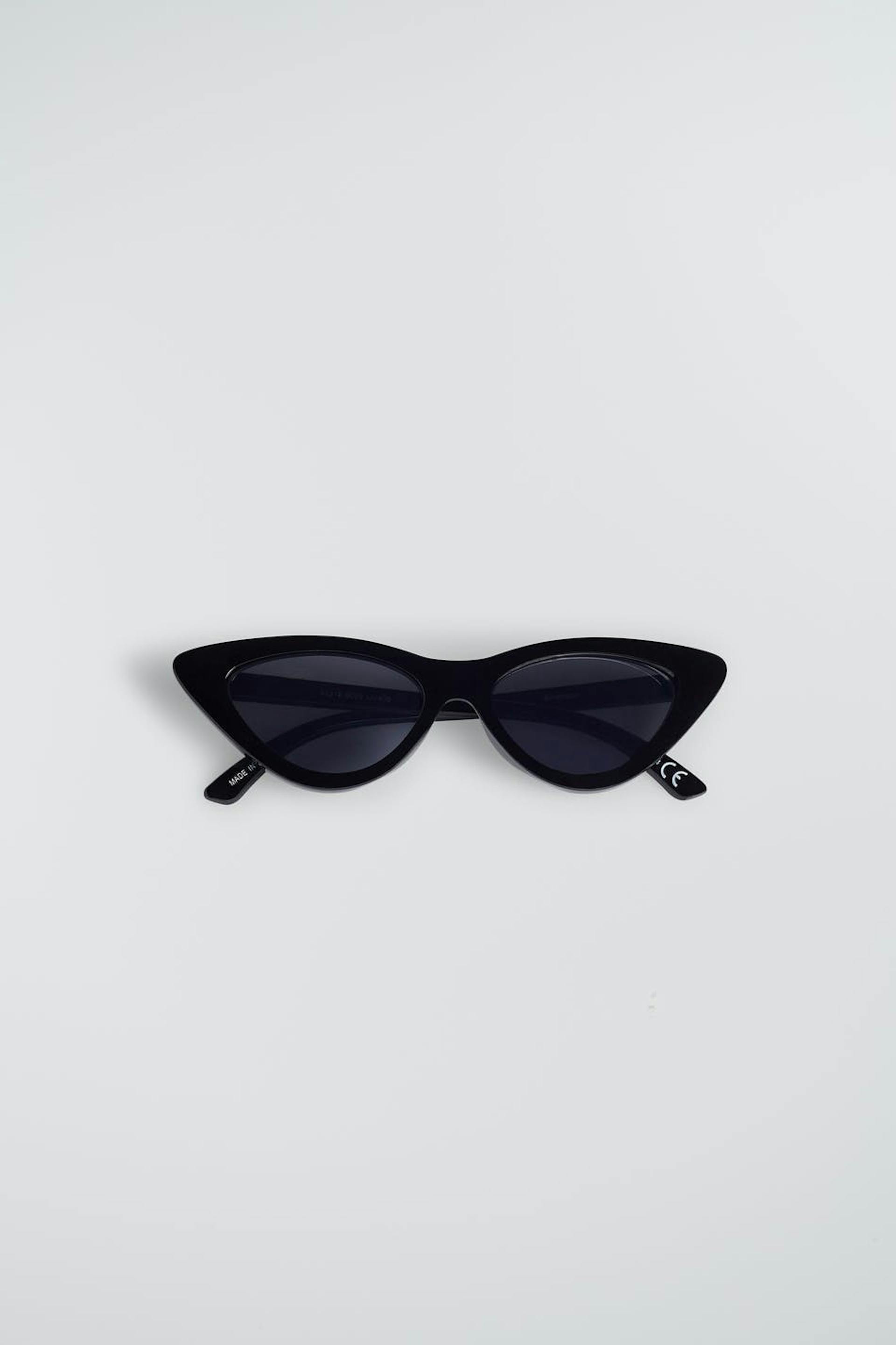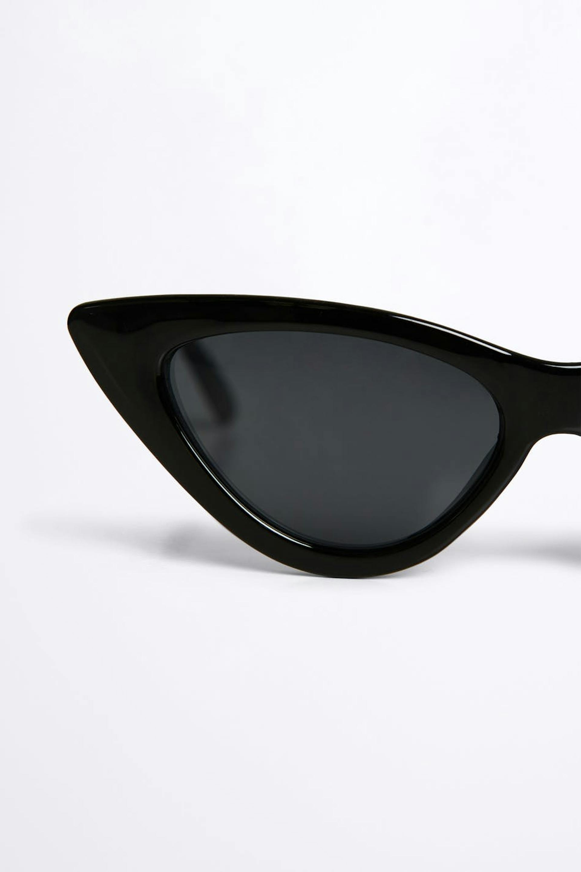 Slim sunglasses with a cat-eye design. The sunglasses are black.