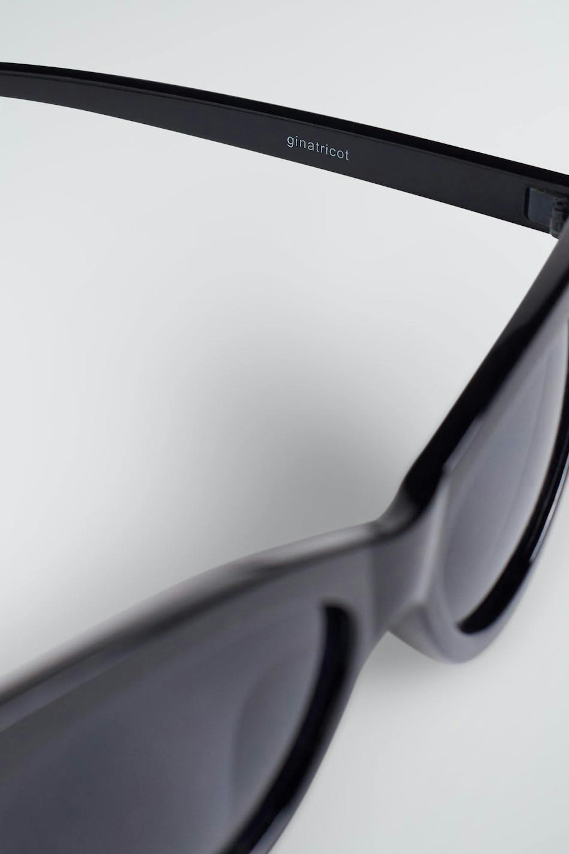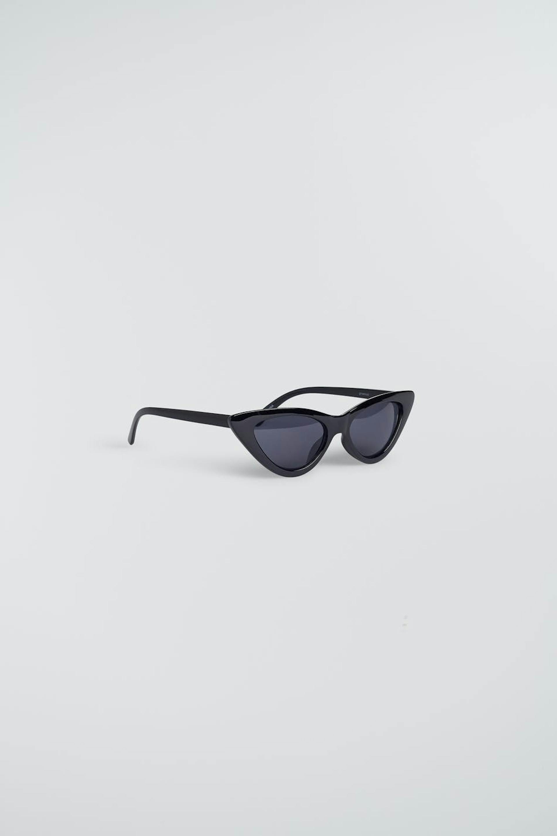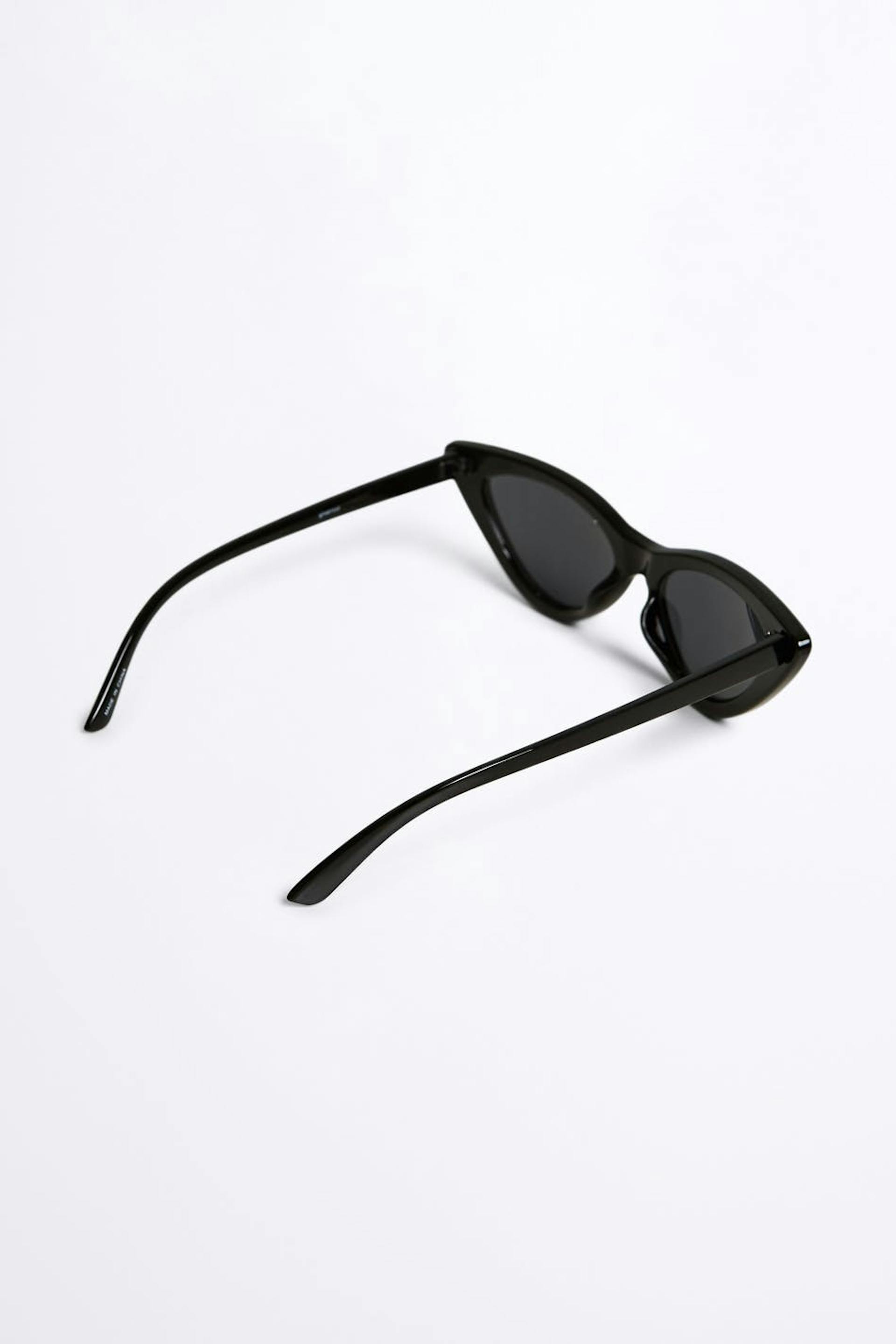 Slim sunglasses with a cat-eye design. The sunglasses are black.
