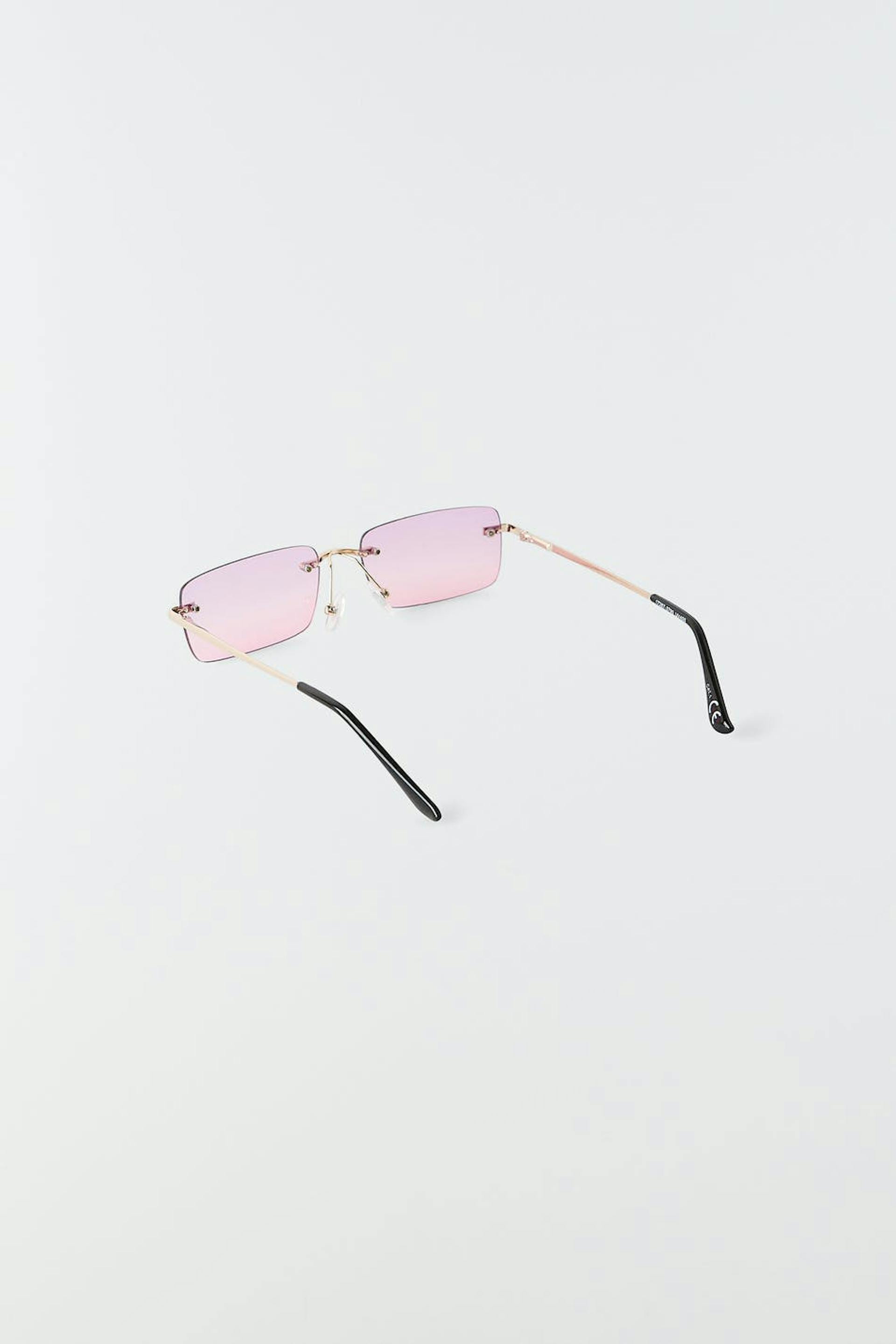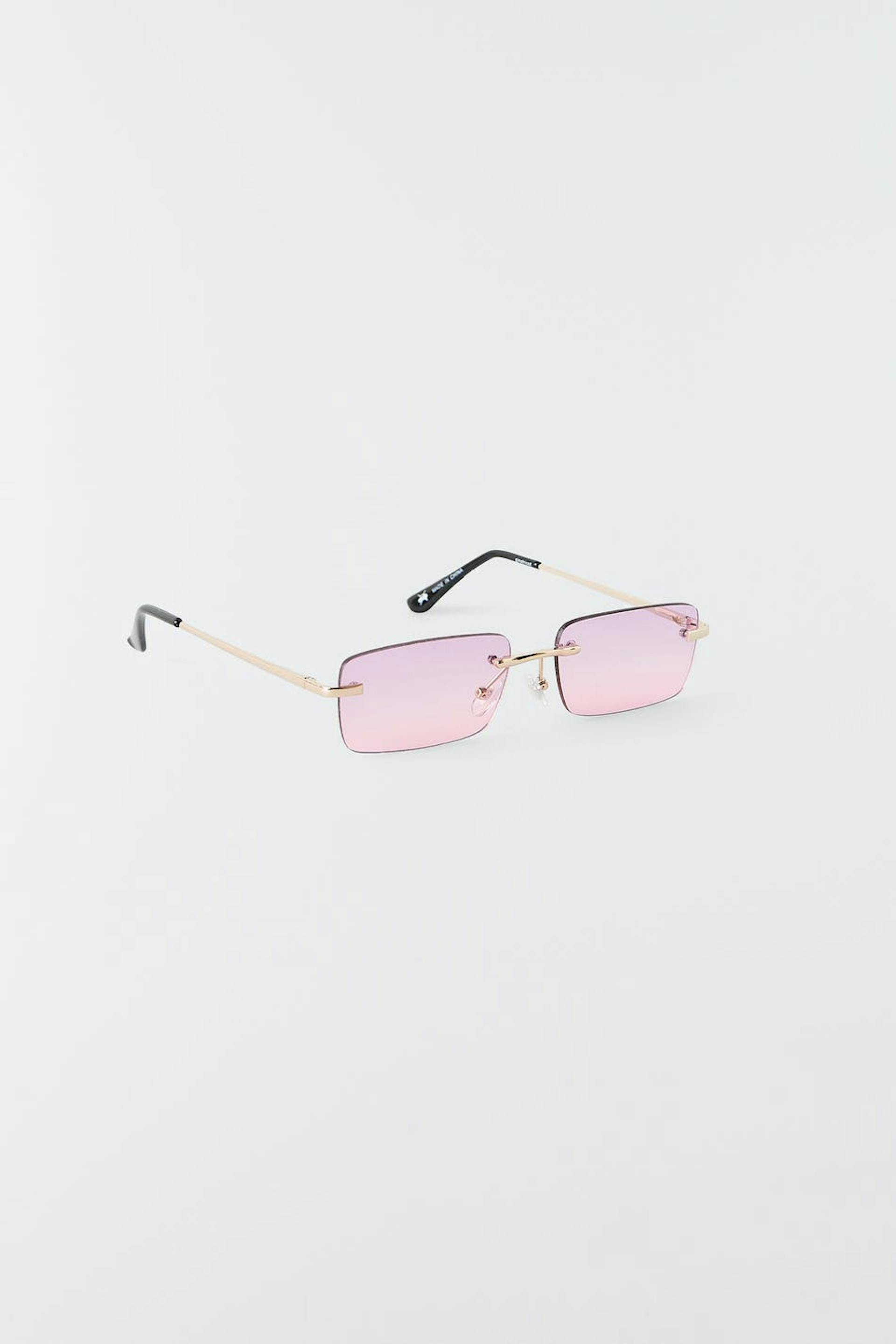 Rectangular sunglasses with gold coloured metal frame. The sunglasses is pink.