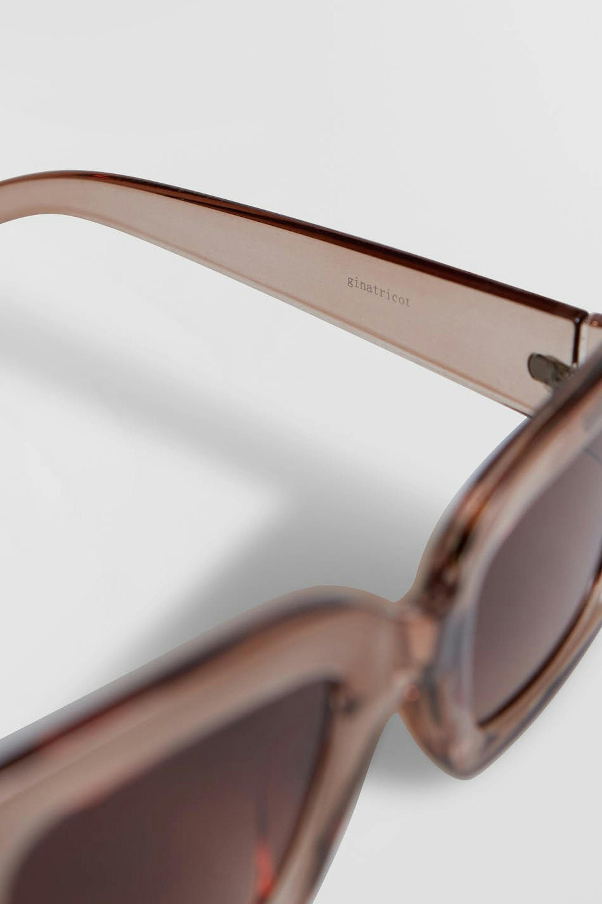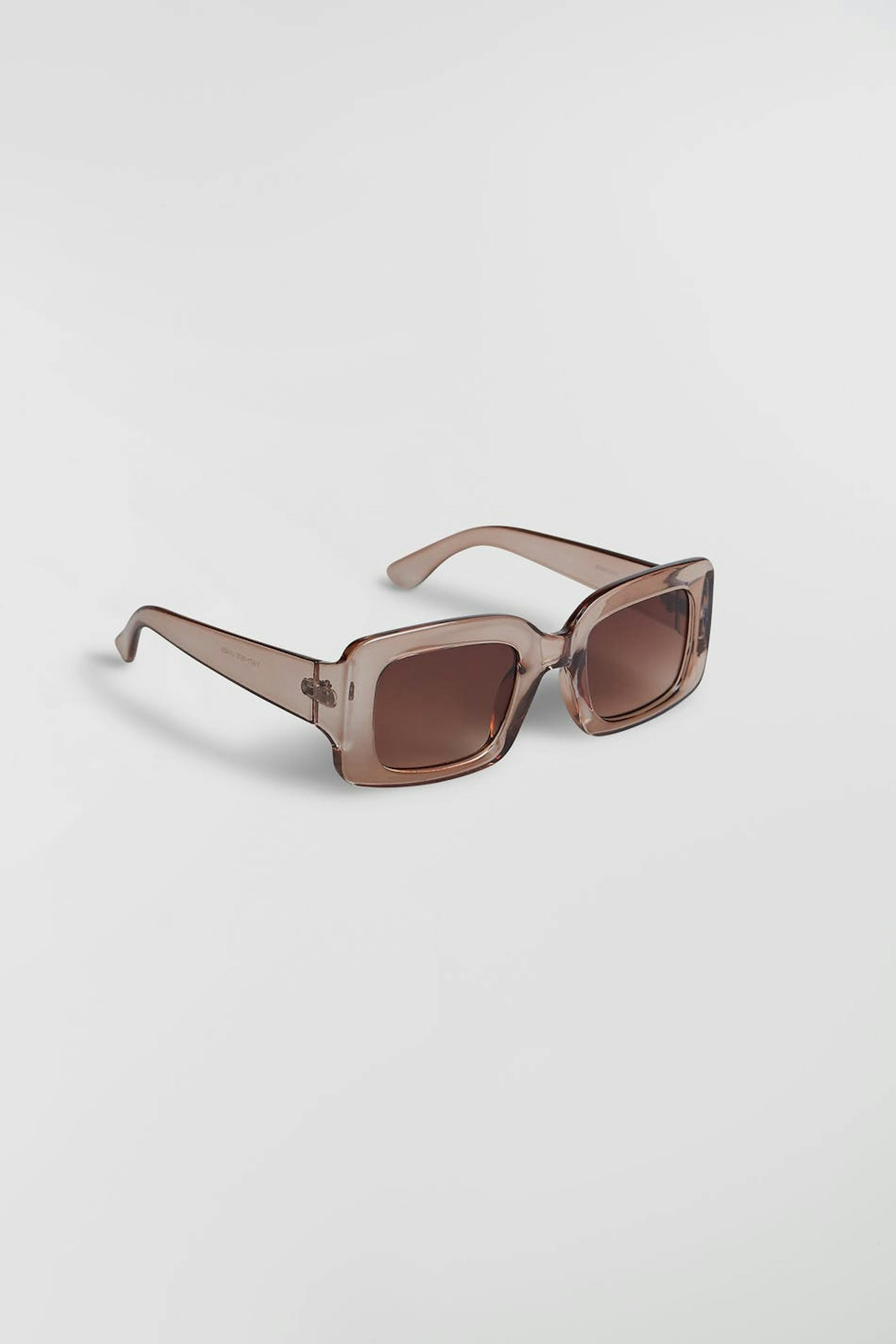 Rectangular sunglasses with a big plastic frame. The sunglasses are beige.