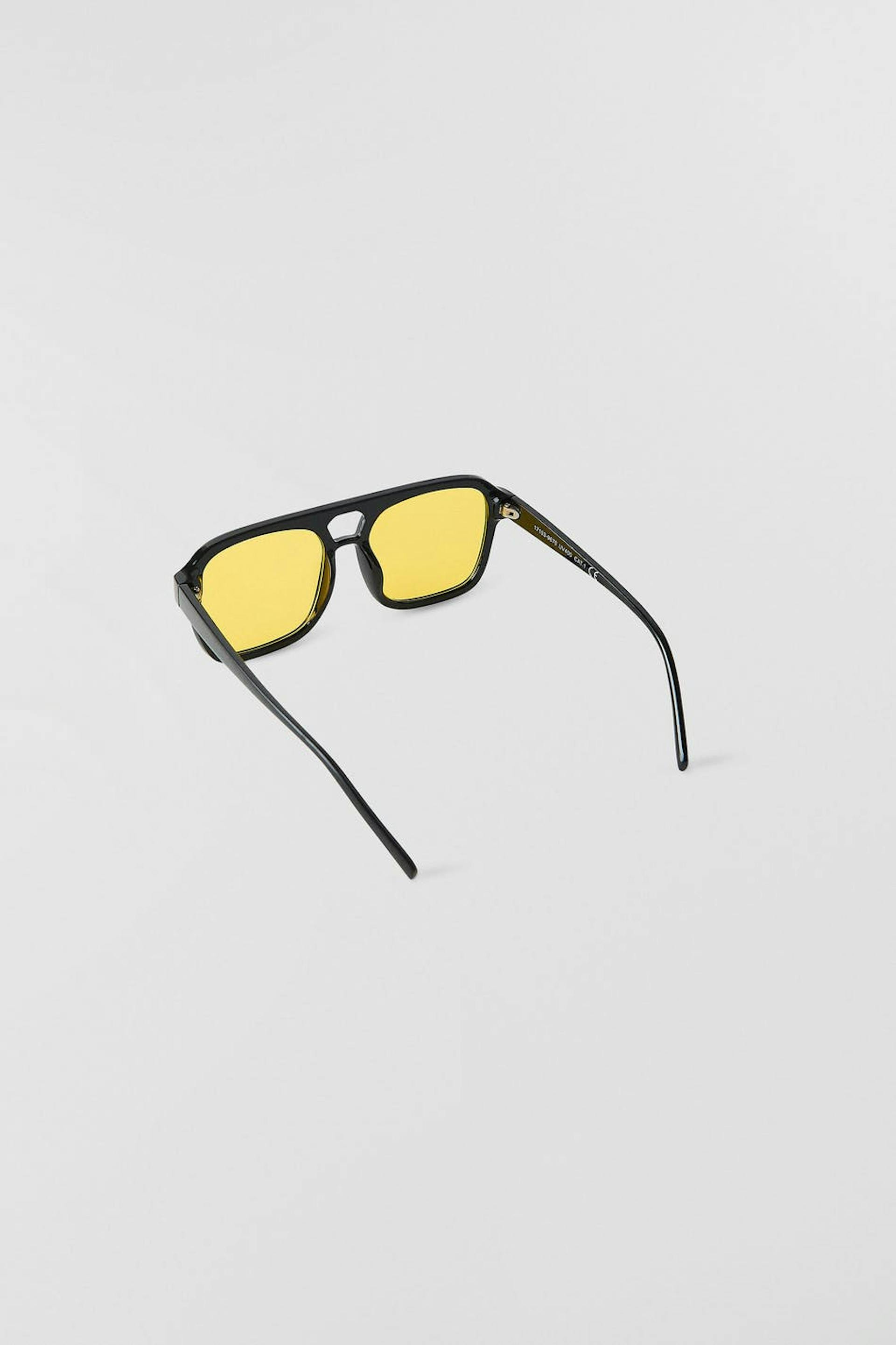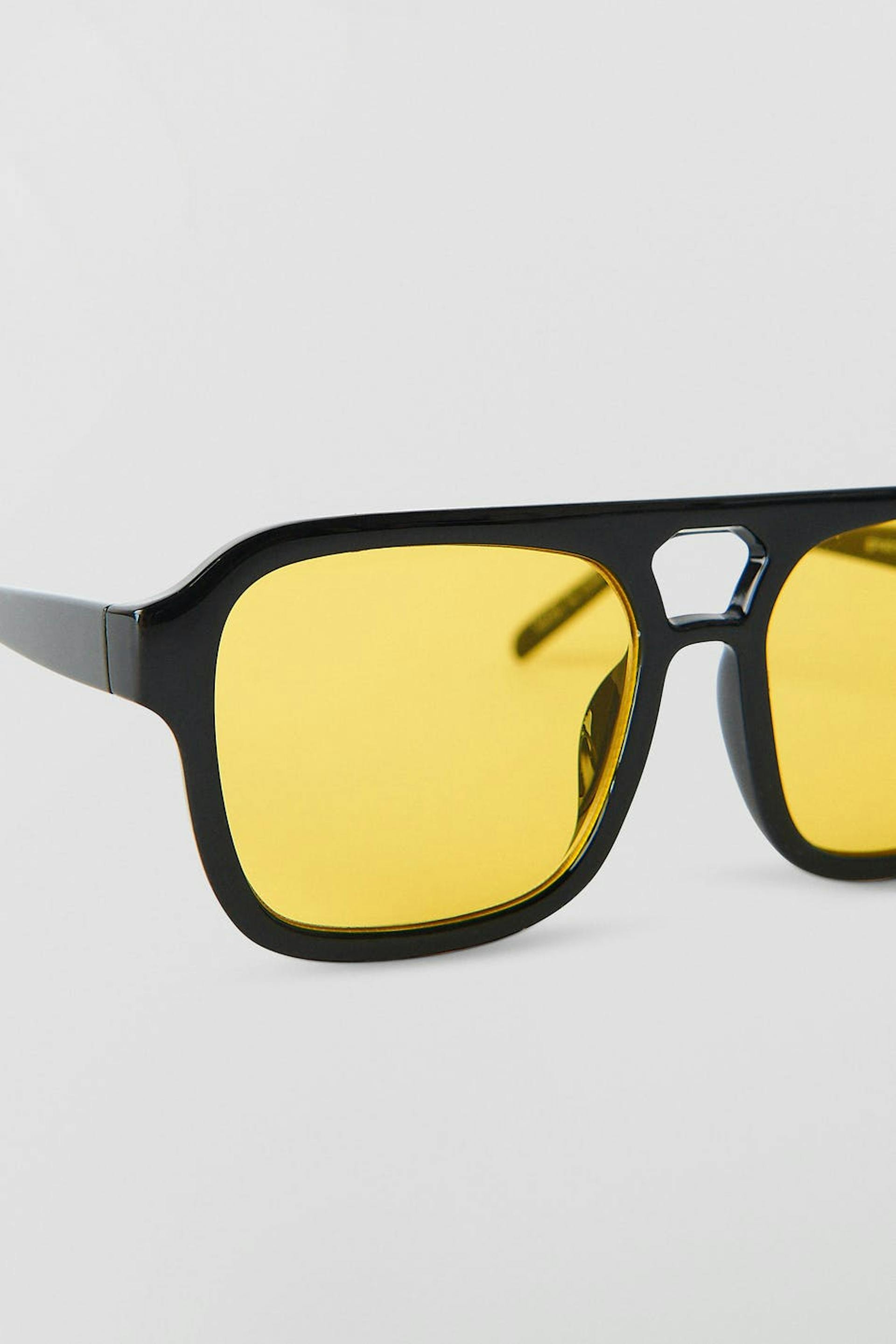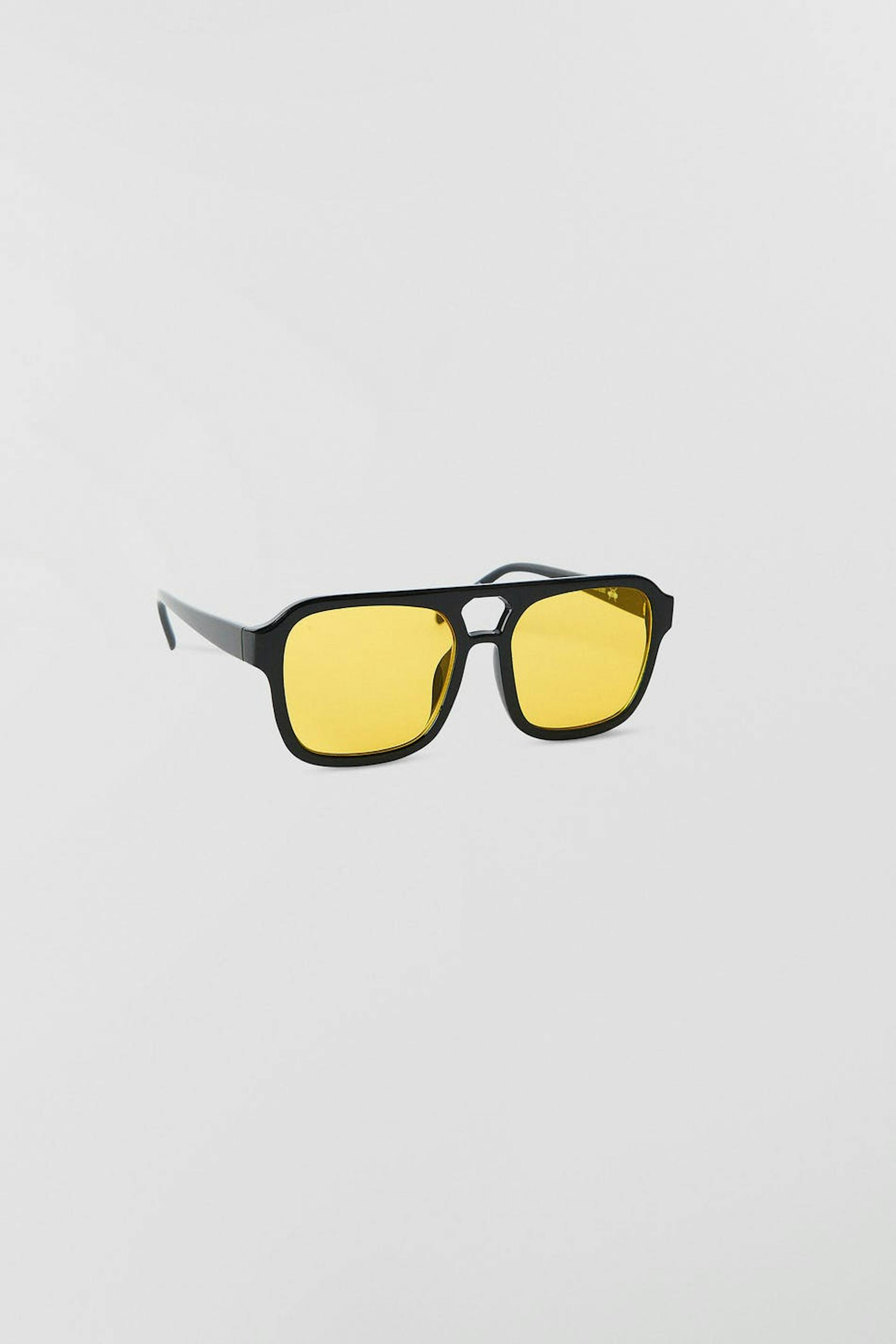 Big sunglasses with yellow glasses. The sunglasses is black and has frames in plastic.