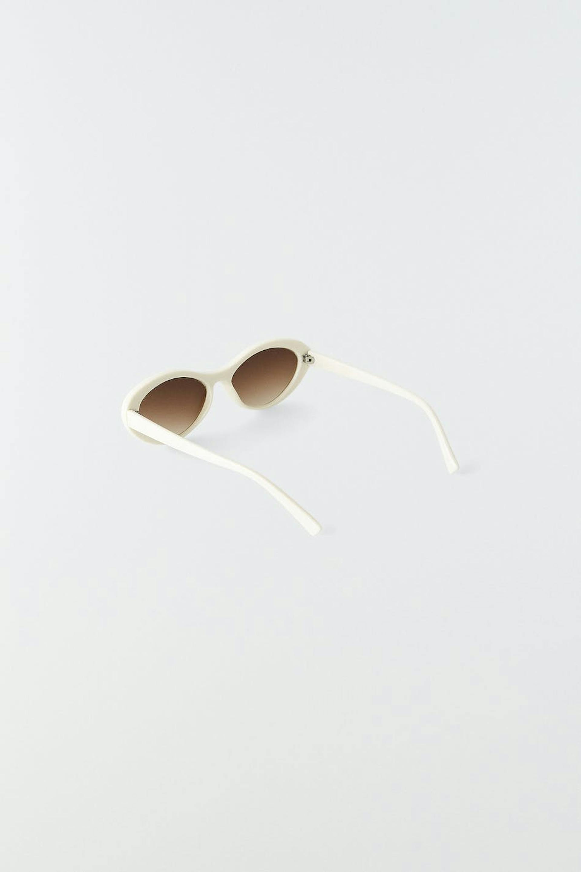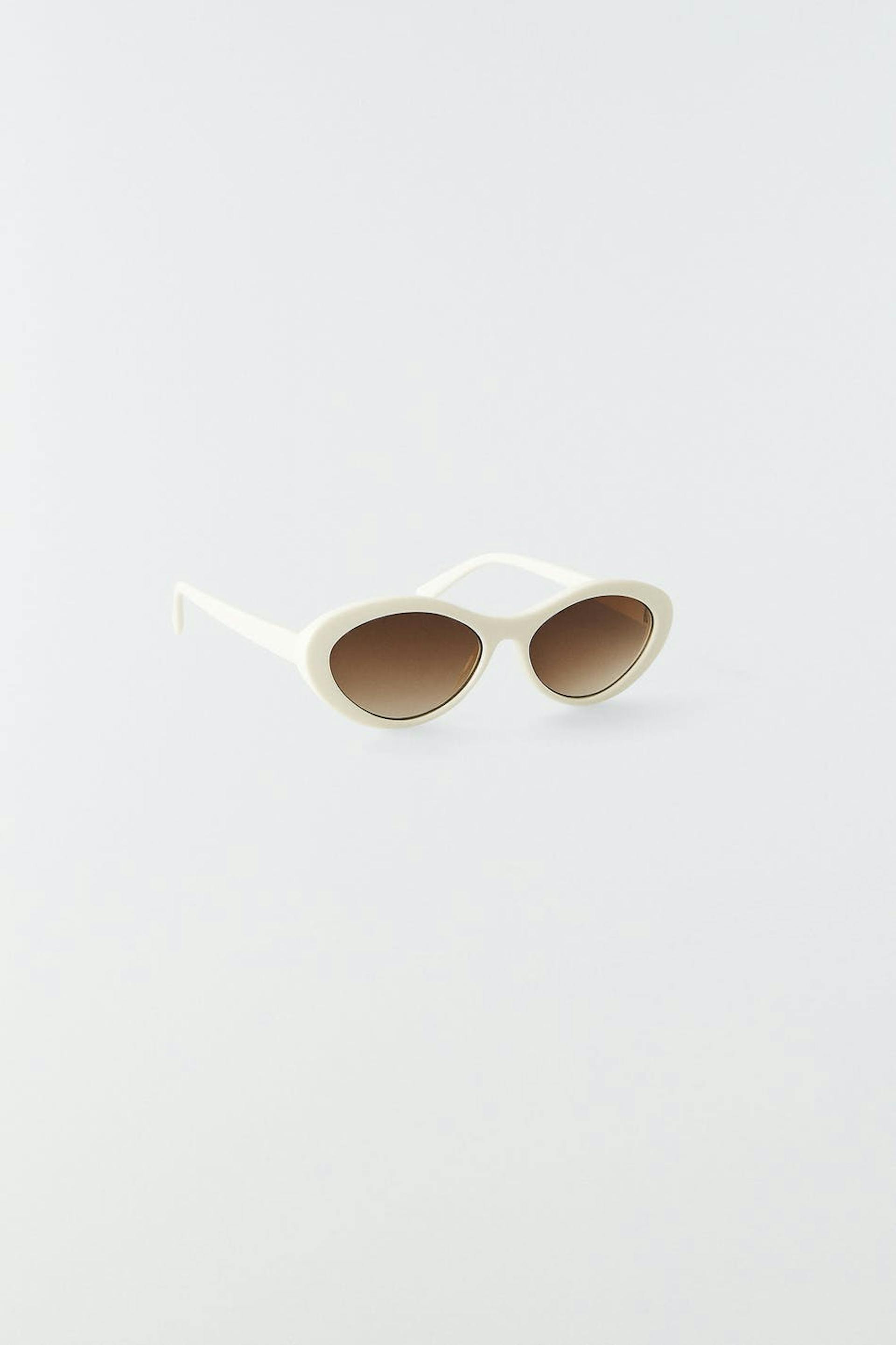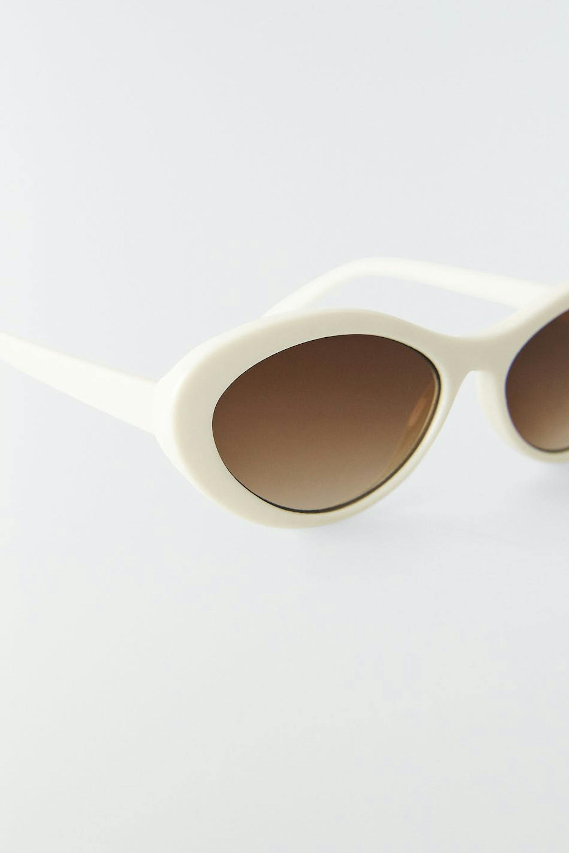 Sunglasses with frames in plastic. The sunglasses is white and has brown, tinted glasses.
