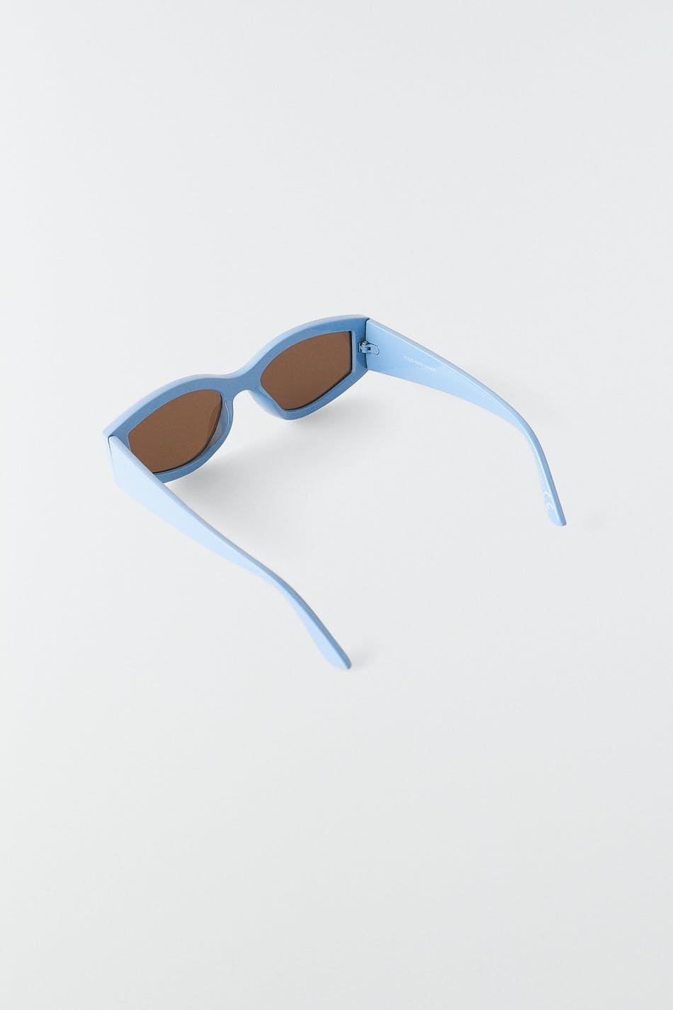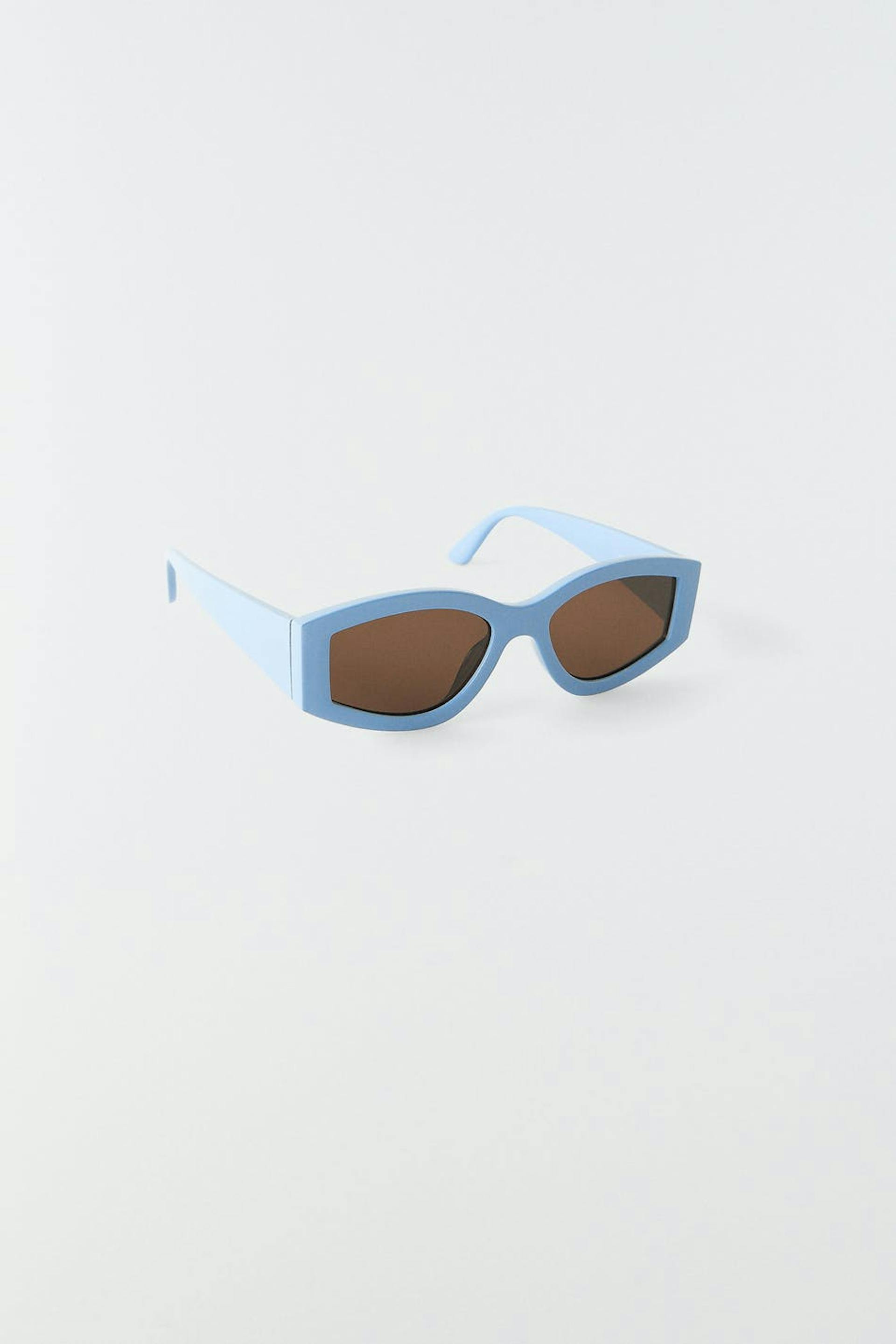 Sunglasses with a cat-eye design. The sunglasses is blue. It has a plastic frame.
