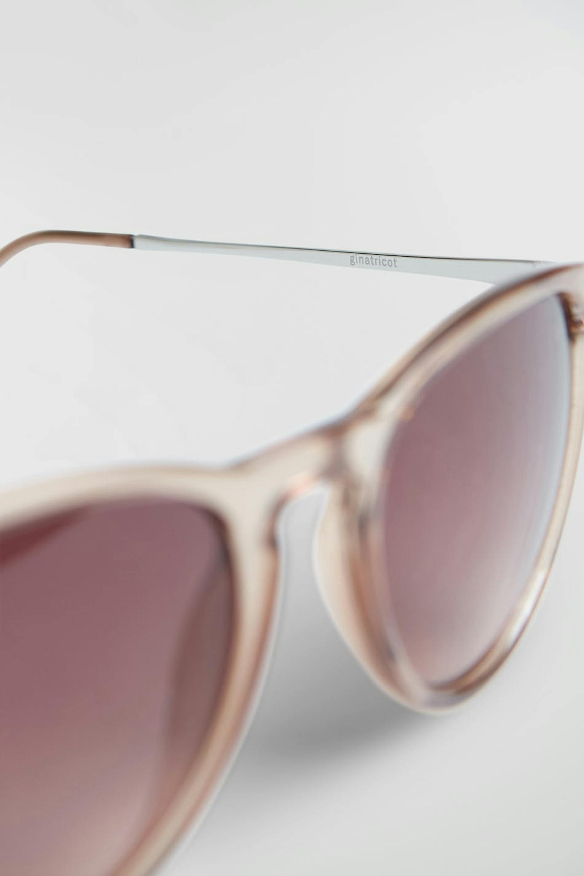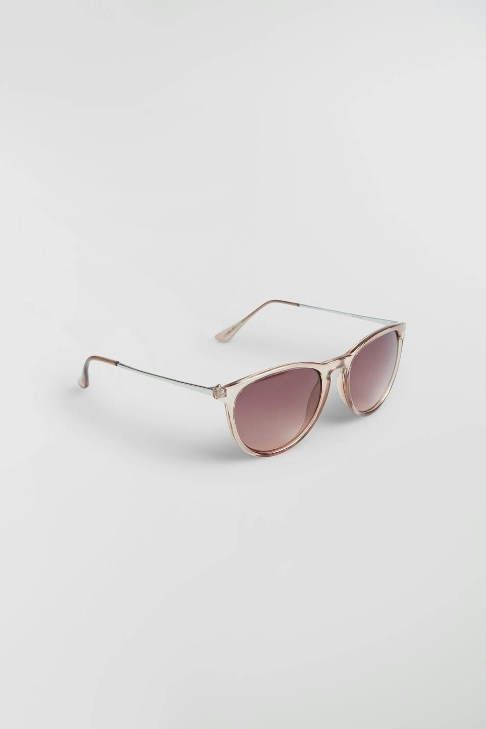 Sunglasses with a wayfarer frame design. The sunglasses is white.